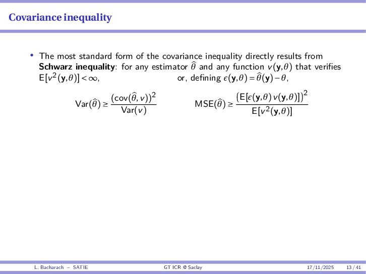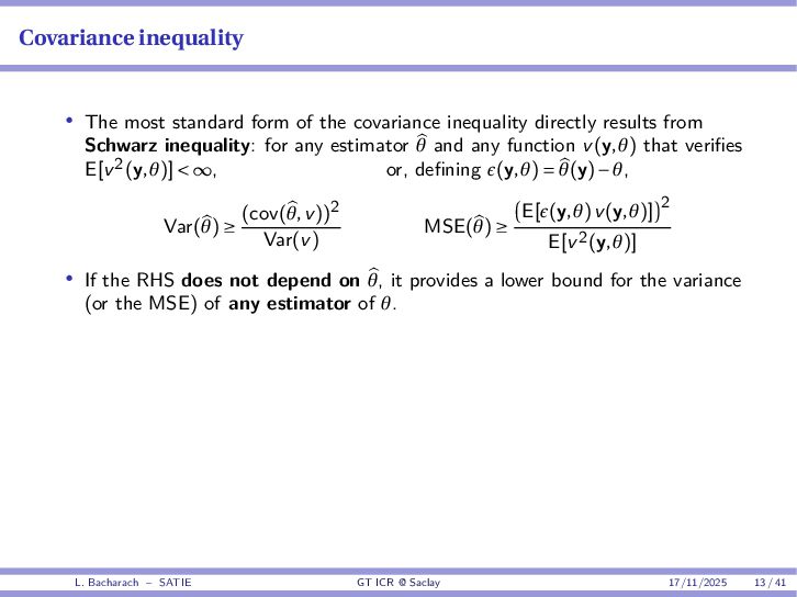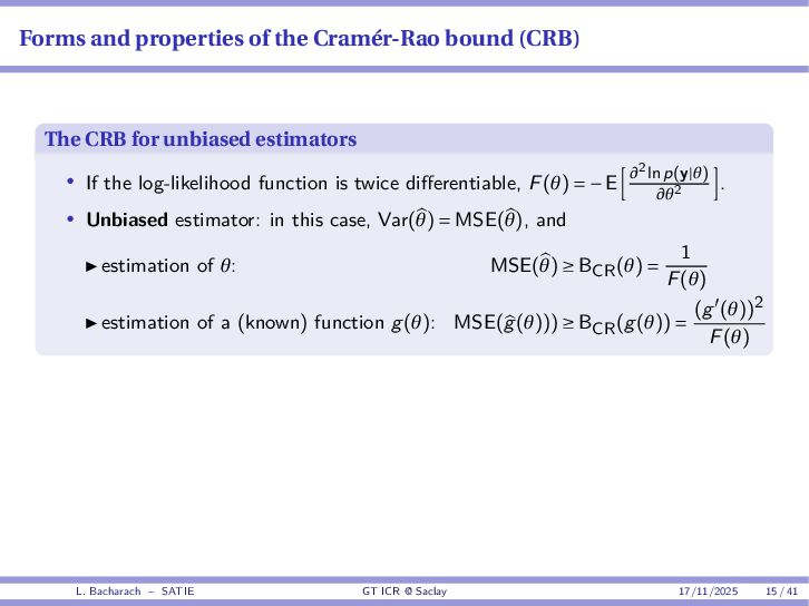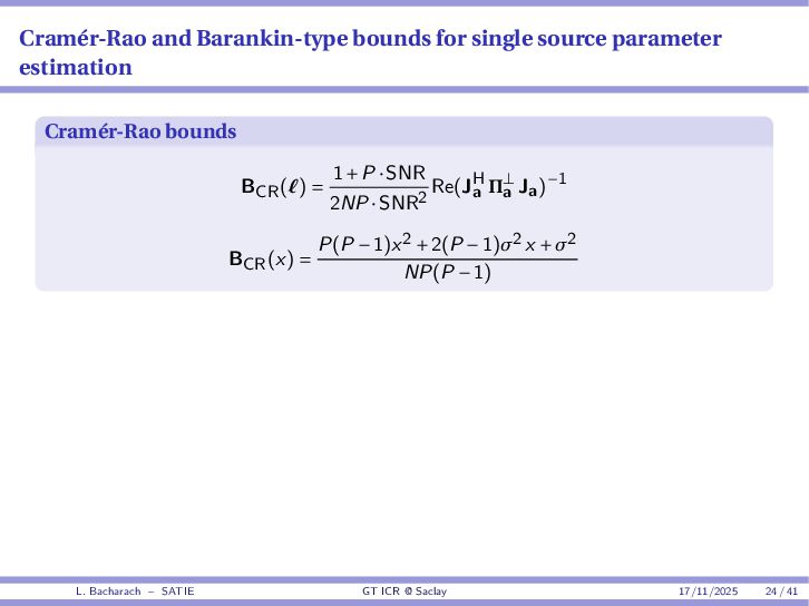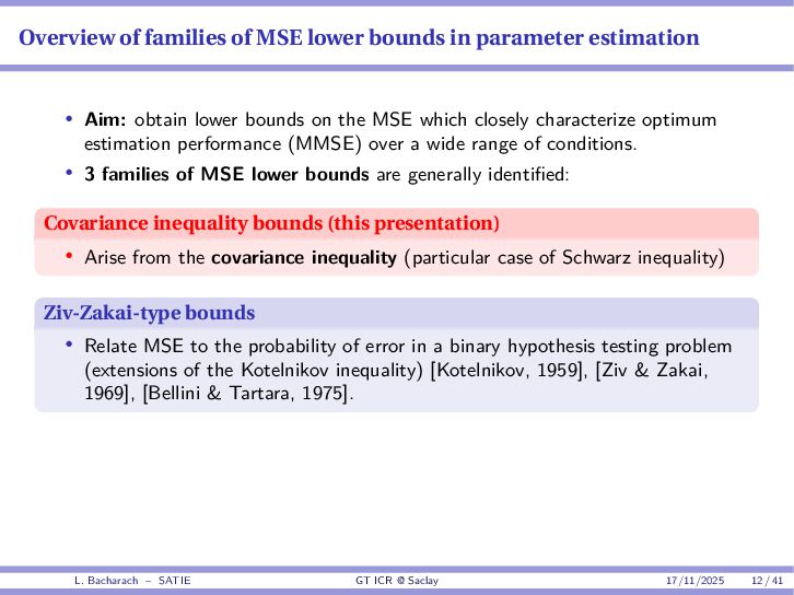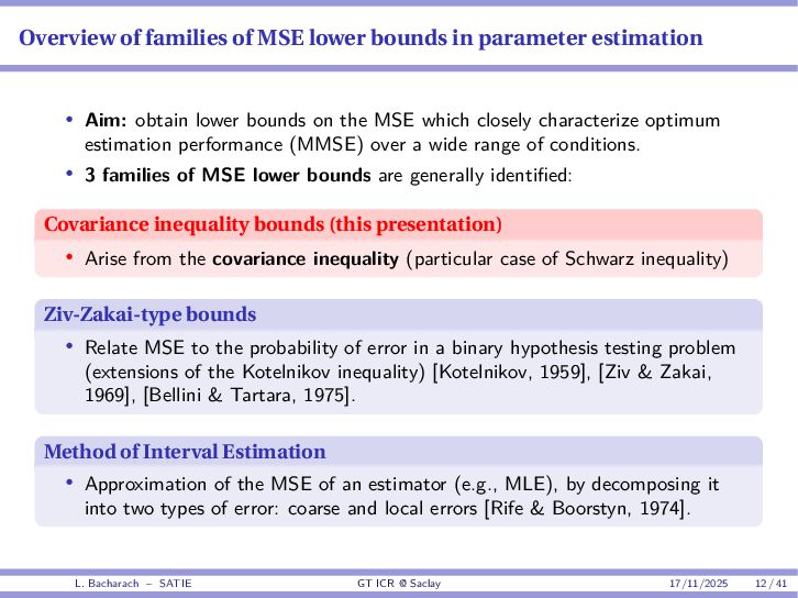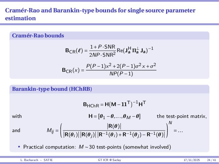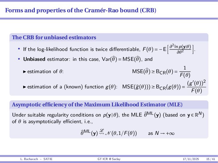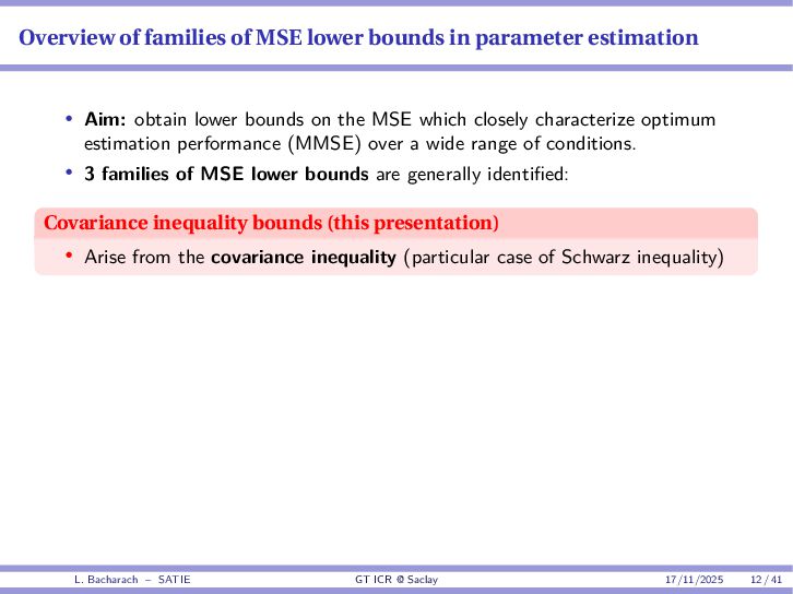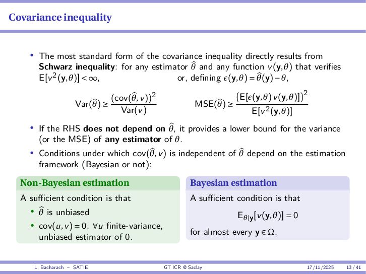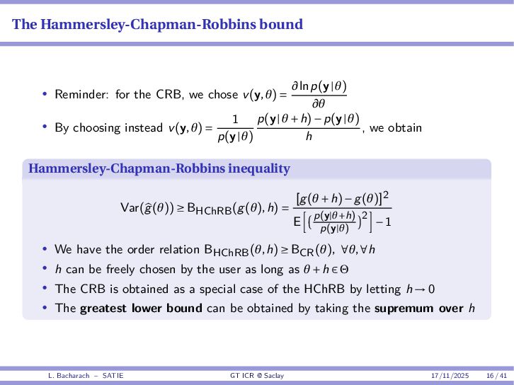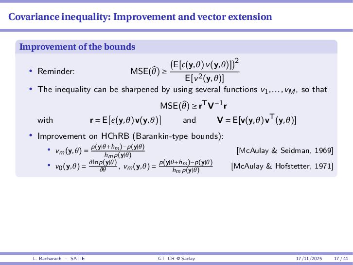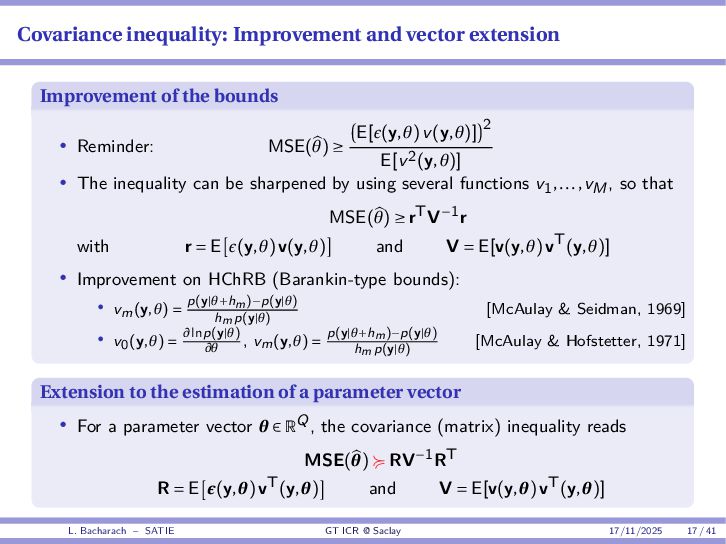 • Reminder: MSE(θ) ≥ E[ϵ(y,θ)v(y,θ)] 2 E[v2(y,θ)] • The inequality can be sharpened by using several functions v1,...,vM, so that MSE(θ) ≥ rTV−1r with r = E ϵ(y,θ)v(y,θ) and V = E[v(y,θ)vT(y,θ)] • Improvement on HChRB (Barankin-type bounds): • vm(y,θ) = p(y|θ+hm)−p(y|θ) hm p(y|θ) [McAulay & Seidman, 1969] • v0(y,θ) = ∂lnp(y|θ) ∂θ , vm(y,θ) = p(y|θ+hm)−p(y|θ) hm p(y|θ) [McAulay & Hofstetter, 1971] Extension to the estimation of a parameter vector • For a parameter vector θ ∈ RQ, the covariance (matrix) inequality reads MSE(θ) ≽ RV−1RT R = E ϵ(y,θ)vT(y,θ) and V = E[v(y,θ)vT(y,θ)] L. Bacharach – SATIE GT ICR @ Saclay 17/11/2025 17 / 41
