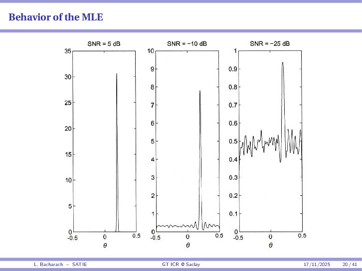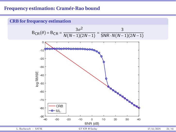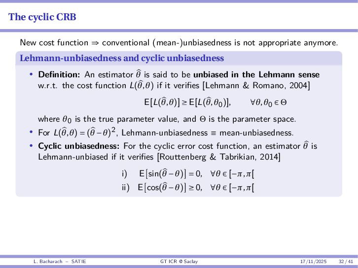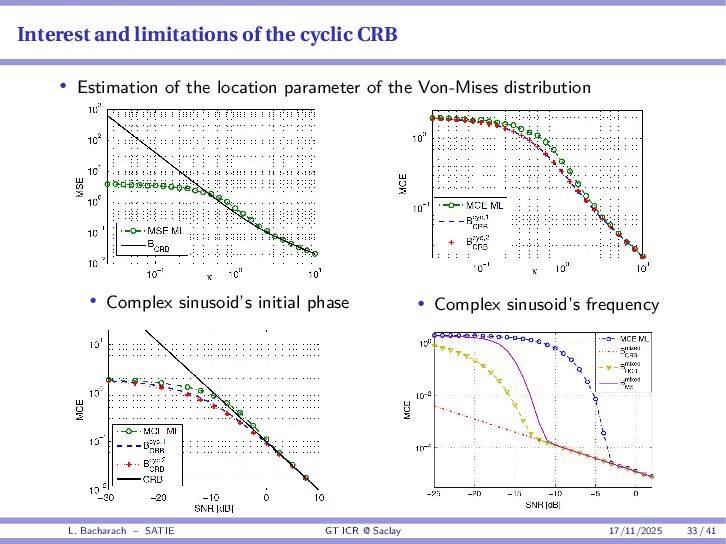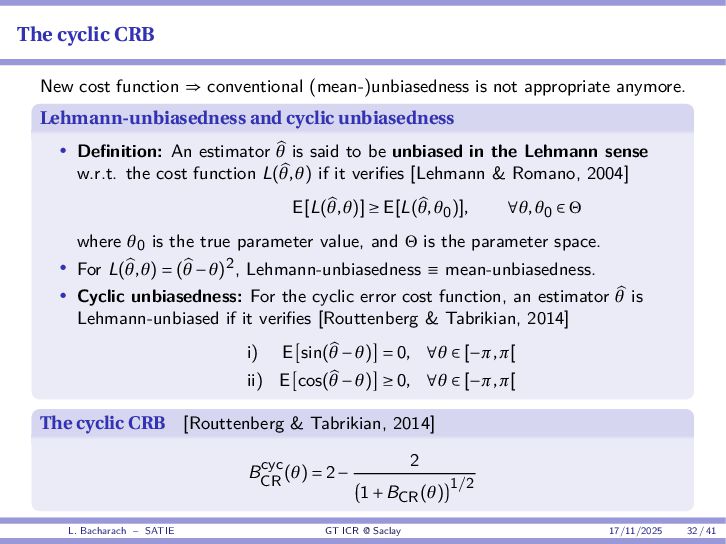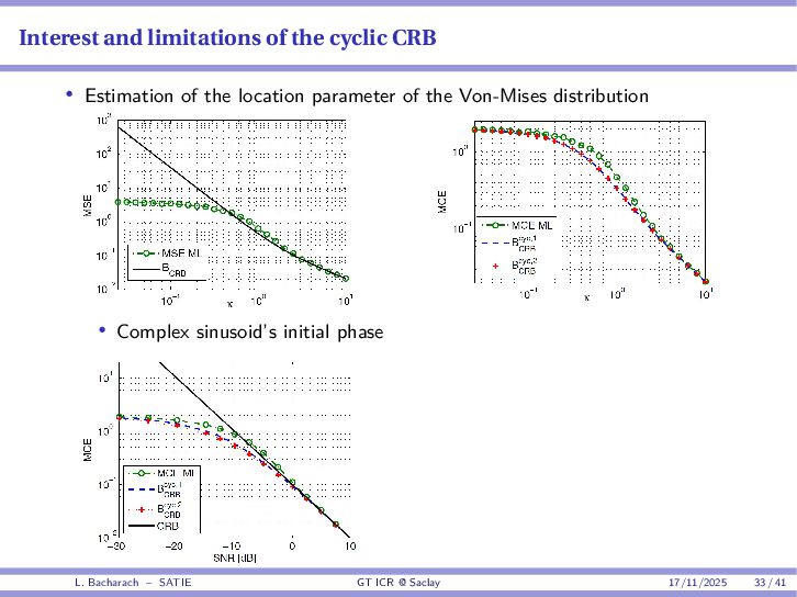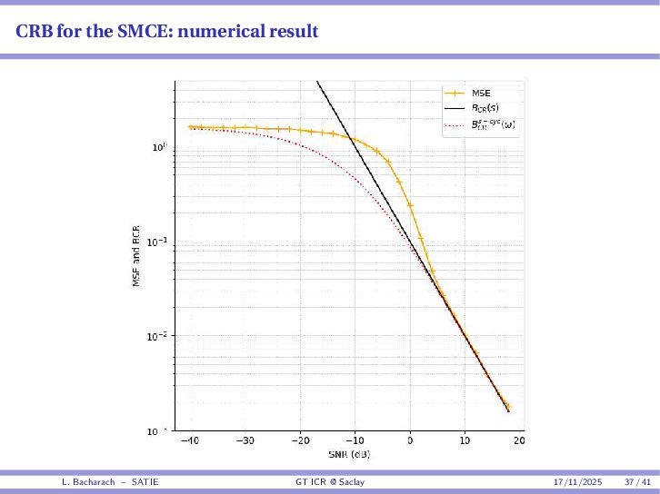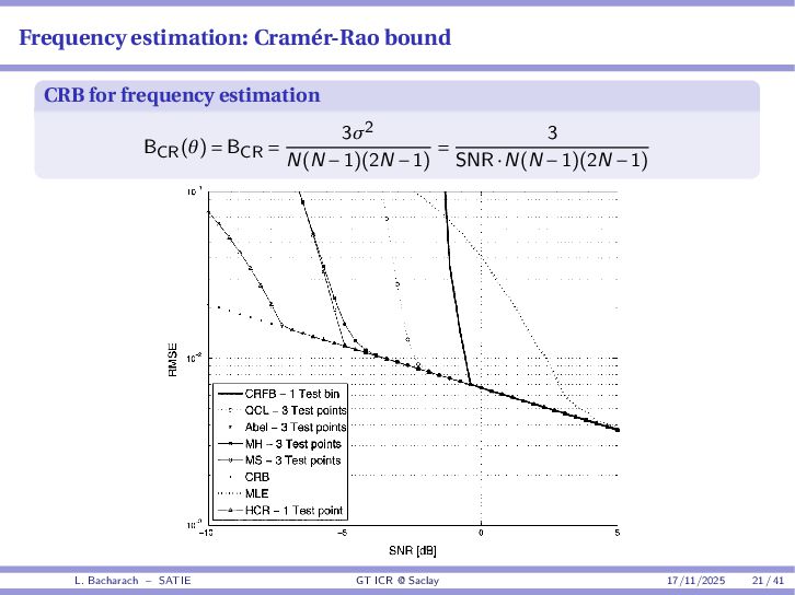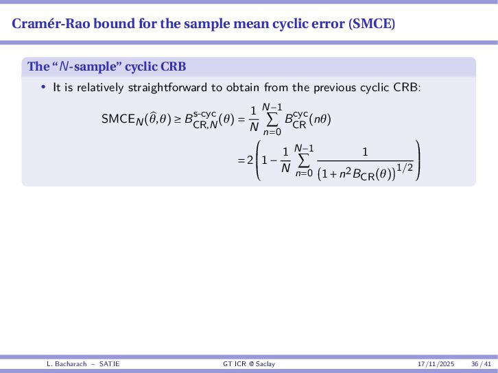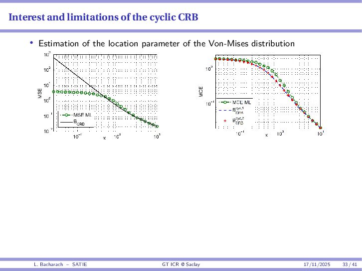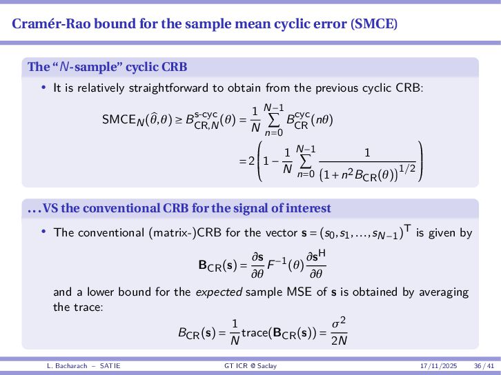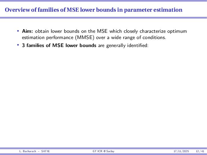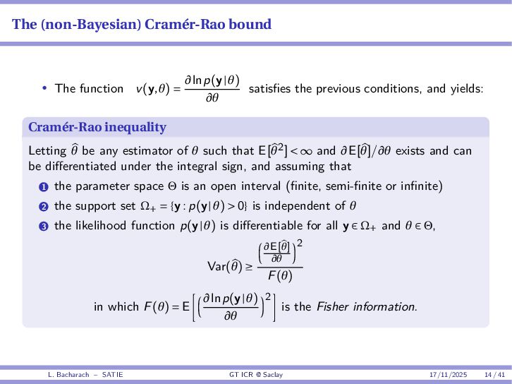 • Reminder: MSE(θ) ≥ E[ϵ(y,θ)v(y,θ)] 2 E[v2(y,θ)] • The inequality can be sharpened by using several functions v1,...,vM, so that MSE(θ) ≥ rTV−1r with r = E ϵ(y,θ)v(y,θ) and V = E[v(y,θ)vT(y,θ)] • Improvement on HChRB (Barankin-type bounds): • vm(y,θ) = p(y|θ+hm)−p(y|θ) hm p(y|θ) [McAulay & Seidman, 1969] • v0(y,θ) = ∂lnp(y|θ) ∂θ , vm(y,θ) = p(y|θ+hm)−p(y|θ) hm p(y|θ) [McAulay & Hofstetter, 1971] Extension to the estimation of a parameter vector • For a parameter vector θ ∈ RQ, the covariance (matrix) inequality reads MSE(θ) ≽ RV−1RT R = E ϵ(y,θ)vT(y,θ) and V = E[v(y,θ)vT(y,θ)] L. Bacharach – SATIE GT ICR @ Saclay 17/11/2025 17 / 41
