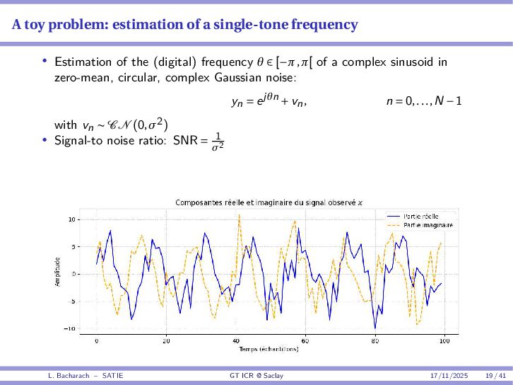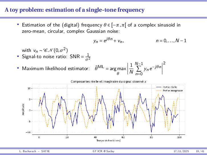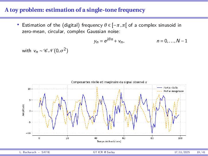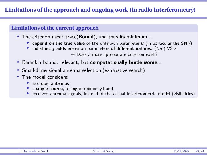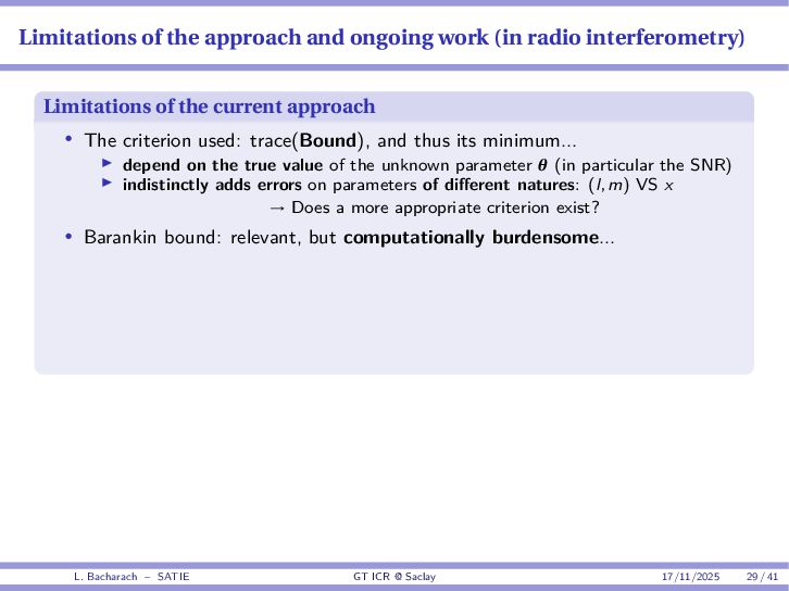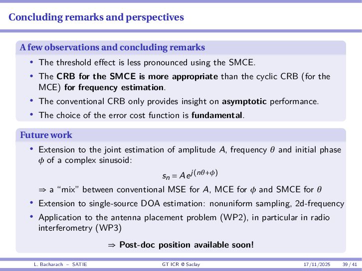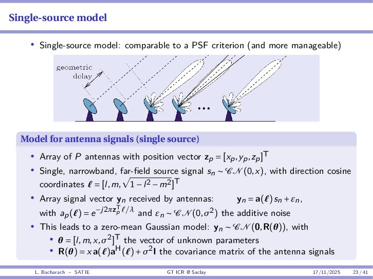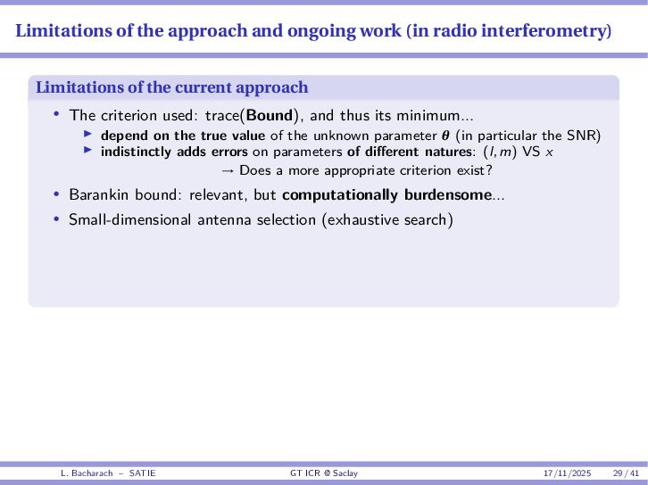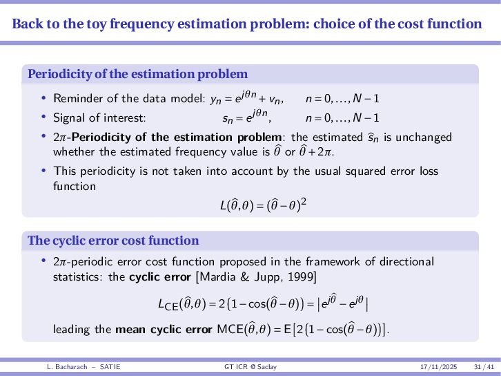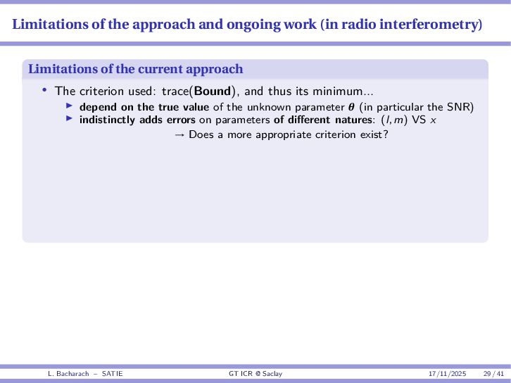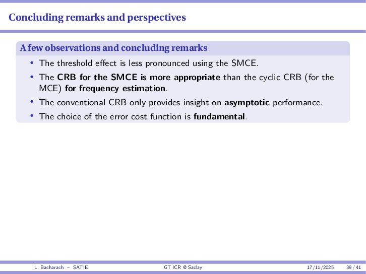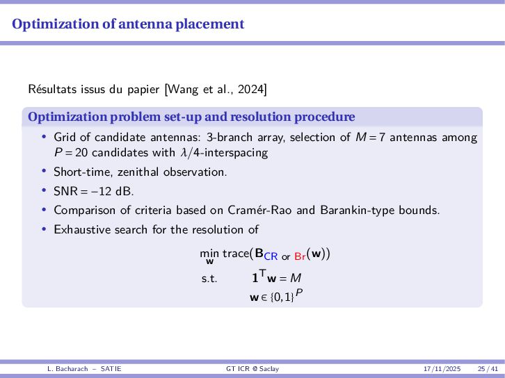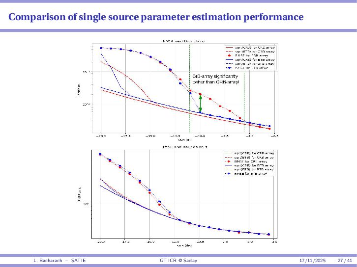 • Reminder: MSE(θ) ≥ E[ϵ(y,θ)v(y,θ)] 2 E[v2(y,θ)] • The inequality can be sharpened by using several functions v1,...,vM, so that MSE(θ) ≥ rTV−1r with r = E ϵ(y,θ)v(y,θ) and V = E[v(y,θ)vT(y,θ)] • Improvement on HChRB (Barankin-type bounds): • vm(y,θ) = p(y|θ+hm)−p(y|θ) hm p(y|θ) [McAulay & Seidman, 1969] • v0(y,θ) = ∂lnp(y|θ) ∂θ , vm(y,θ) = p(y|θ+hm)−p(y|θ) hm p(y|θ) [McAulay & Hofstetter, 1971] Extension to the estimation of a parameter vector • For a parameter vector θ ∈ RQ, the covariance (matrix) inequality reads MSE(θ) ≽ RV−1RT R = E ϵ(y,θ)vT(y,θ) and V = E[v(y,θ)vT(y,θ)] L. Bacharach – SATIE GT ICR @ Saclay 17/11/2025 17 / 41