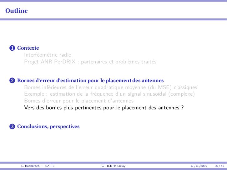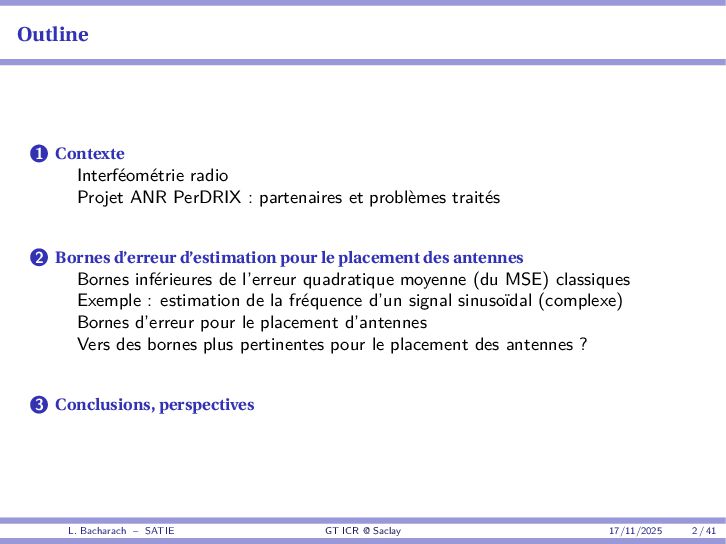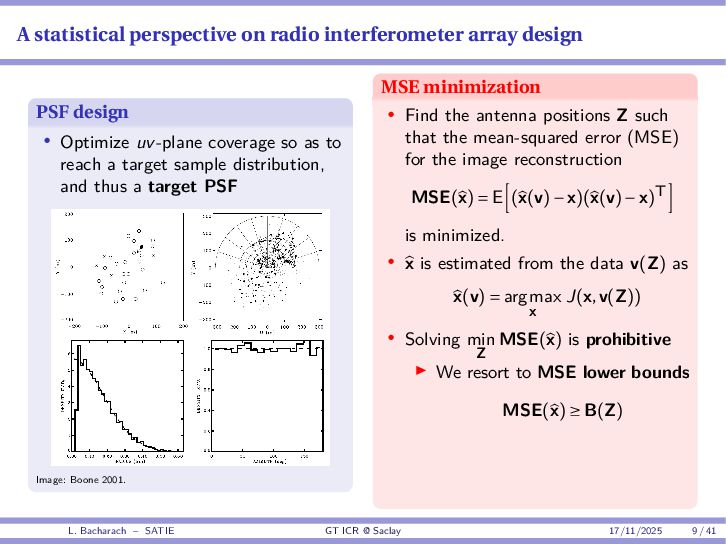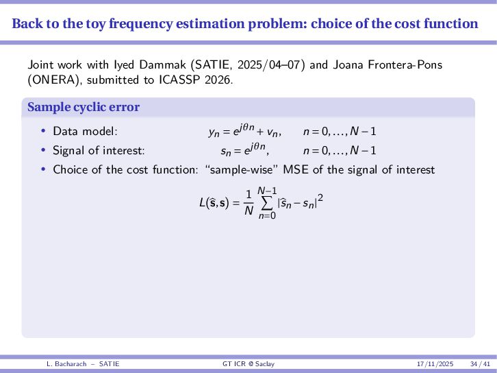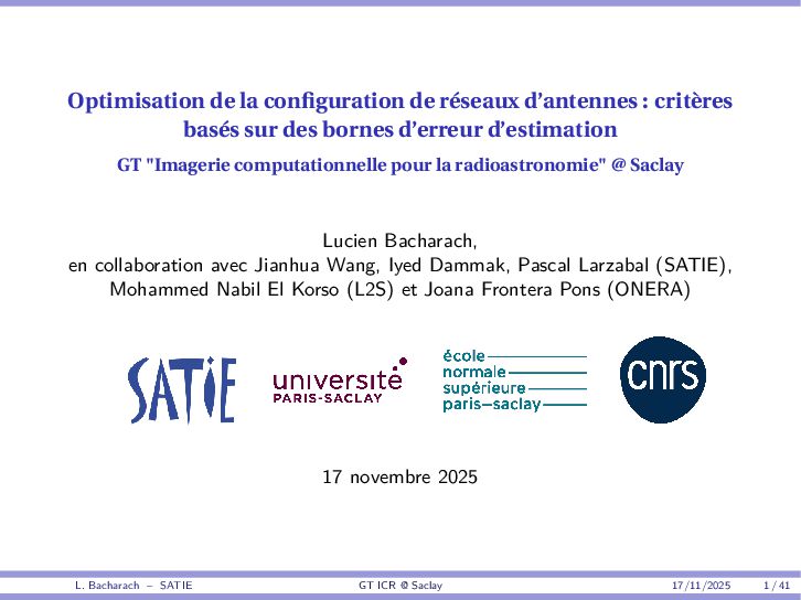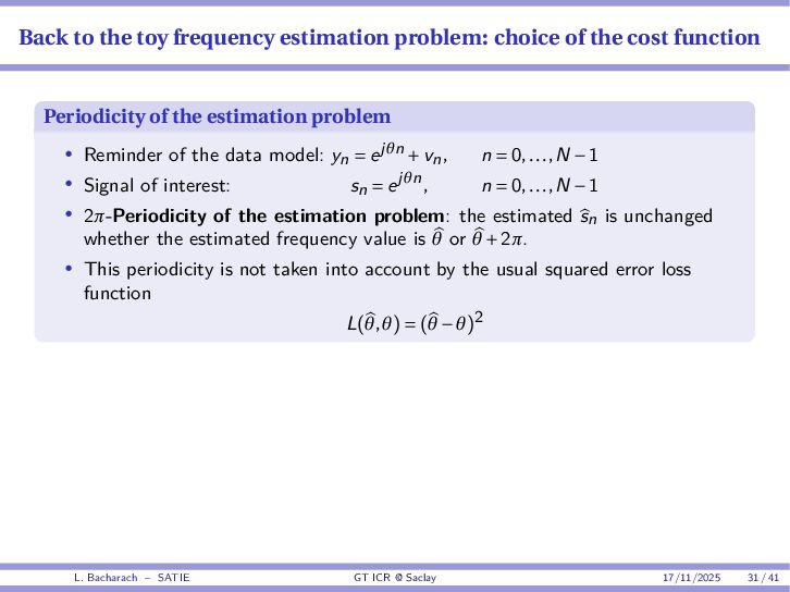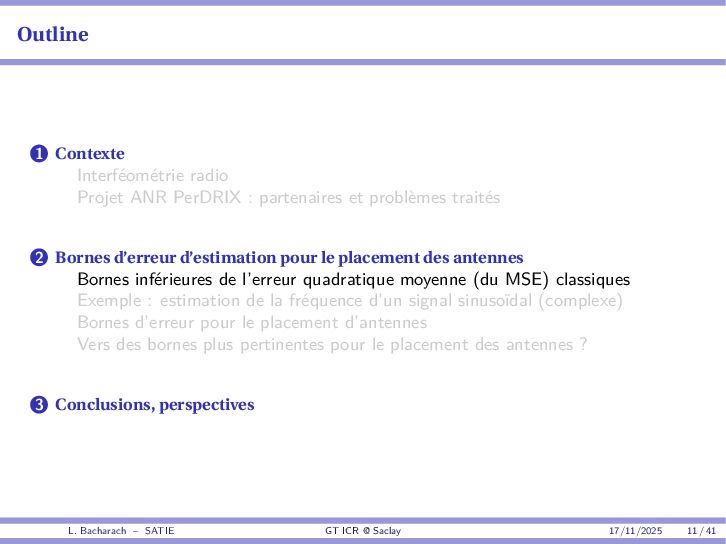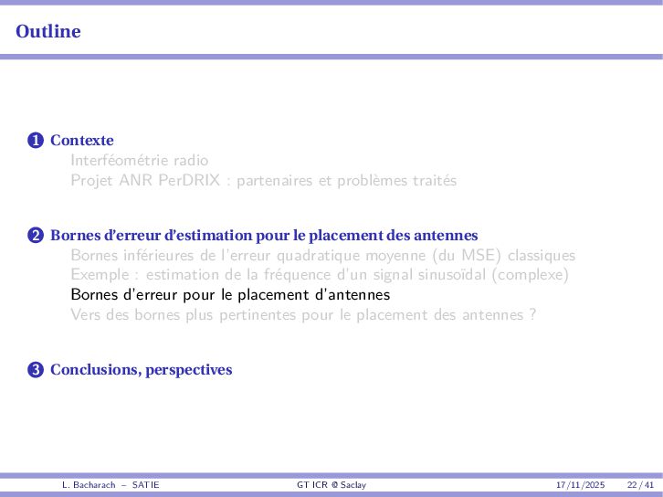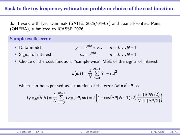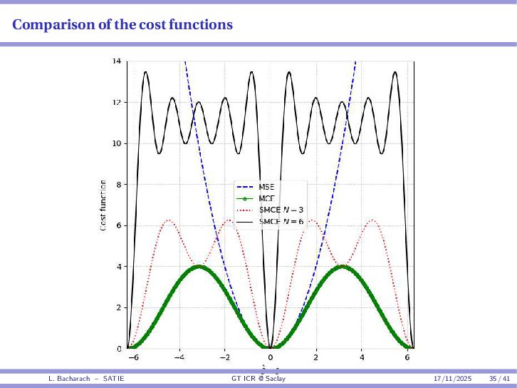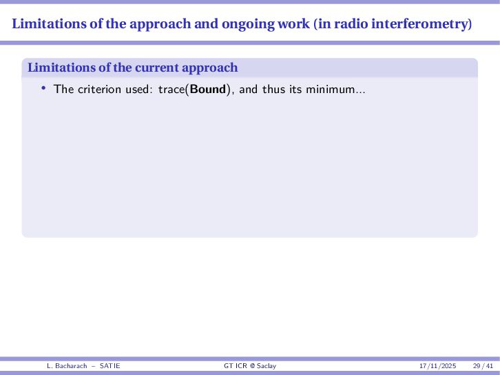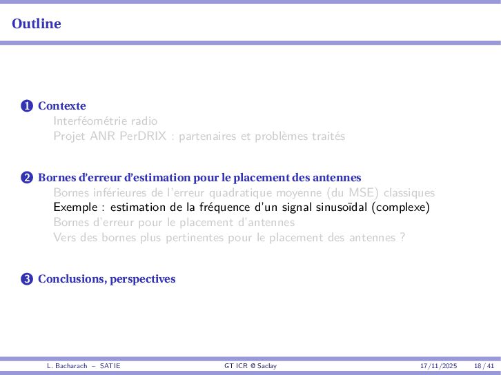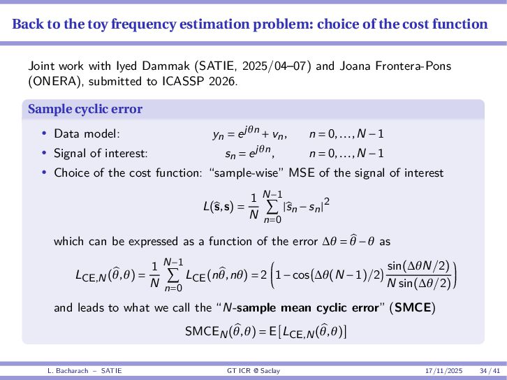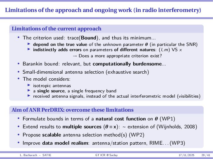 • Reminder: MSE(θ) ≥ E[ϵ(y,θ)v(y,θ)] 2 E[v2(y,θ)] • The inequality can be sharpened by using several functions v1,...,vM, so that MSE(θ) ≥ rTV−1r with r = E ϵ(y,θ)v(y,θ) and V = E[v(y,θ)vT(y,θ)] • Improvement on HChRB (Barankin-type bounds): • vm(y,θ) = p(y|θ+hm)−p(y|θ) hm p(y|θ) [McAulay & Seidman, 1969] • v0(y,θ) = ∂lnp(y|θ) ∂θ , vm(y,θ) = p(y|θ+hm)−p(y|θ) hm p(y|θ) [McAulay & Hofstetter, 1971] Extension to the estimation of a parameter vector • For a parameter vector θ ∈ RQ, the covariance (matrix) inequality reads MSE(θ) ≽ RV−1RT R = E ϵ(y,θ)vT(y,θ) and V = E[v(y,θ)vT(y,θ)] L. Bacharach – SATIE GT ICR @ Saclay 17/11/2025 17 / 41