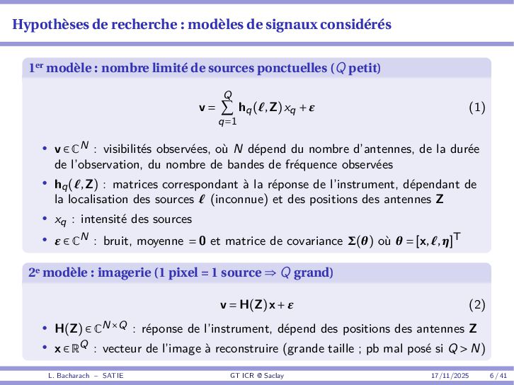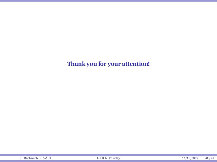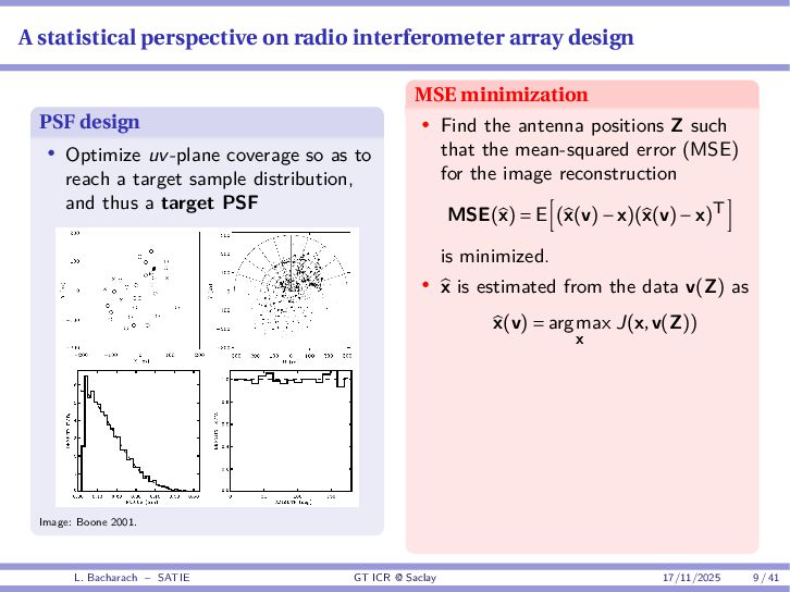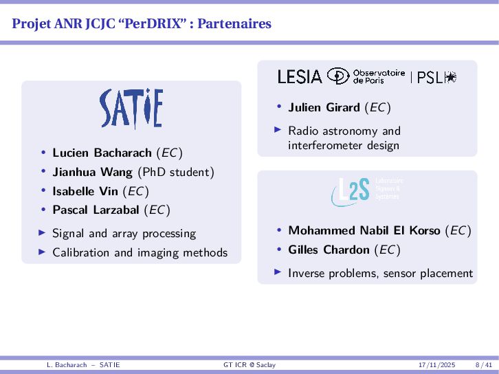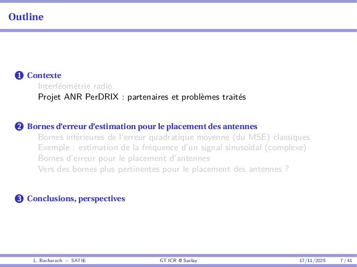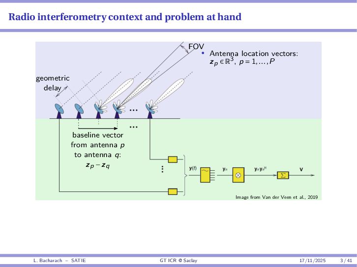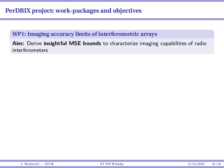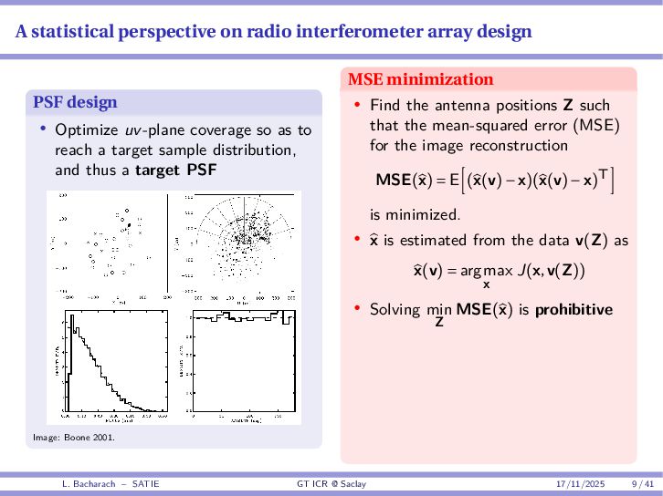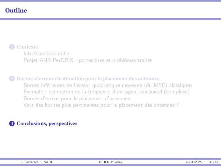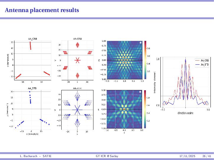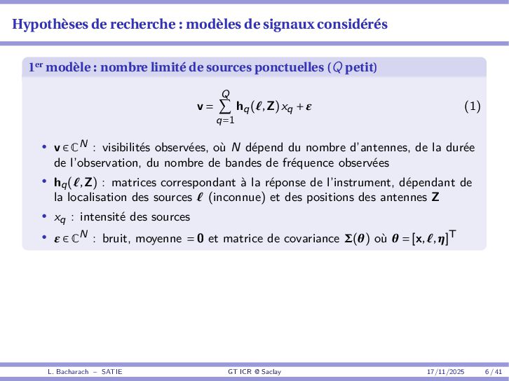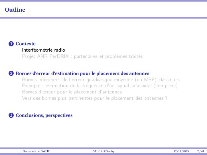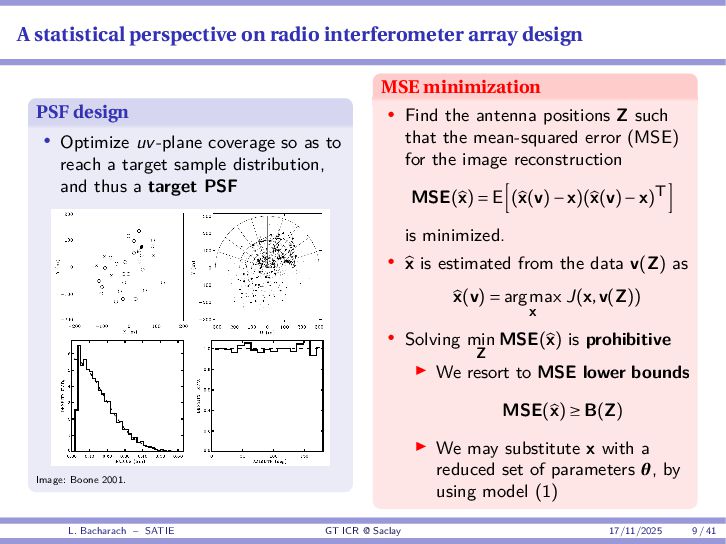 • Reminder: MSE(θ) ≥ E[ϵ(y,θ)v(y,θ)] 2 E[v2(y,θ)] • The inequality can be sharpened by using several functions v1,...,vM, so that MSE(θ) ≥ rTV−1r with r = E ϵ(y,θ)v(y,θ) and V = E[v(y,θ)vT(y,θ)] • Improvement on HChRB (Barankin-type bounds): • vm(y,θ) = p(y|θ+hm)−p(y|θ) hm p(y|θ) [McAulay & Seidman, 1969] • v0(y,θ) = ∂lnp(y|θ) ∂θ , vm(y,θ) = p(y|θ+hm)−p(y|θ) hm p(y|θ) [McAulay & Hofstetter, 1971] Extension to the estimation of a parameter vector • For a parameter vector θ ∈ RQ, the covariance (matrix) inequality reads MSE(θ) ≽ RV−1RT R = E ϵ(y,θ)vT(y,θ) and V = E[v(y,θ)vT(y,θ)] L. Bacharach – SATIE GT ICR @ Saclay 17/11/2025 17 / 41