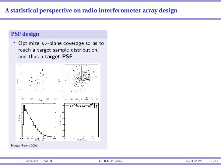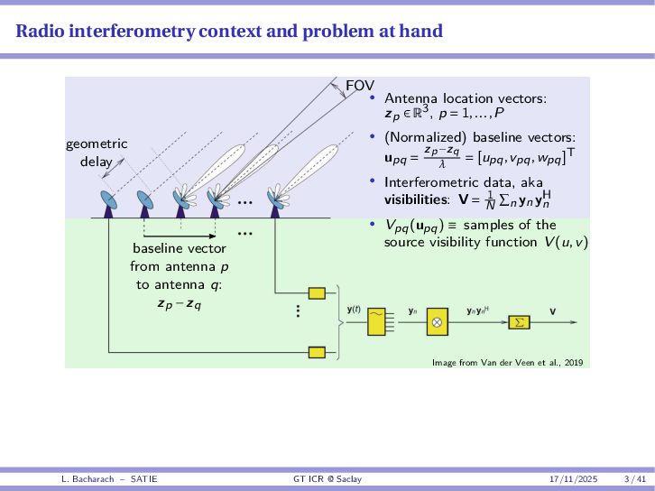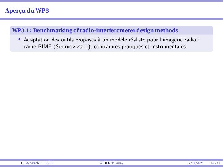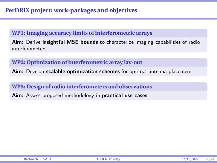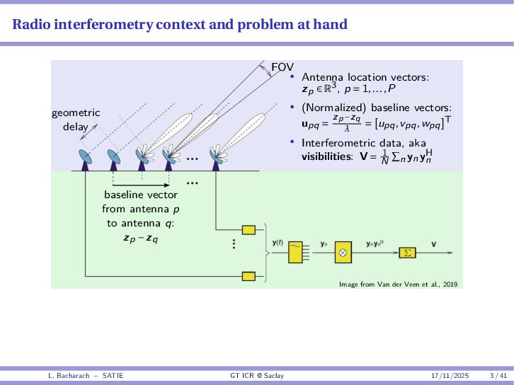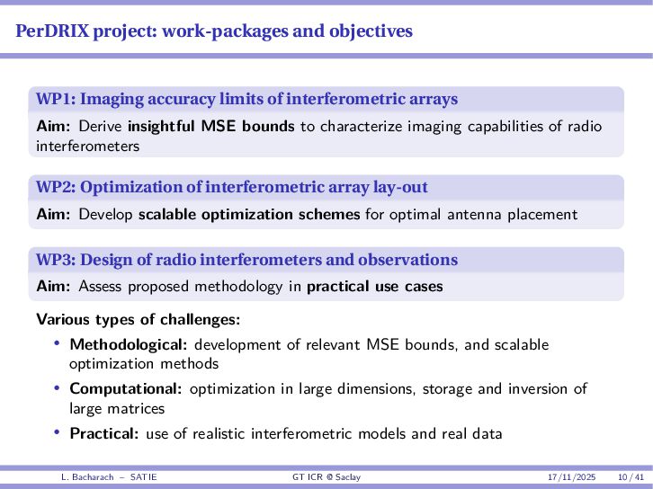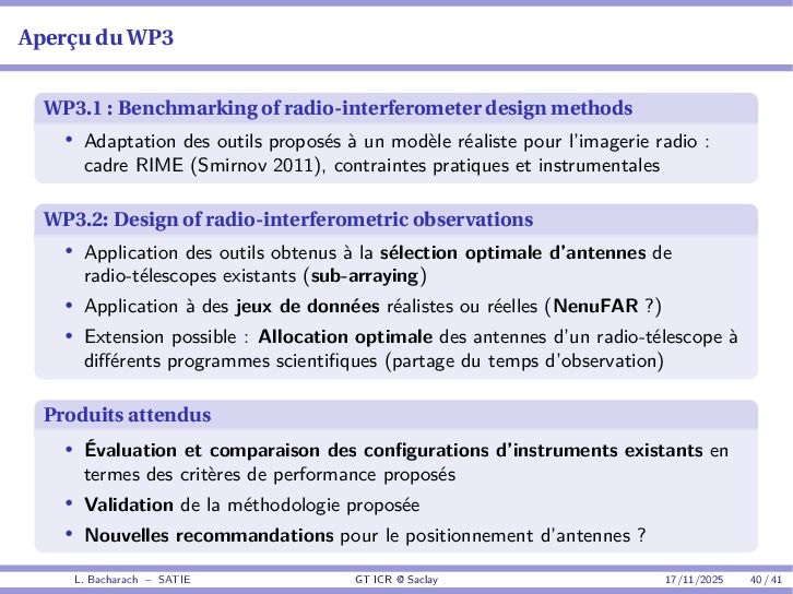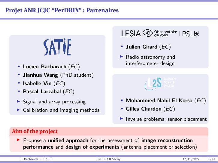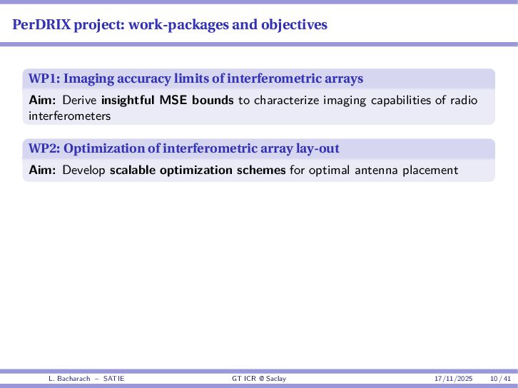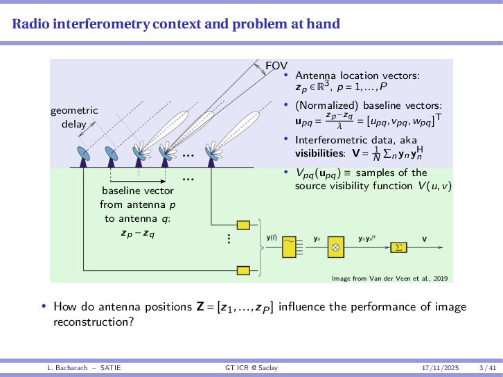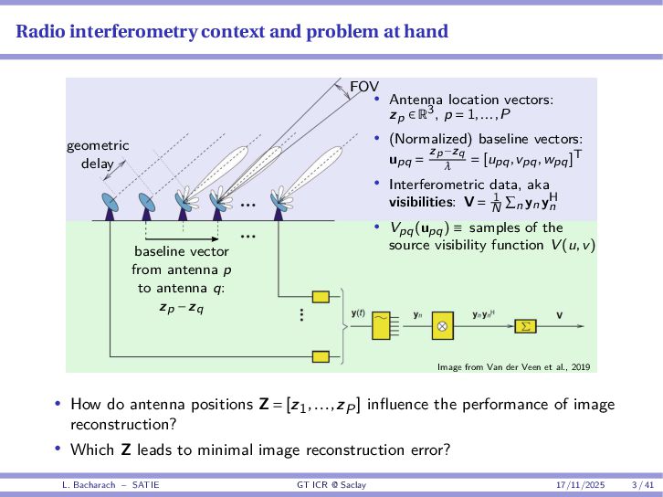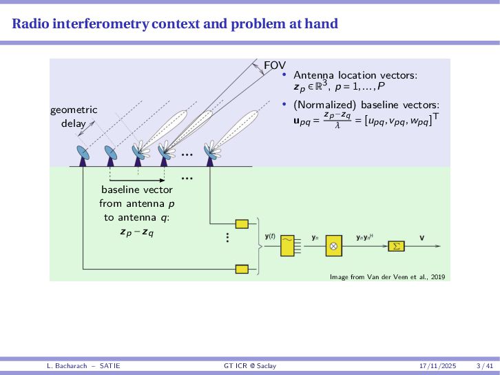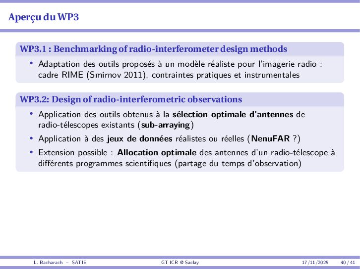 • Reminder: MSE(θ) ≥ E[ϵ(y,θ)v(y,θ)] 2 E[v2(y,θ)] • The inequality can be sharpened by using several functions v1,...,vM, so that MSE(θ) ≥ rTV−1r with r = E ϵ(y,θ)v(y,θ) and V = E[v(y,θ)vT(y,θ)] • Improvement on HChRB (Barankin-type bounds): • vm(y,θ) = p(y|θ+hm)−p(y|θ) hm p(y|θ) [McAulay & Seidman, 1969] • v0(y,θ) = ∂lnp(y|θ) ∂θ , vm(y,θ) = p(y|θ+hm)−p(y|θ) hm p(y|θ) [McAulay & Hofstetter, 1971] Extension to the estimation of a parameter vector • For a parameter vector θ ∈ RQ, the covariance (matrix) inequality reads MSE(θ) ≽ RV−1RT R = E ϵ(y,θ)vT(y,θ) and V = E[v(y,θ)vT(y,θ)] L. Bacharach – SATIE GT ICR @ Saclay 17/11/2025 17 / 41