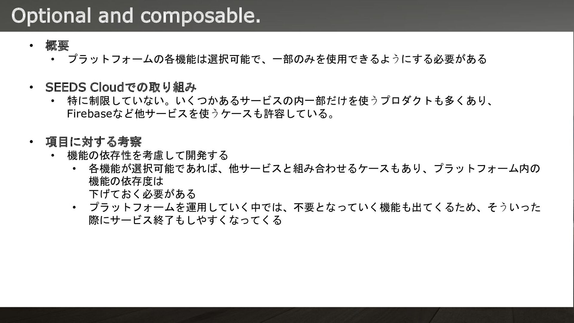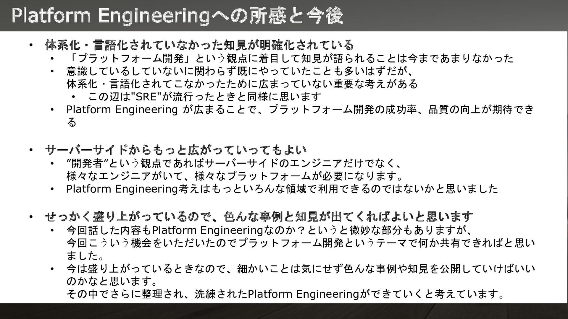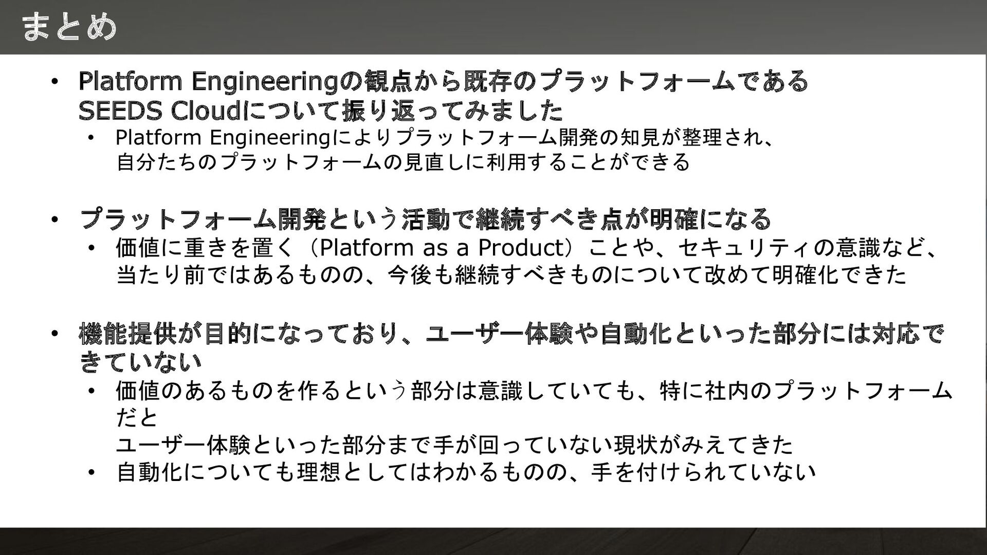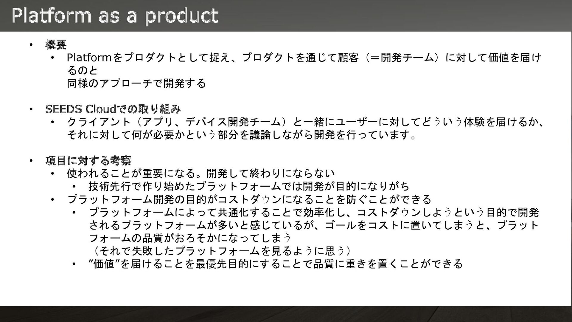 Cloudは残せているか • Platform Engineeringの観点から振り返る • SEEDS Cloudの開発をはじめたのは4年前なので、当時はPlatform Engineeringという言葉は聞 かなかった • 結果論ですが、Platform Engineeringで語られるプラクティスに照らし合わせて、 SEEDS Cloudがうまくいっている要因やそれぞれの意味について考えていきたいと思います • CNCF Platforms White Paper • https://tag-app-delivery.cncf.io/whitepapers/platforms/ • 基本的にはこちらの”Attributes of platforms”をベースに振り返っていきたいと思います。 • Platform as a product/User experience/Documentation and onboarding/Self-service Reduced cognitive load for users/Optional and composable/Secure by default