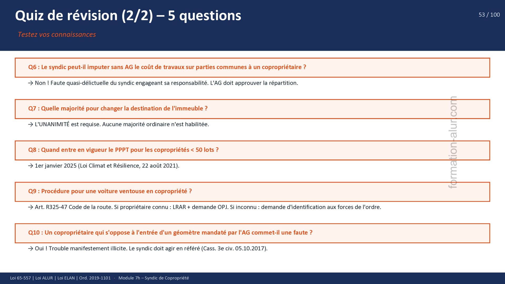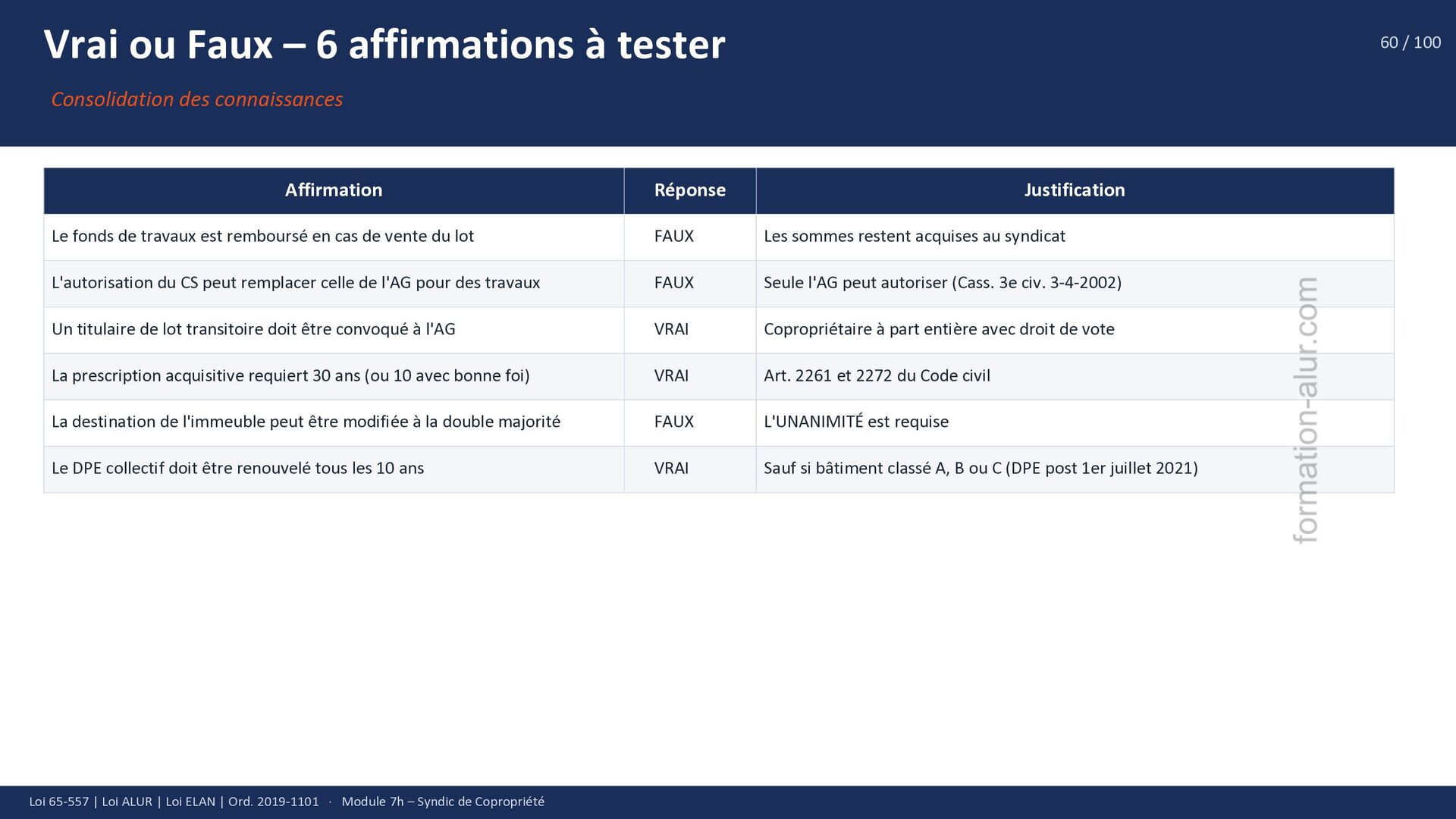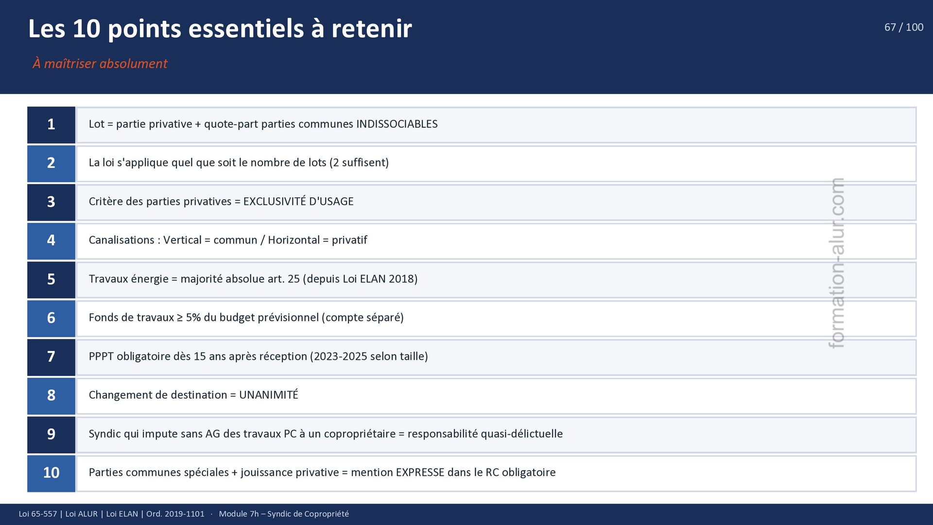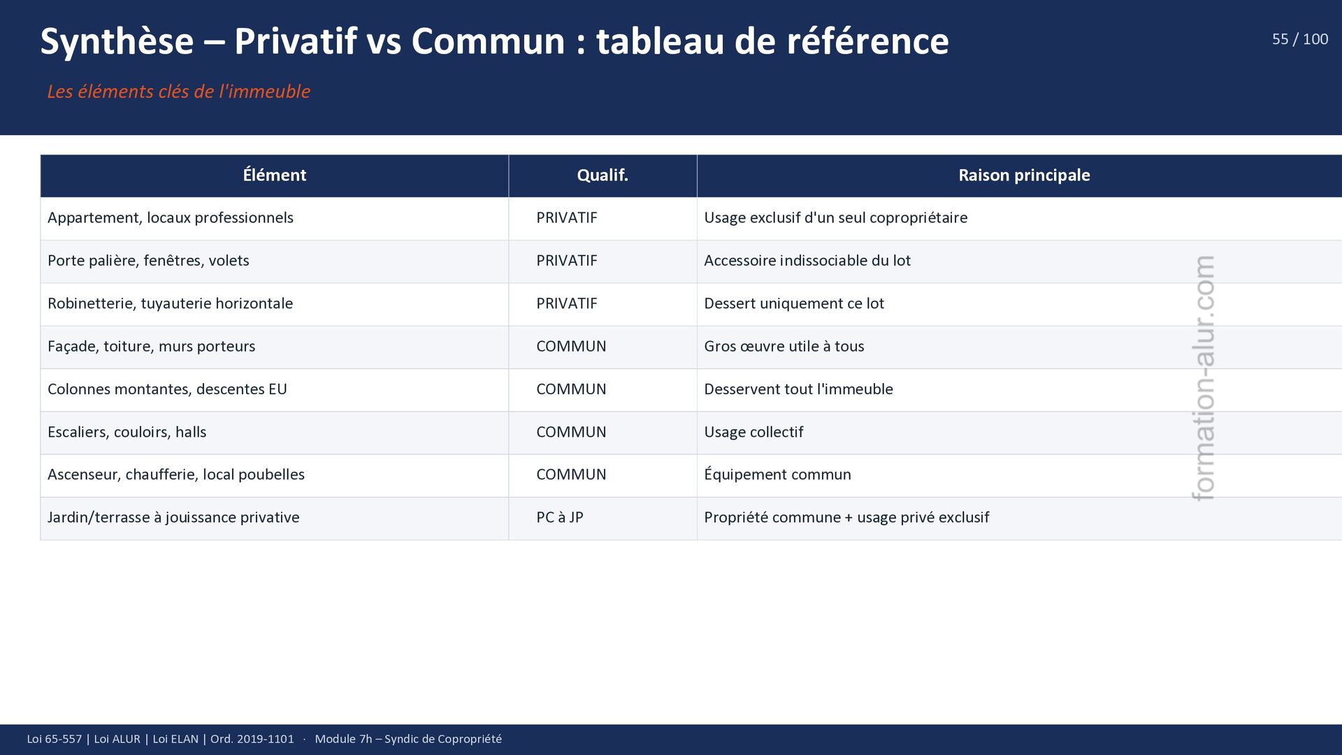 éléments clés de l'immeuble 55 / 100 Loi 65-557 | Loi ALUR | Loi ELAN | Ord. 2019-1101 · Module 7h – Syndic de Copropriété Élément Qualif. Raison principale Appartement, locaux professionnels 🔒 PRIVATIF Usage exclusif d'un seul copropriétaire Porte palière, fenêtres, volets 🔒 PRIVATIF Accessoire indissociable du lot Robinetterie, tuyauterie horizontale 🔒 PRIVATIF Dessert uniquement ce lot Façade, toiture, murs porteurs 🏛 COMMUN Gros œuvre utile à tous Colonnes montantes, descentes EU 🏛 COMMUN Desservent tout l'immeuble Escaliers, couloirs, halls 🏛 COMMUN Usage collectif Ascenseur, chaufferie, local poubelles 🏛 COMMUN Équipement commun Jardin/terrasse à jouissance privative ⚠️ PC à JP Propriété commune + usage privé exclusif