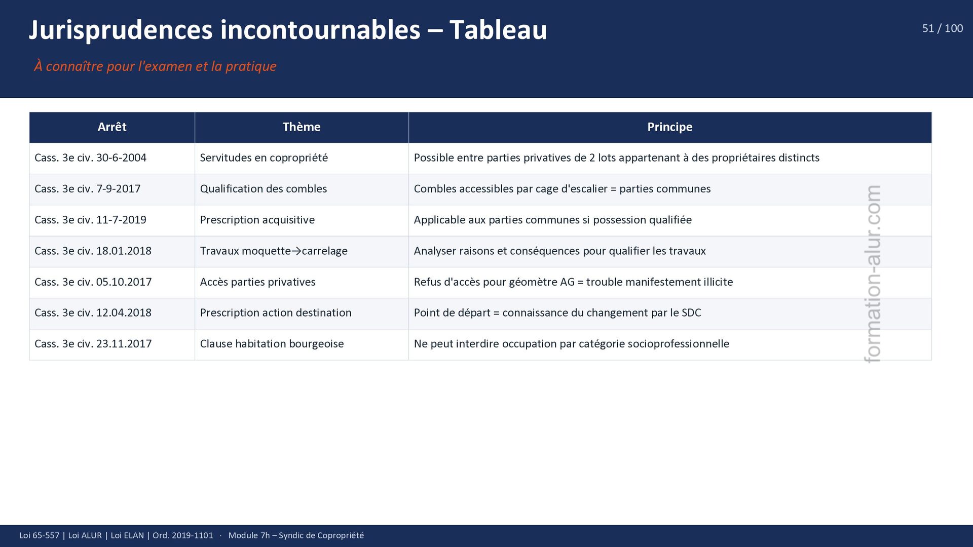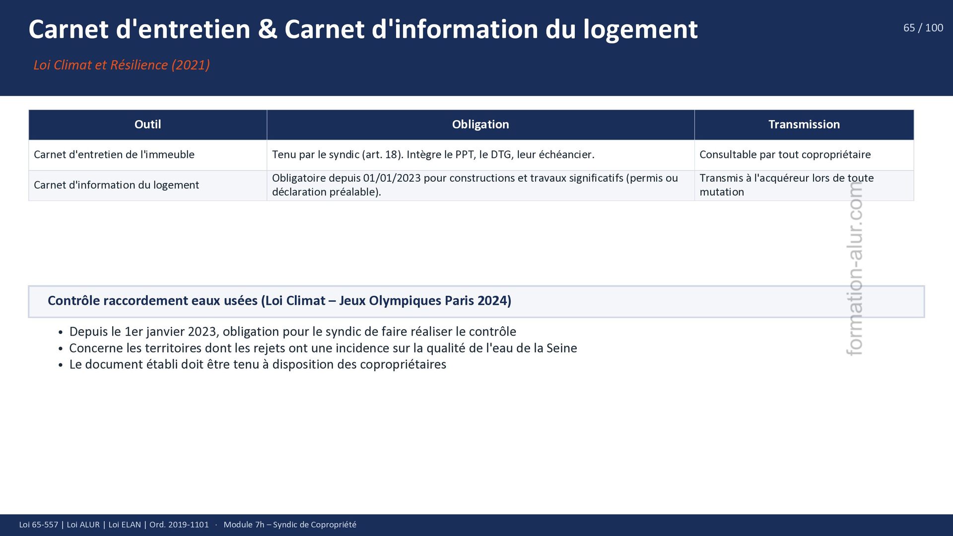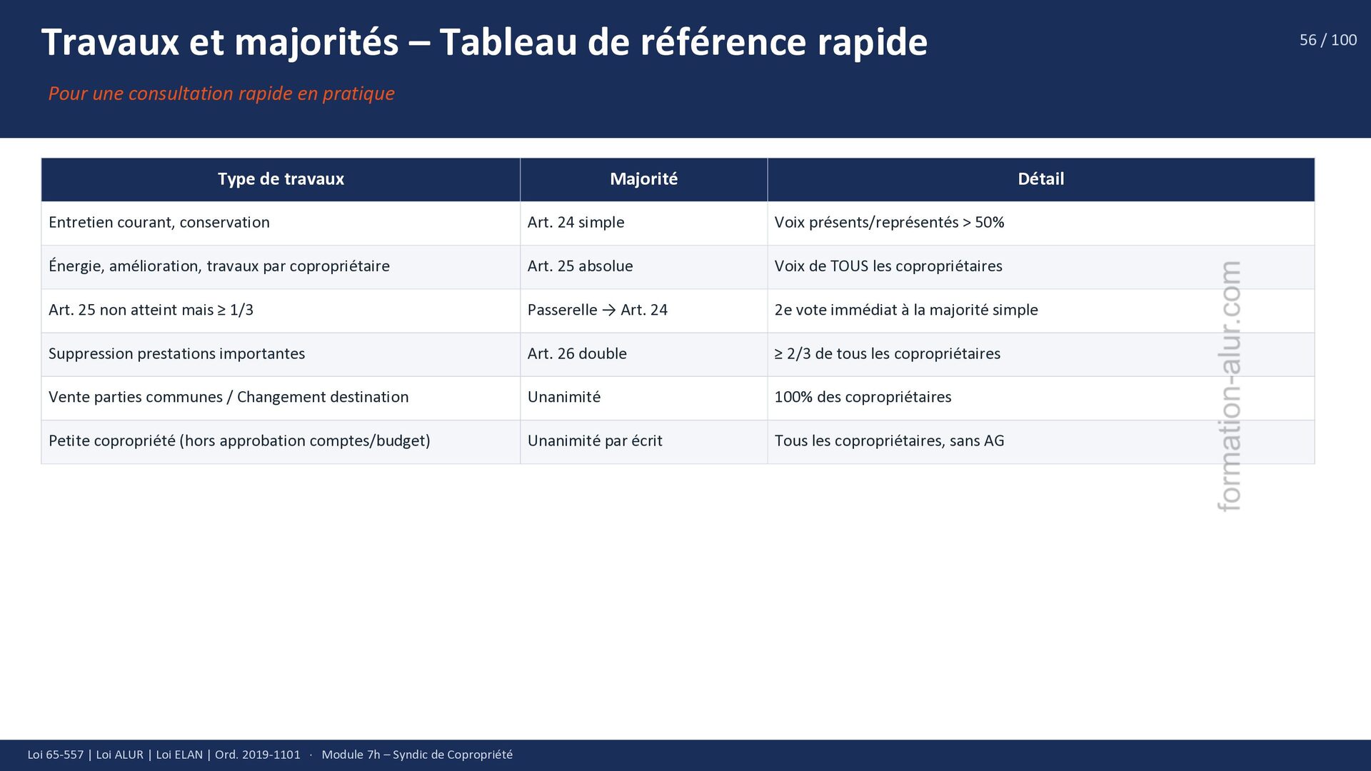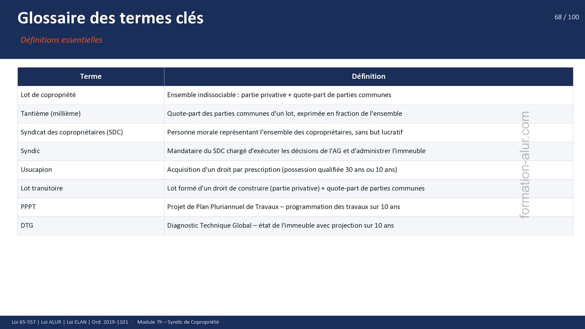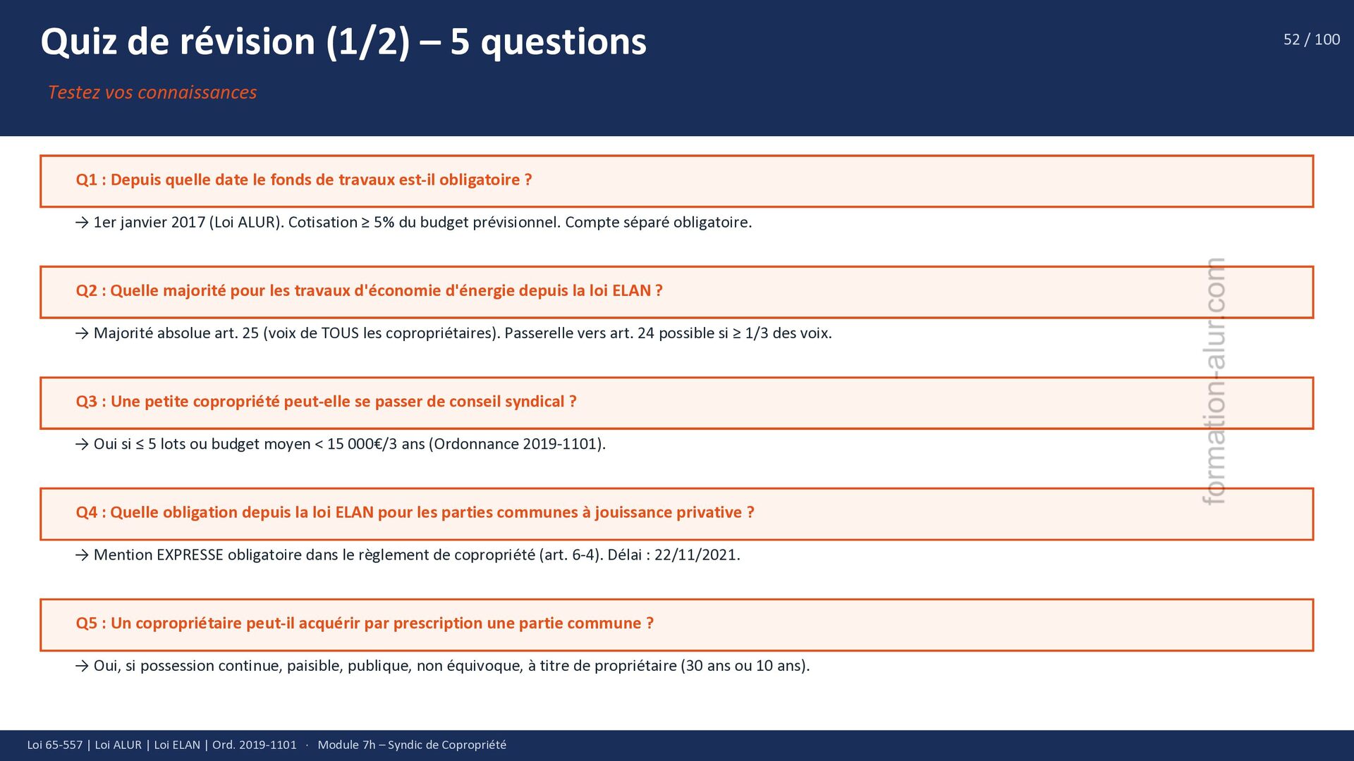éléments clés de l'immeuble 55 / 100 Loi 65-557 | Loi ALUR | Loi ELAN | Ord. 2019-1101 · Module 7h – Syndic de Copropriété Élément Qualif. Raison principale Appartement, locaux professionnels 🔒 PRIVATIF Usage exclusif d'un seul copropriétaire Porte palière, fenêtres, volets 🔒 PRIVATIF Accessoire indissociable du lot Robinetterie, tuyauterie horizontale 🔒 PRIVATIF Dessert uniquement ce lot Façade, toiture, murs porteurs 🏛 COMMUN Gros œuvre utile à tous Colonnes montantes, descentes EU 🏛 COMMUN Desservent tout l'immeuble Escaliers, couloirs, halls 🏛 COMMUN Usage collectif Ascenseur, chaufferie, local poubelles 🏛 COMMUN Équipement commun Jardin/terrasse à jouissance privative ⚠️ PC à JP Propriété commune + usage privé exclusif