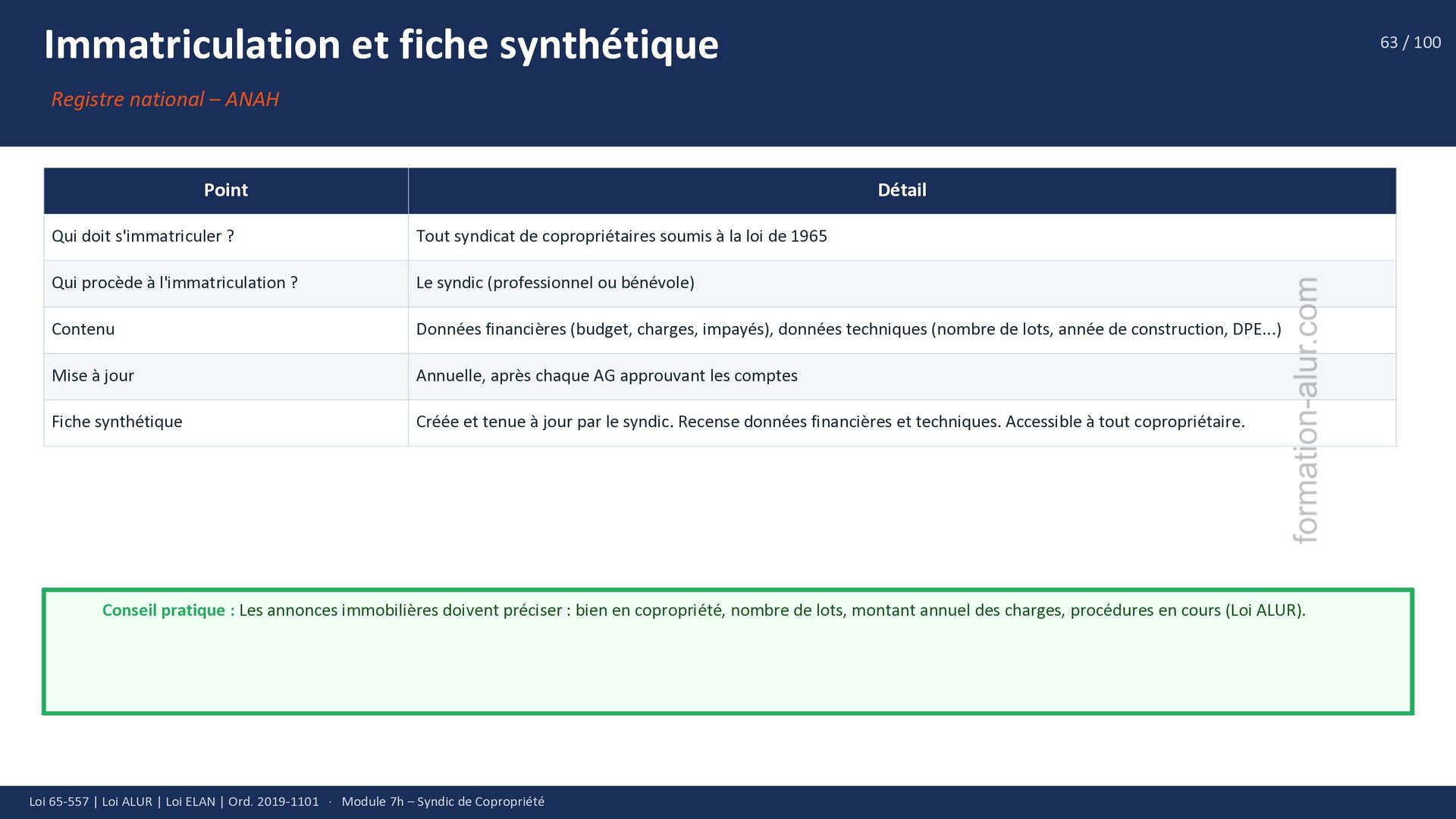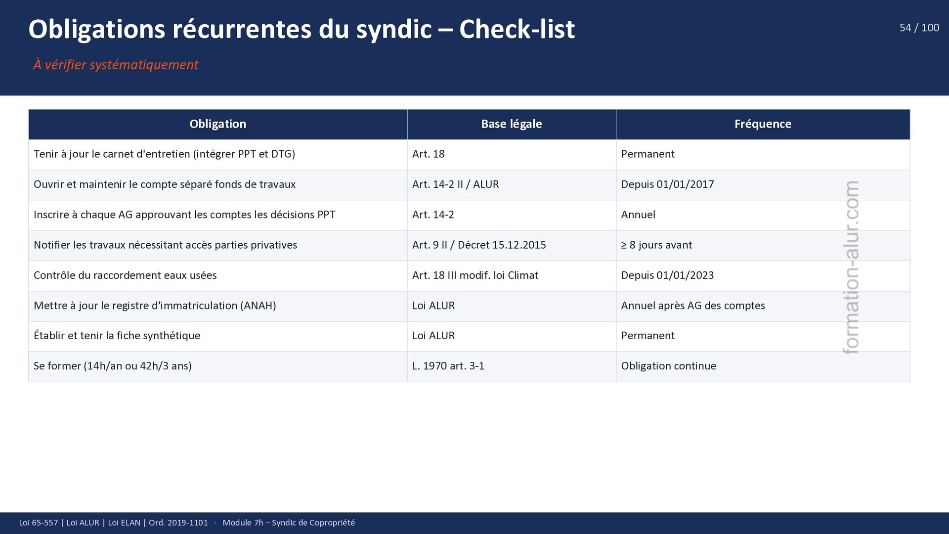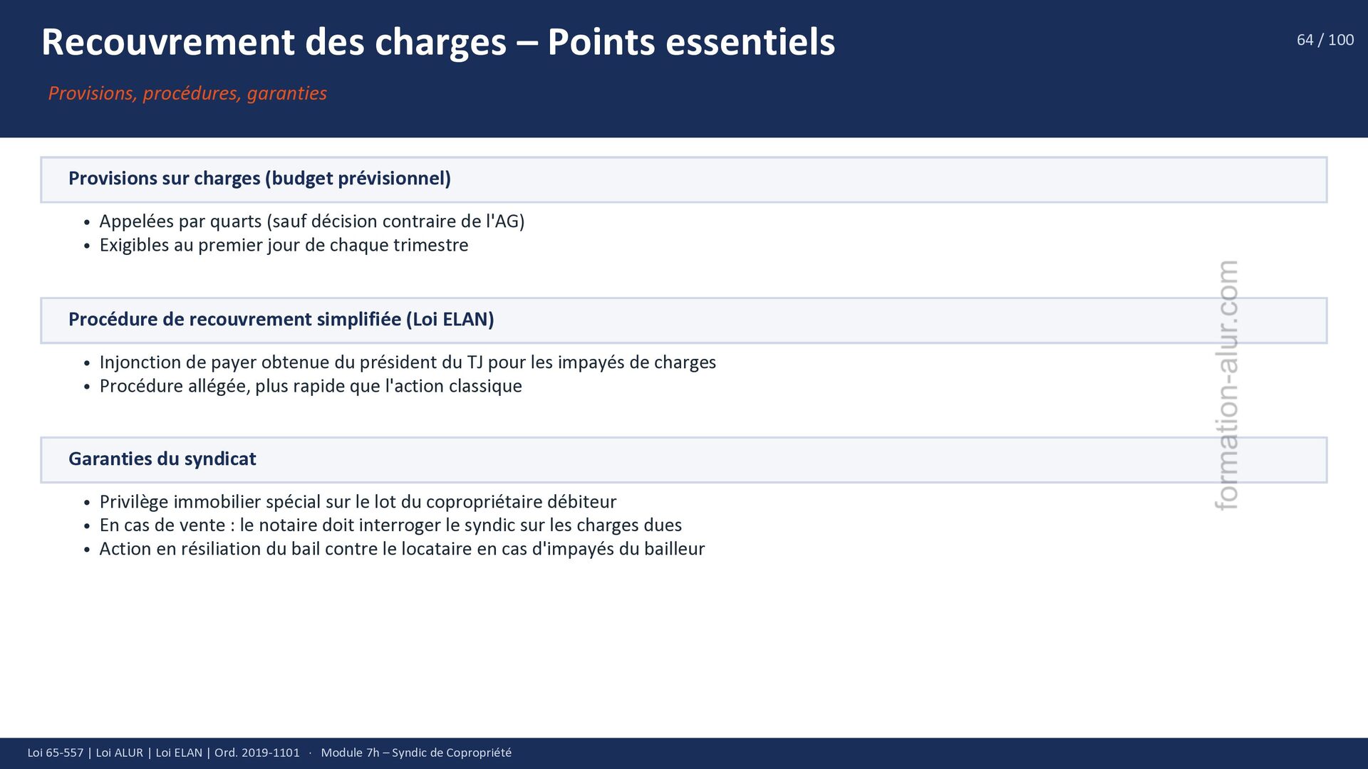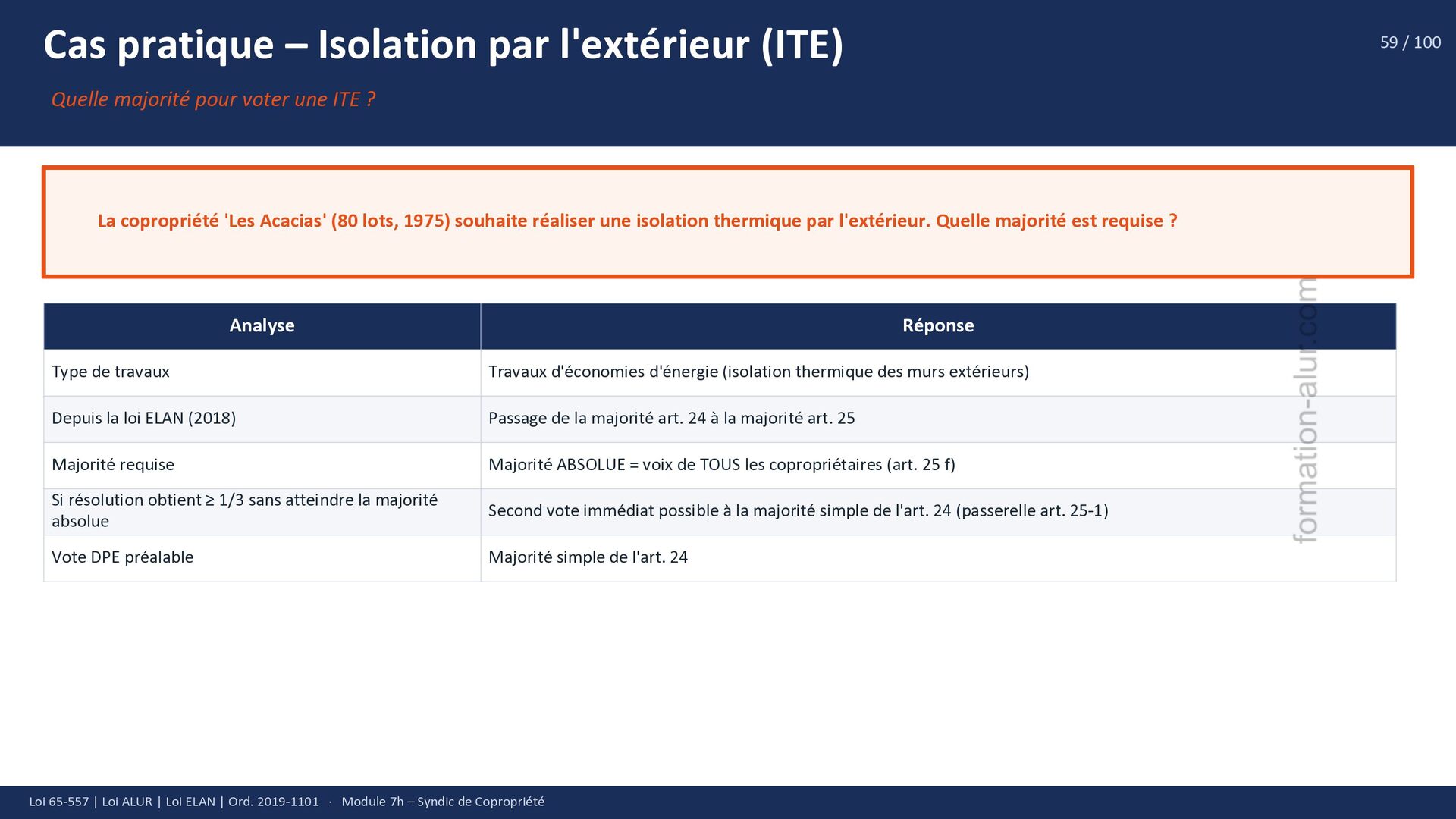 éléments clés de l'immeuble 55 / 100 Loi 65-557 | Loi ALUR | Loi ELAN | Ord. 2019-1101 · Module 7h – Syndic de Copropriété Élément Qualif. Raison principale Appartement, locaux professionnels 🔒 PRIVATIF Usage exclusif d'un seul copropriétaire Porte palière, fenêtres, volets 🔒 PRIVATIF Accessoire indissociable du lot Robinetterie, tuyauterie horizontale 🔒 PRIVATIF Dessert uniquement ce lot Façade, toiture, murs porteurs 🏛 COMMUN Gros œuvre utile à tous Colonnes montantes, descentes EU 🏛 COMMUN Desservent tout l'immeuble Escaliers, couloirs, halls 🏛 COMMUN Usage collectif Ascenseur, chaufferie, local poubelles 🏛 COMMUN Équipement commun Jardin/terrasse à jouissance privative ⚠️ PC à JP Propriété commune + usage privé exclusif
