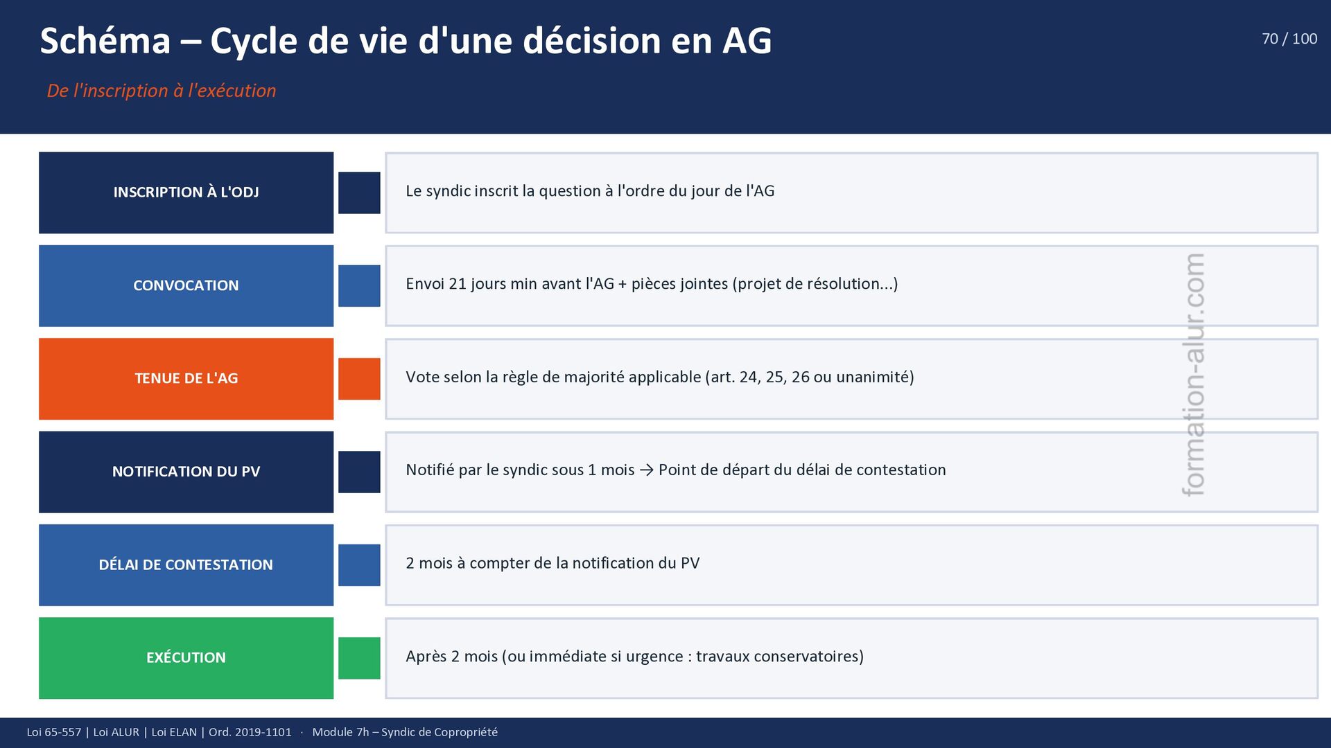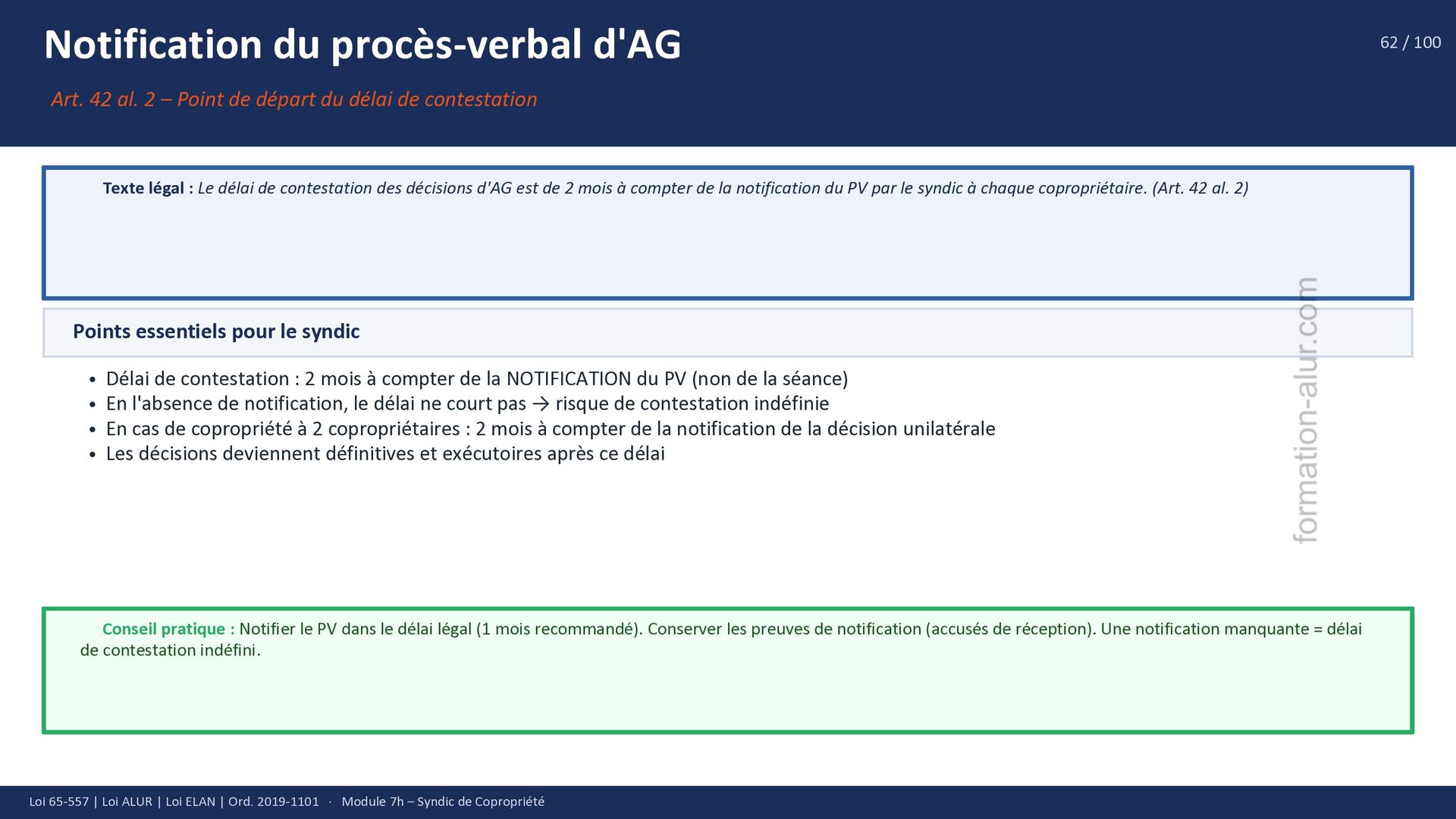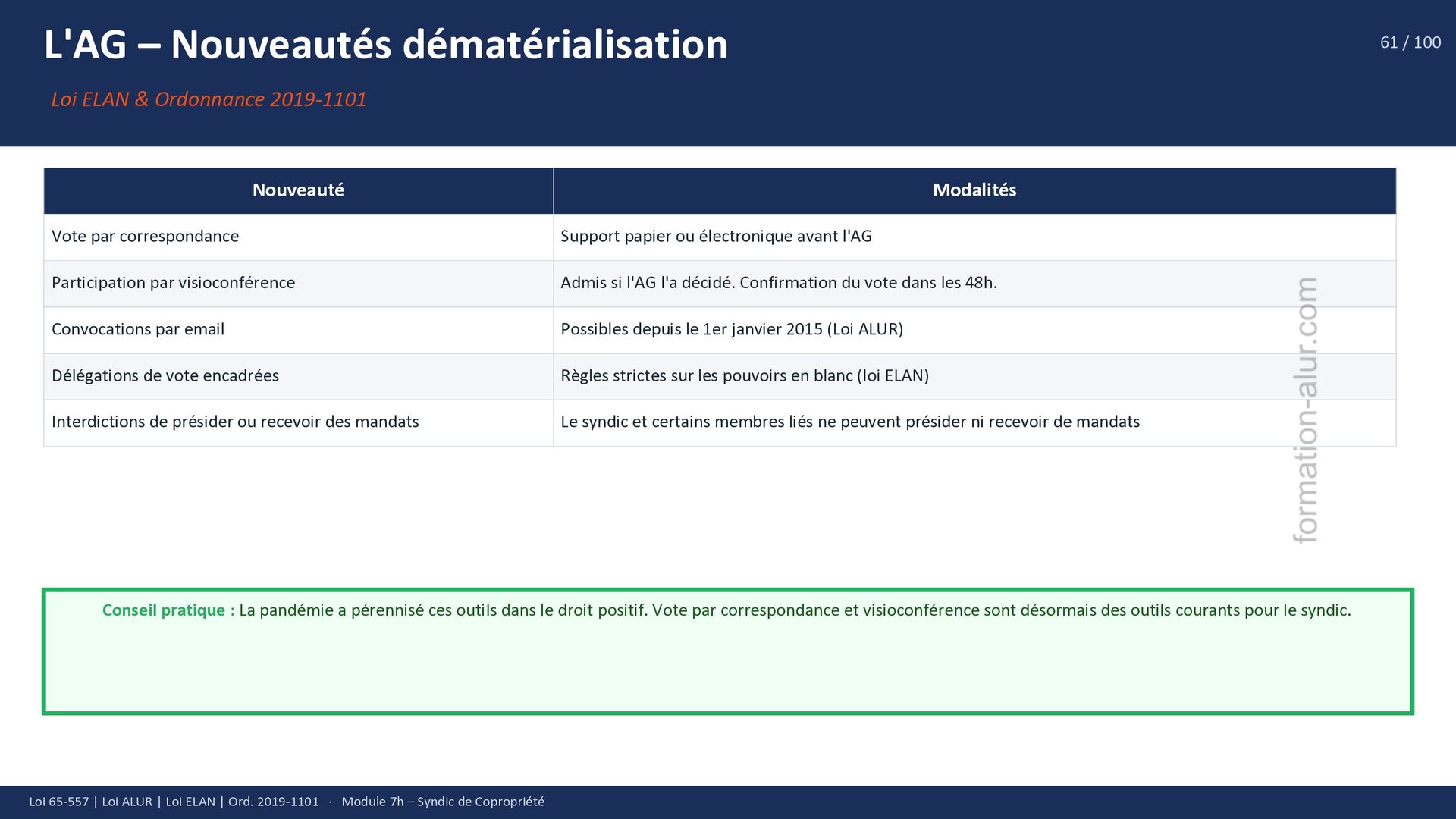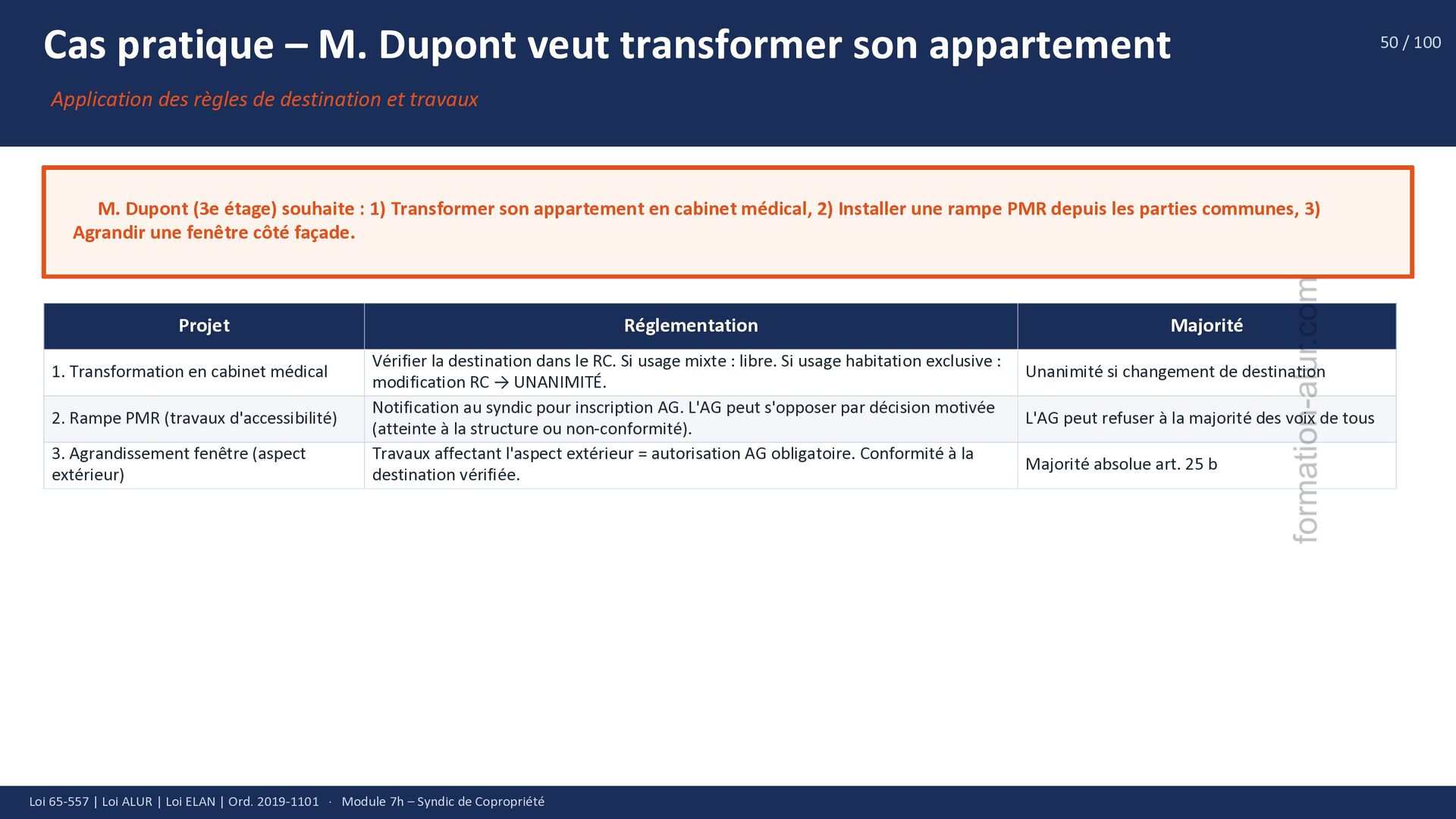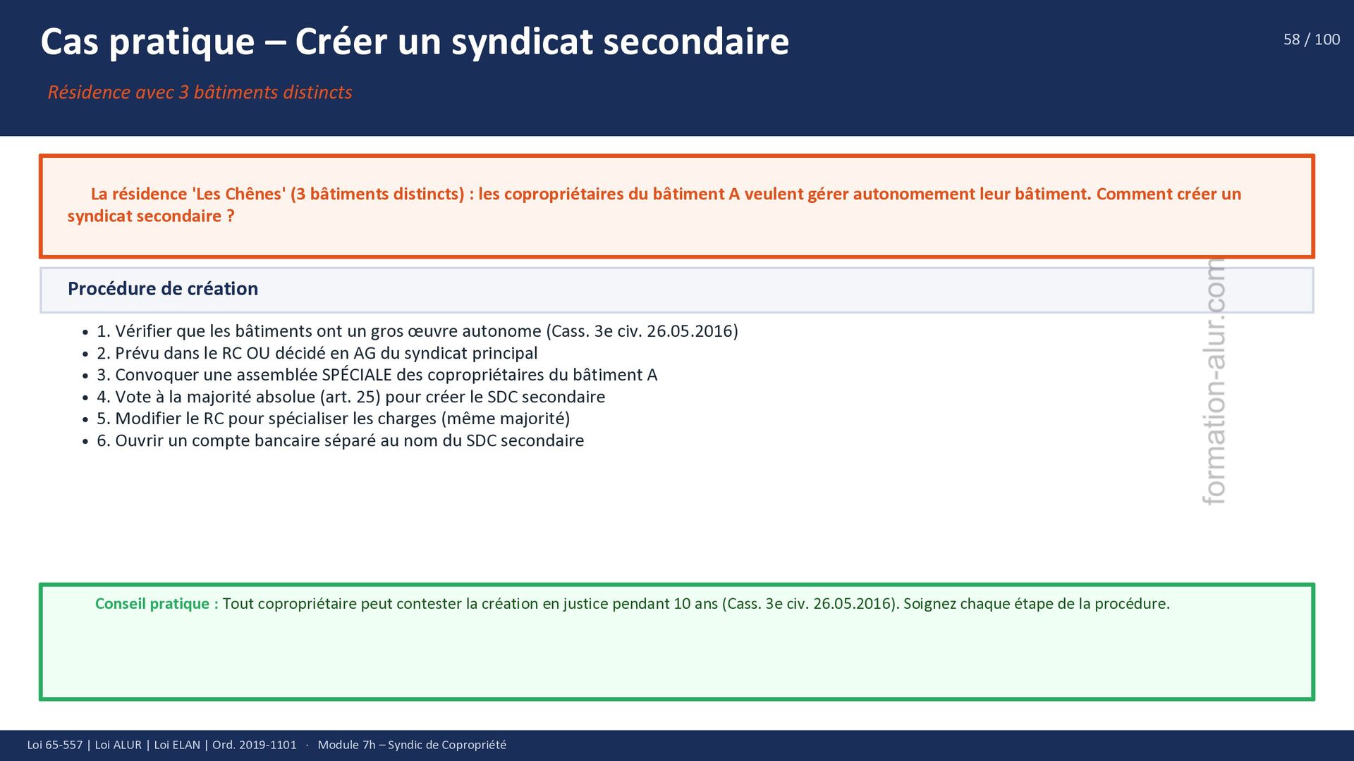 éléments clés de l'immeuble 55 / 100 Loi 65-557 | Loi ALUR | Loi ELAN | Ord. 2019-1101 · Module 7h – Syndic de Copropriété Élément Qualif. Raison principale Appartement, locaux professionnels 🔒 PRIVATIF Usage exclusif d'un seul copropriétaire Porte palière, fenêtres, volets 🔒 PRIVATIF Accessoire indissociable du lot Robinetterie, tuyauterie horizontale 🔒 PRIVATIF Dessert uniquement ce lot Façade, toiture, murs porteurs 🏛 COMMUN Gros œuvre utile à tous Colonnes montantes, descentes EU 🏛 COMMUN Desservent tout l'immeuble Escaliers, couloirs, halls 🏛 COMMUN Usage collectif Ascenseur, chaufferie, local poubelles 🏛 COMMUN Équipement commun Jardin/terrasse à jouissance privative ⚠️ PC à JP Propriété commune + usage privé exclusif