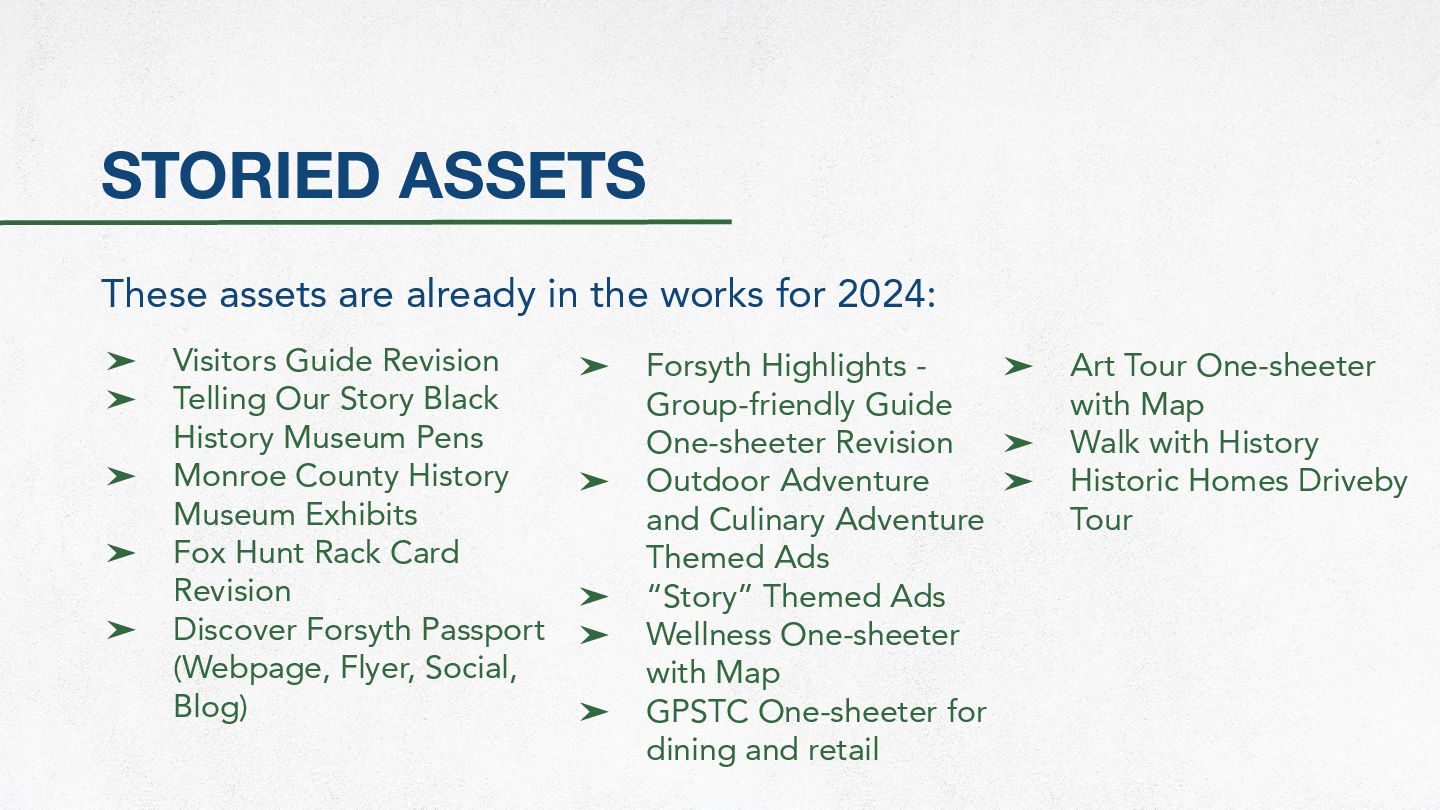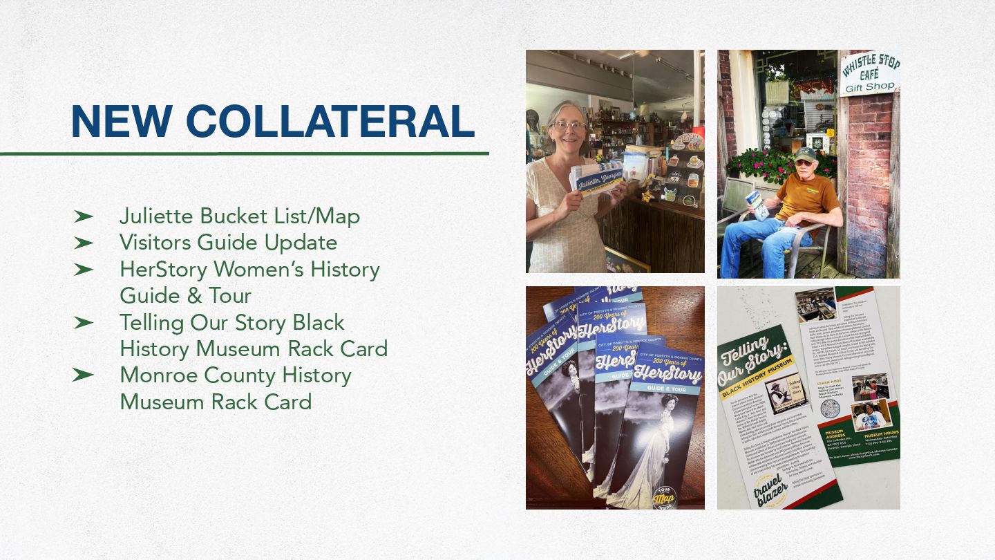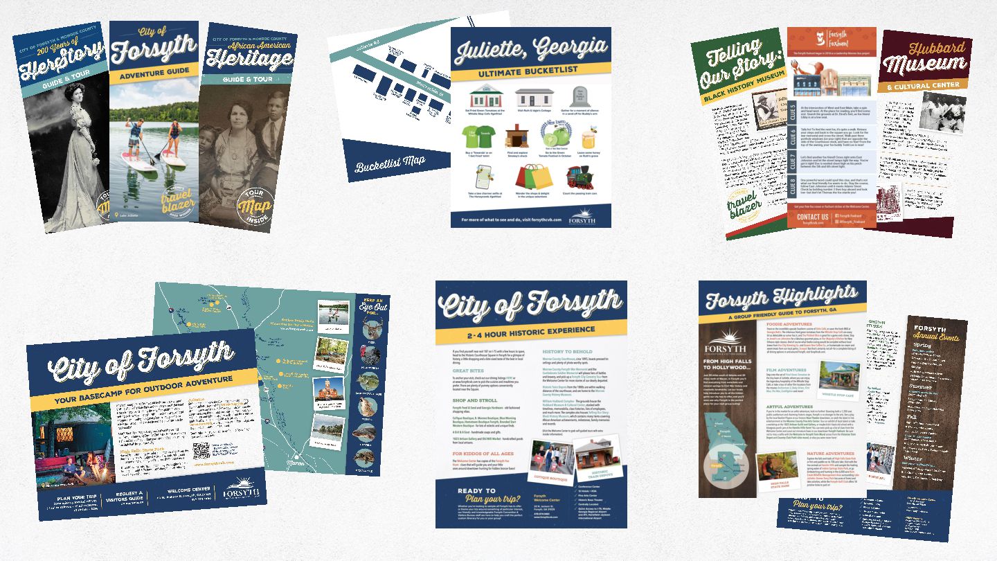 2024: ➤ Visitors Guide Revision ➤ Telling Our Story Black History Museum Pens ➤ Monroe County History Museum Exhibits ➤ Fox Hunt Rack Card Revision ➤ Discover Forsyth Passport (Webpage, Flyer, Social, Blog) ➤ Forsyth Highlights - Group-friendly Guide One-sheeter Revision ➤ Outdoor Adventure and Culinary Adventure Themed Ads ➤ “Story” Themed Ads ➤ Wellness One-sheeter with Map ➤ GPSTC One-sheeter for dining and retail ➤ Art Tour One-sheeter with Map ➤ Walk with History ➤ Historic Homes Driveby Tour