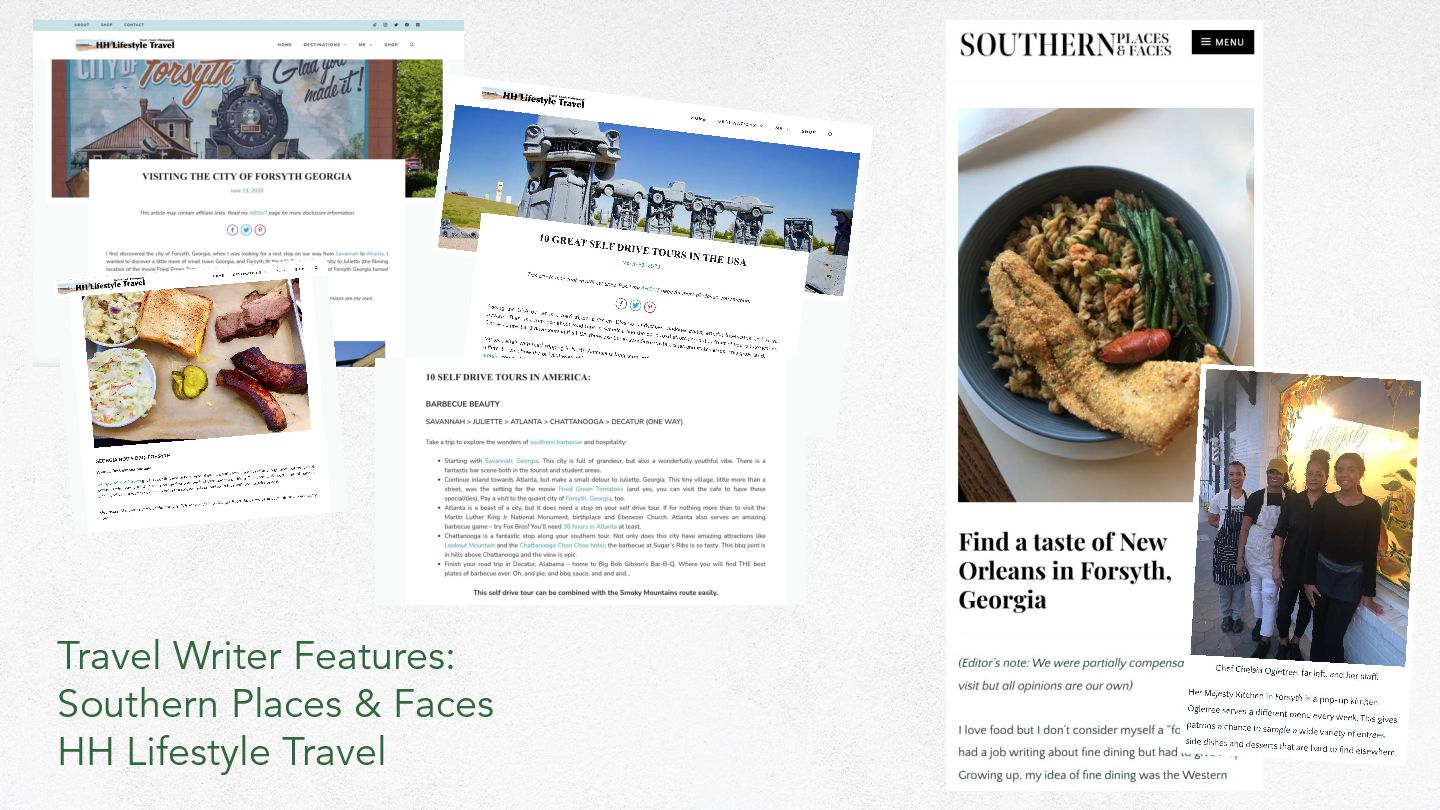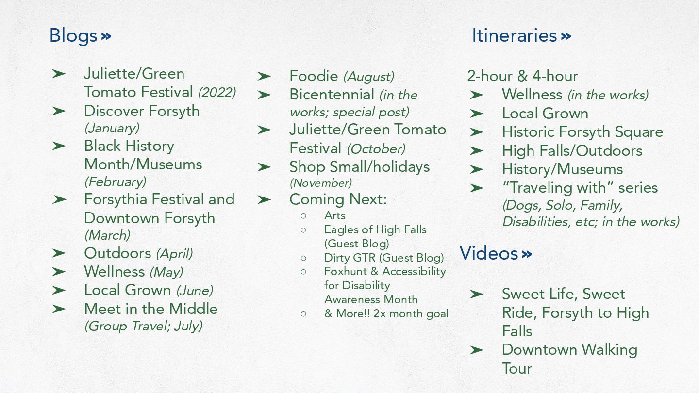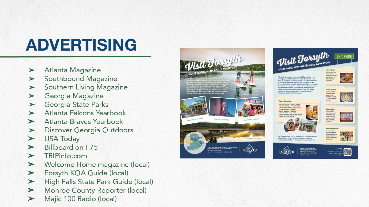 2024: ➤ Visitors Guide Revision ➤ Telling Our Story Black History Museum Pens ➤ Monroe County History Museum Exhibits ➤ Fox Hunt Rack Card Revision ➤ Discover Forsyth Passport (Webpage, Flyer, Social, Blog) ➤ Forsyth Highlights - Group-friendly Guide One-sheeter Revision ➤ Outdoor Adventure and Culinary Adventure Themed Ads ➤ “Story” Themed Ads ➤ Wellness One-sheeter with Map ➤ GPSTC One-sheeter for dining and retail ➤ Art Tour One-sheeter with Map ➤ Walk with History ➤ Historic Homes Driveby Tour