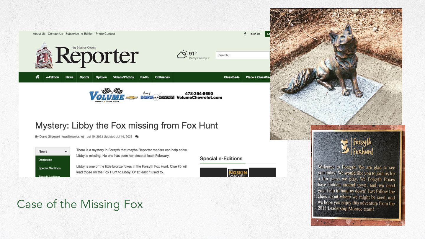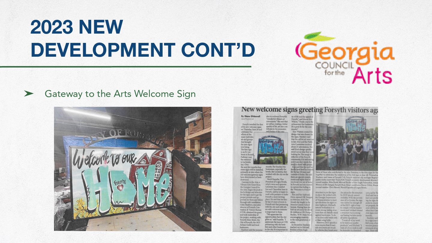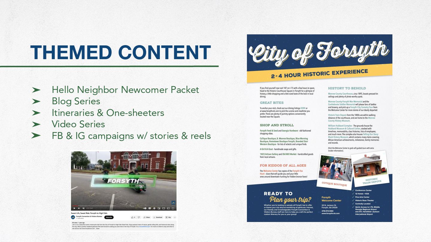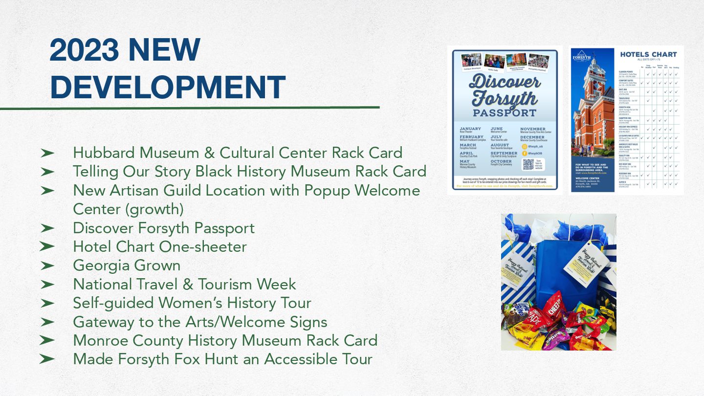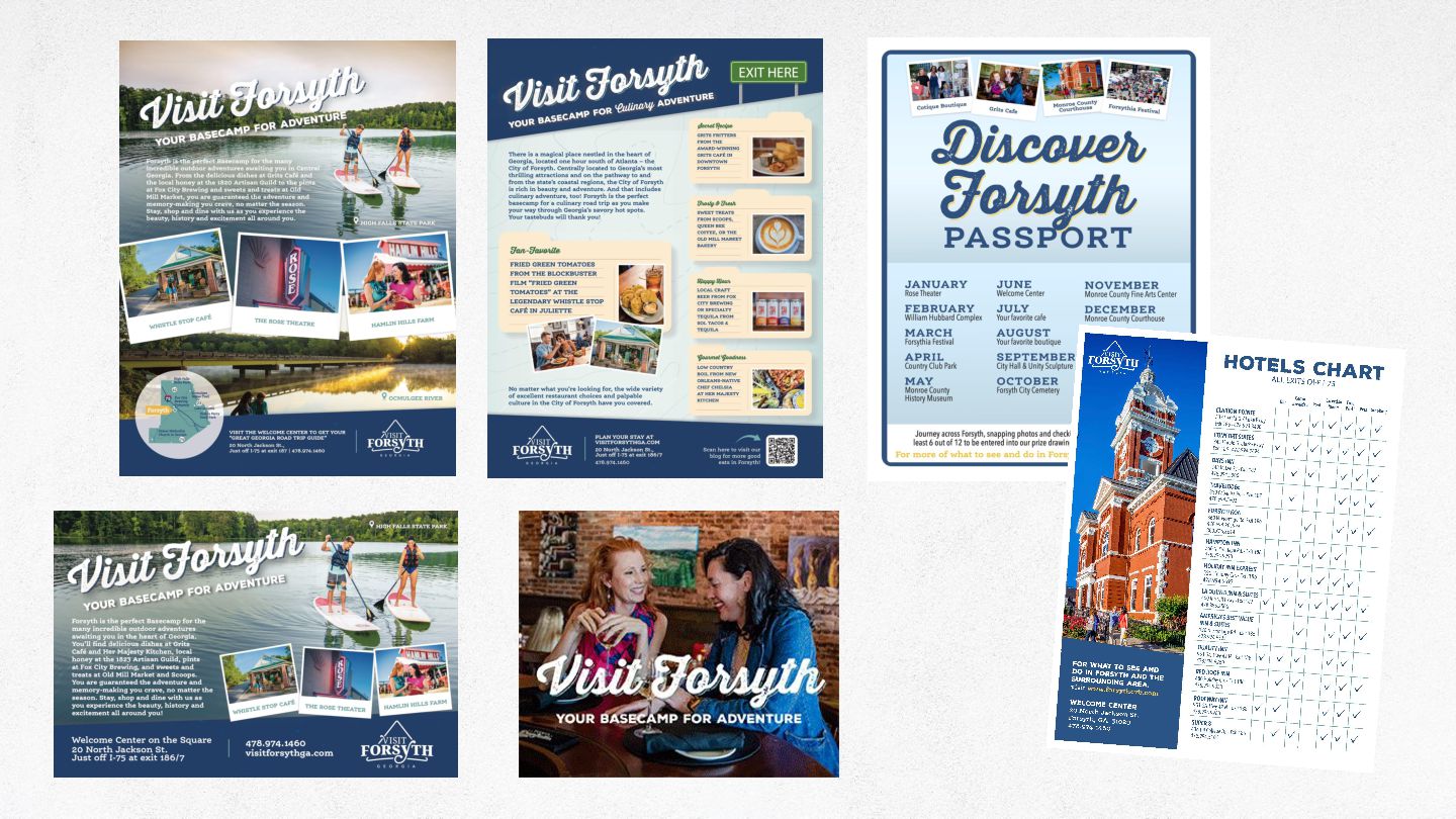 Card ➤ Telling Our Story Black History Museum Rack Card ➤ New Artisan Guild Location with Popup Welcome Center (growth) ➤ Discover Forsyth Passport ➤ Hotel Chart One-sheeter ➤ Georgia Grown ➤ National Travel & Tourism Week ➤ Self-guided Women’s History Tour ➤ Gateway to the Arts/Welcome Signs ➤ Monroe County History Museum Rack Card ➤ Made Forsyth Fox Hunt an Accessible Tour