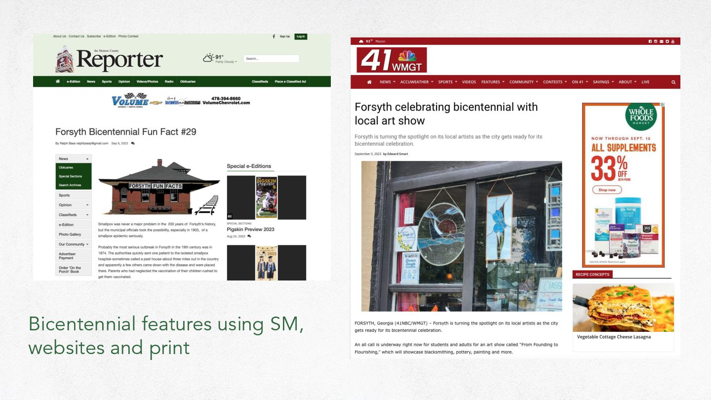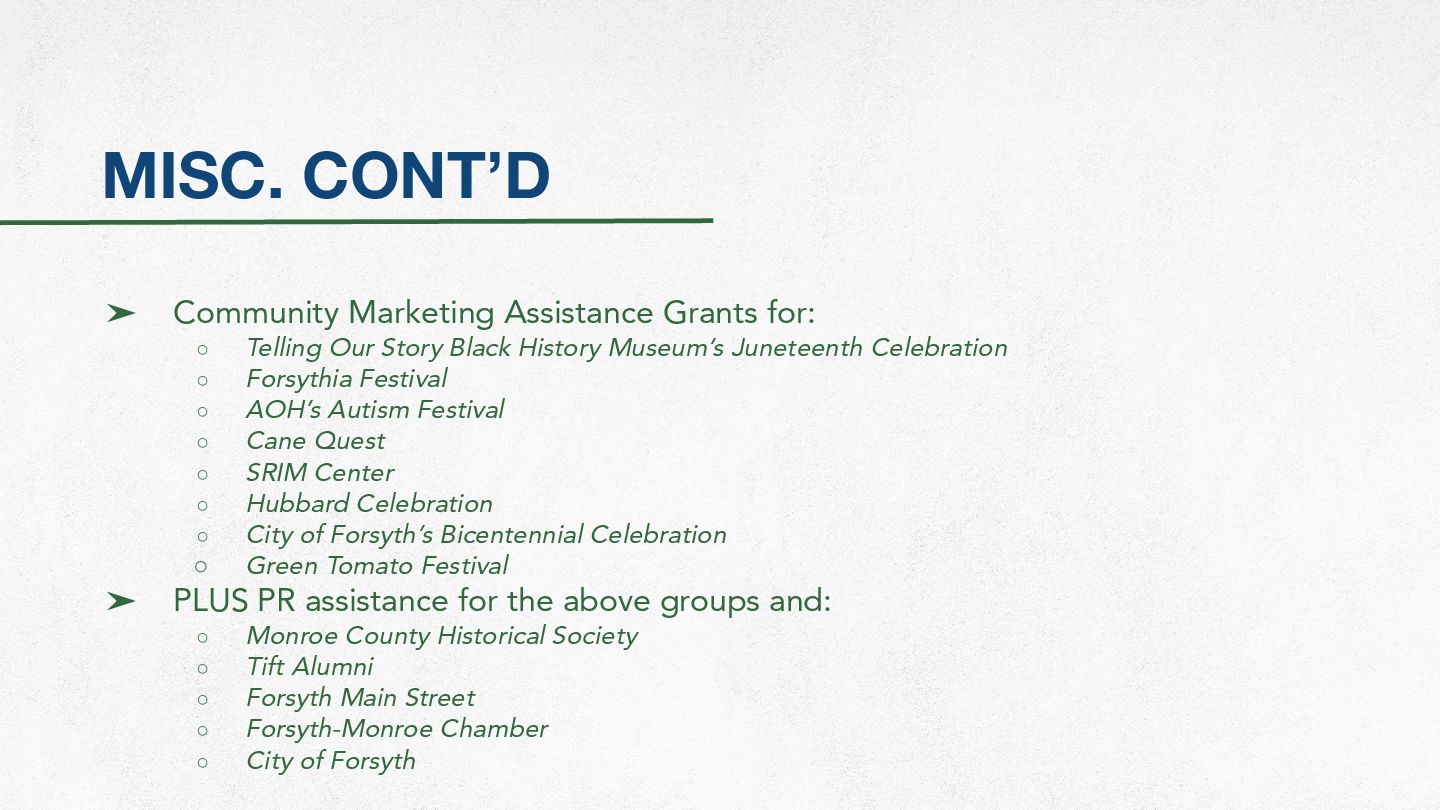 Our Story Black History Museum’s Juneteenth Celebration ◦ Forsythia Festival ◦ AOH’s Autism Festival ◦ Cane Quest ◦ SRIM Center ◦ Hubbard Celebration ◦ City of Forsyth’s Bicentennial Celebration ◦ Green Tomato Festival ➤ PLUS PR assistance for the above groups and: ◦ Monroe County Historical Society ◦ Tift Alumni ◦ Forsyth Main Street ◦ Forsyth-Monroe Chamber ◦ City of Forsyth