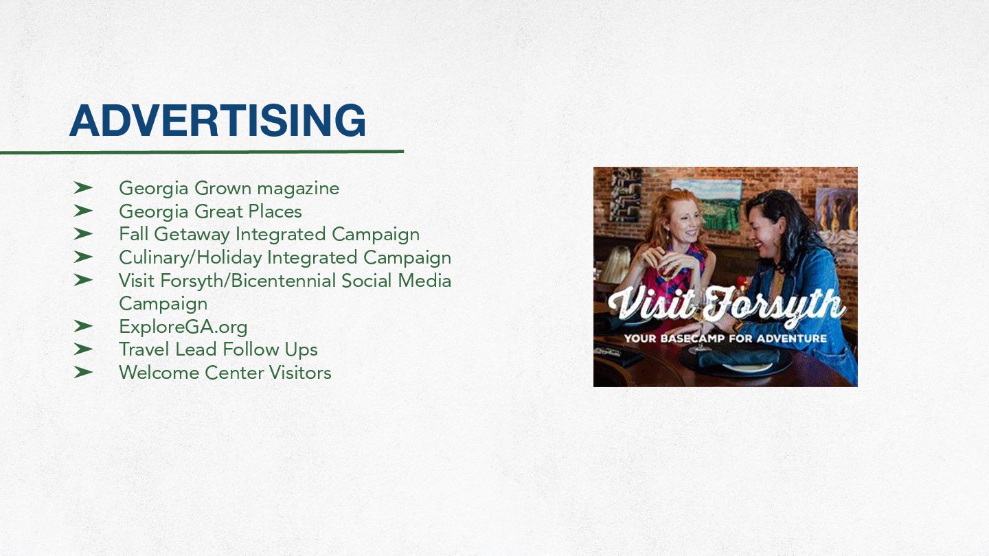 Fall Getaway Integrated Campaign ➤ Culinary/Holiday Integrated Campaign ➤ Visit Forsyth/Bicentennial Social Media Campaign ➤ ExploreGA.org ➤ Travel Lead Follow Ups ➤ Welcome Center Visitors