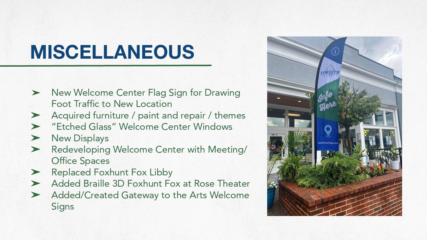 Traffic to New Location ➤ Acquired furniture / paint and repair / themes ➤ “Etched Glass” Welcome Center Windows ➤ New Displays ➤ Redeveloping Welcome Center with Meeting/ Office Spaces ➤ Replaced Foxhunt Fox Libby ➤ Added Braille 3D Foxhunt Fox at Rose Theater ➤ Added/Created Gateway to the Arts Welcome Signs