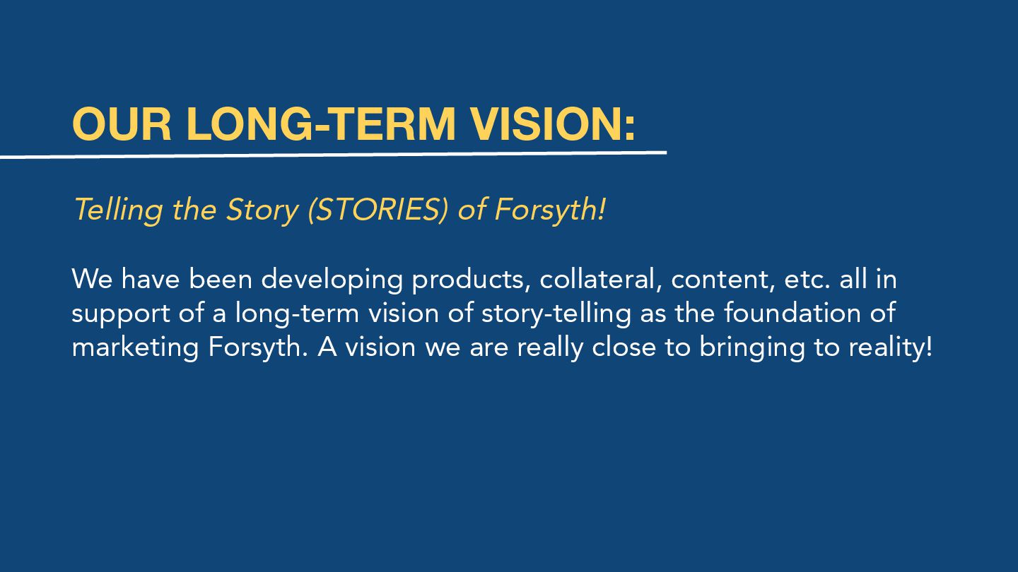 have been developing products, collateral, content, etc. all in support of a long-term vision of story-telling as the foundation of marketing Forsyth. A vision we are really close to bringing to reality!