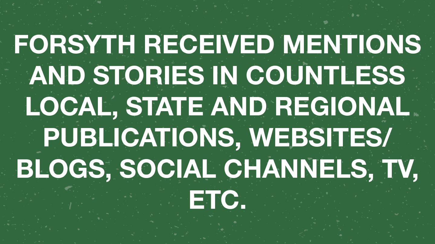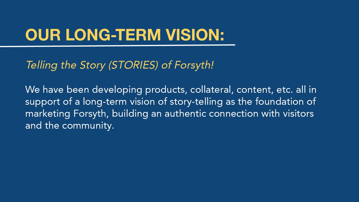 have been developing products, collateral, content, etc. all in support of a long-term vision of story-telling as the foundation of marketing Forsyth, building an authentic connection with visitors and the community.