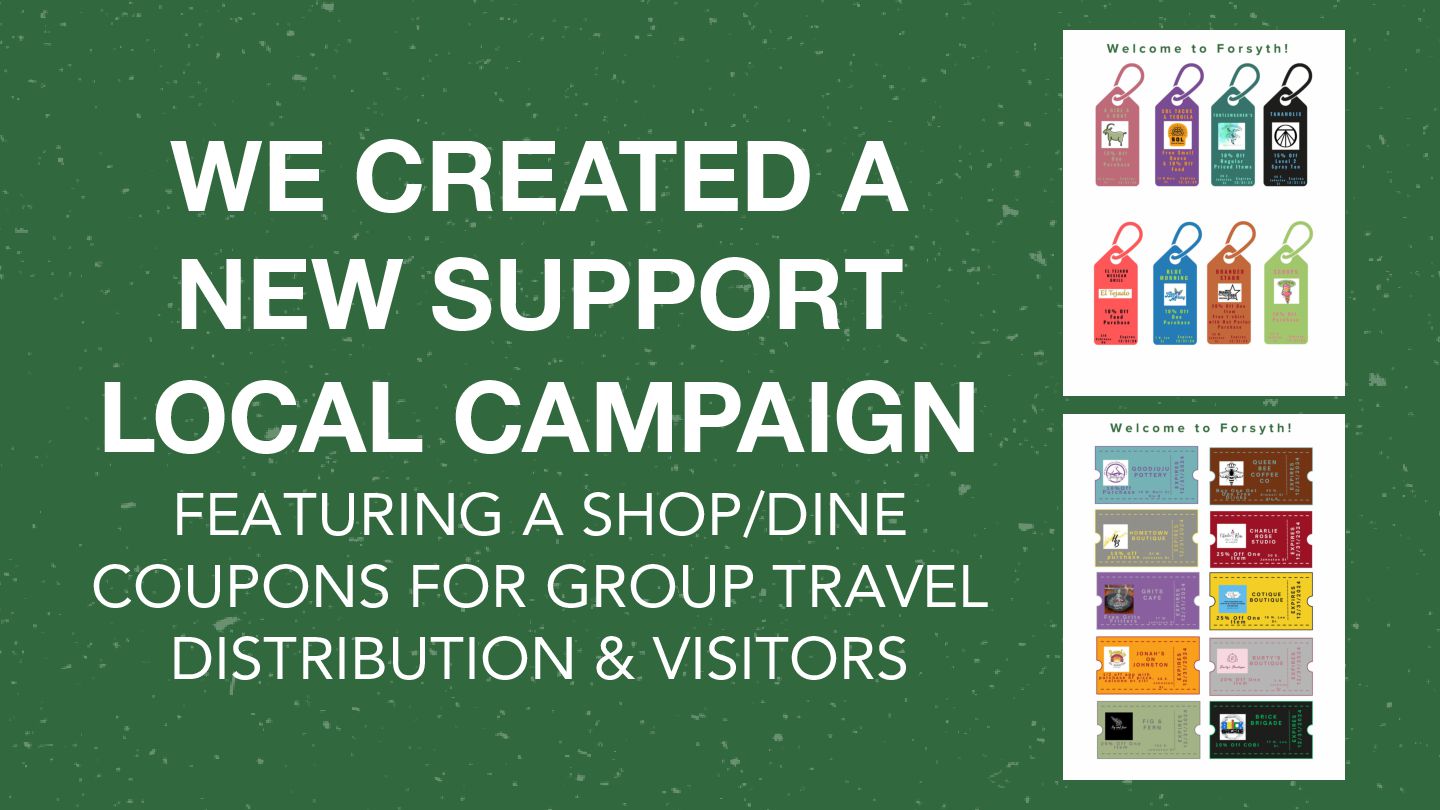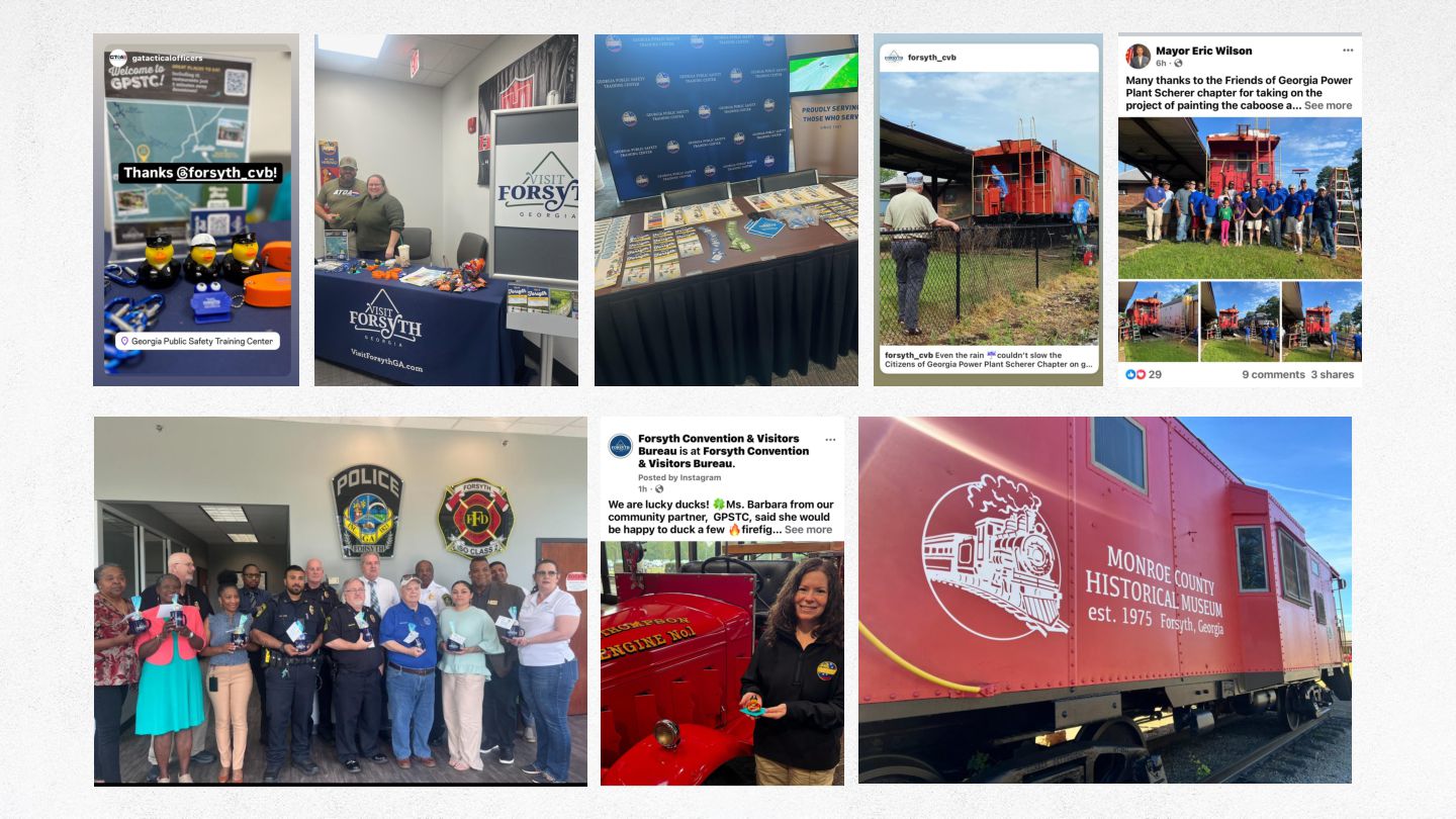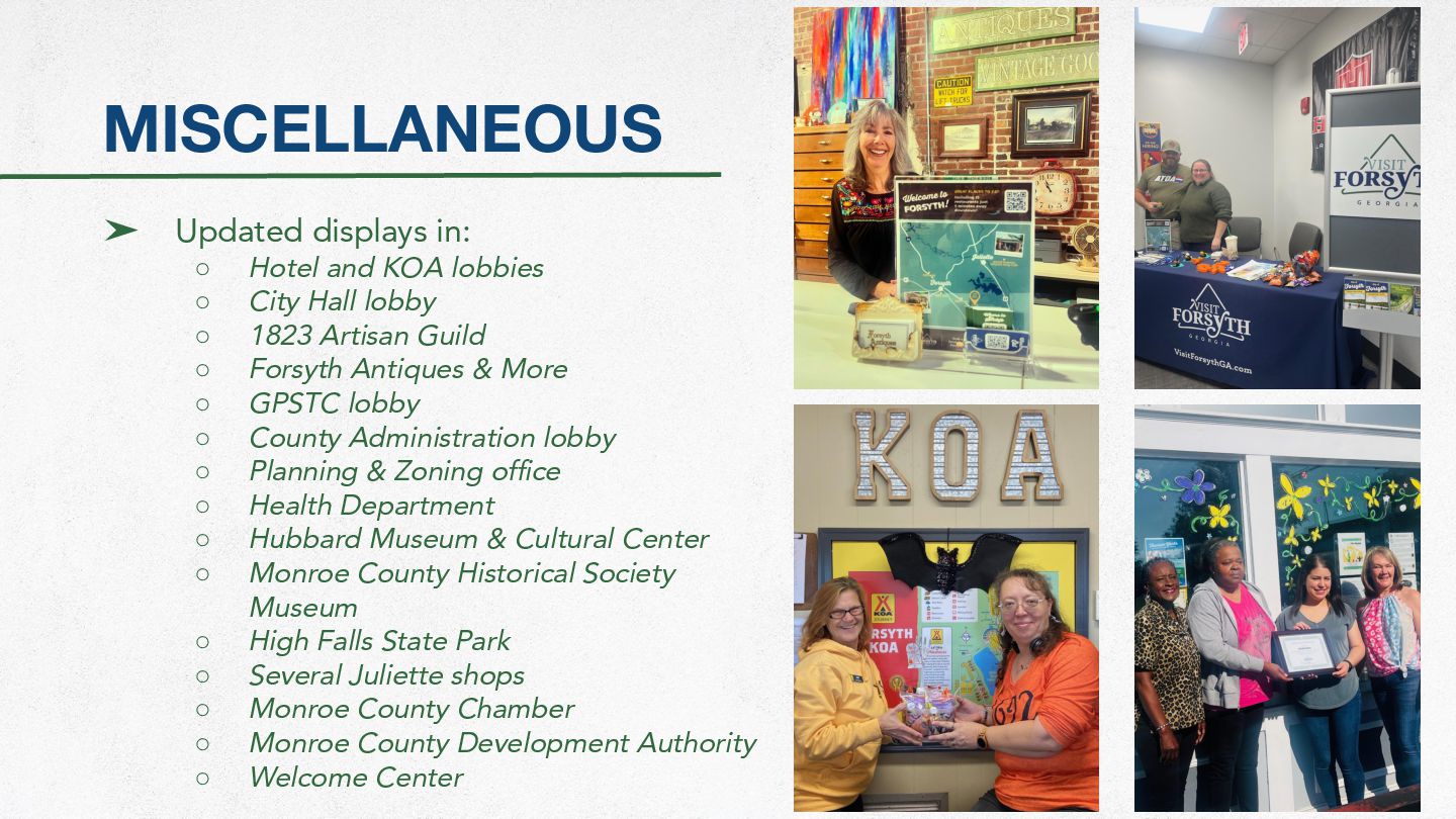 other materials promoting Forsyth and its tourism partners in the following places: ➤ Forsyth Welcome Center ➤ 1823 Artisan Guild & Gallery ➤ GPSTC ➤ Forsyth City Hall ➤ Monroe County Annex lobby ➤ 12 hotel & KOA lobbies ➤ State Regional VICs ◦ Augusta ◦ Columbus ◦ Lavonia ◦ Port Wentworth ◦ Ringgold ◦ St. Mary’s ◦ Tallapoosa ◦ Valdosta ◦ West Point ➤ SWAG bags for groups/events ➤ Chamber office ➤ Industrial Development Authority Office ➤ Whistle Stop Cafe in Juliette ➤ Honeycomb and shops in Juliette ➤ Hello Neighbor packets for newcomers