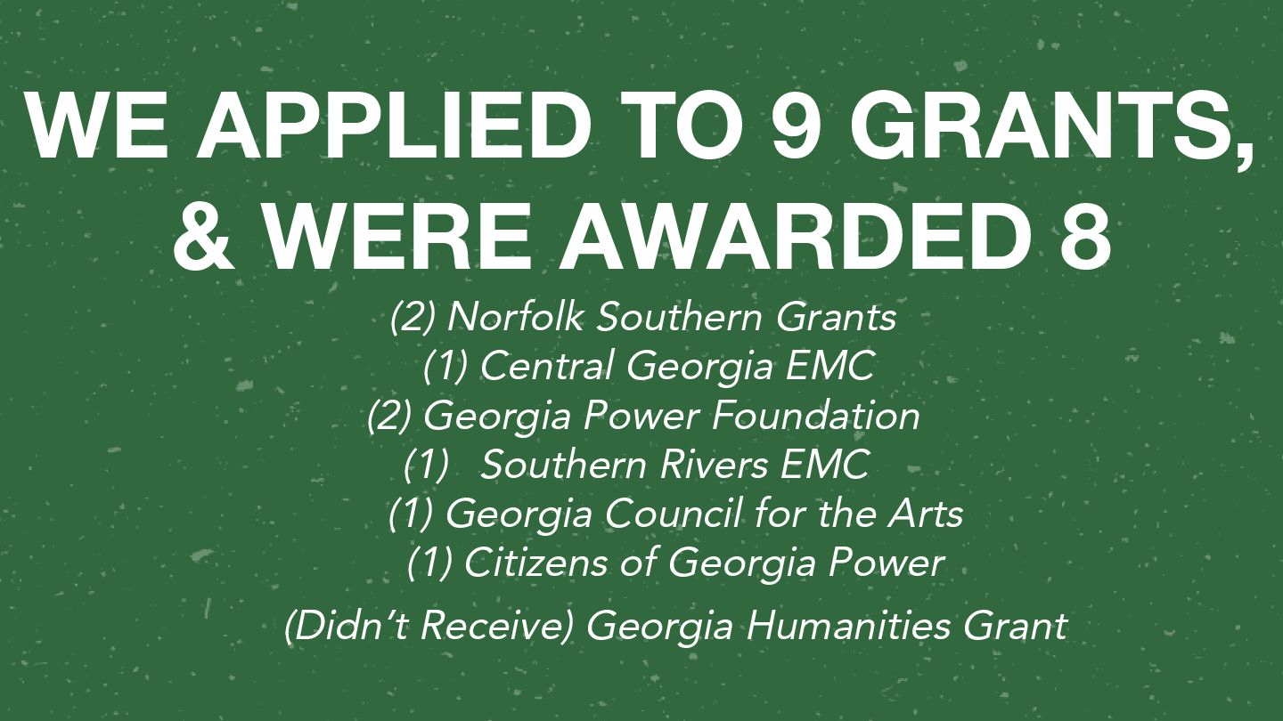 Norfolk Southern Grants (1) Central Georgia EMC (2) Georgia Power Foundation (1) Southern Rivers EMC (1) Georgia Council for the Arts (1) Citizens of Georgia Power (Didn’t Receive) Georgia Humanities Grant
