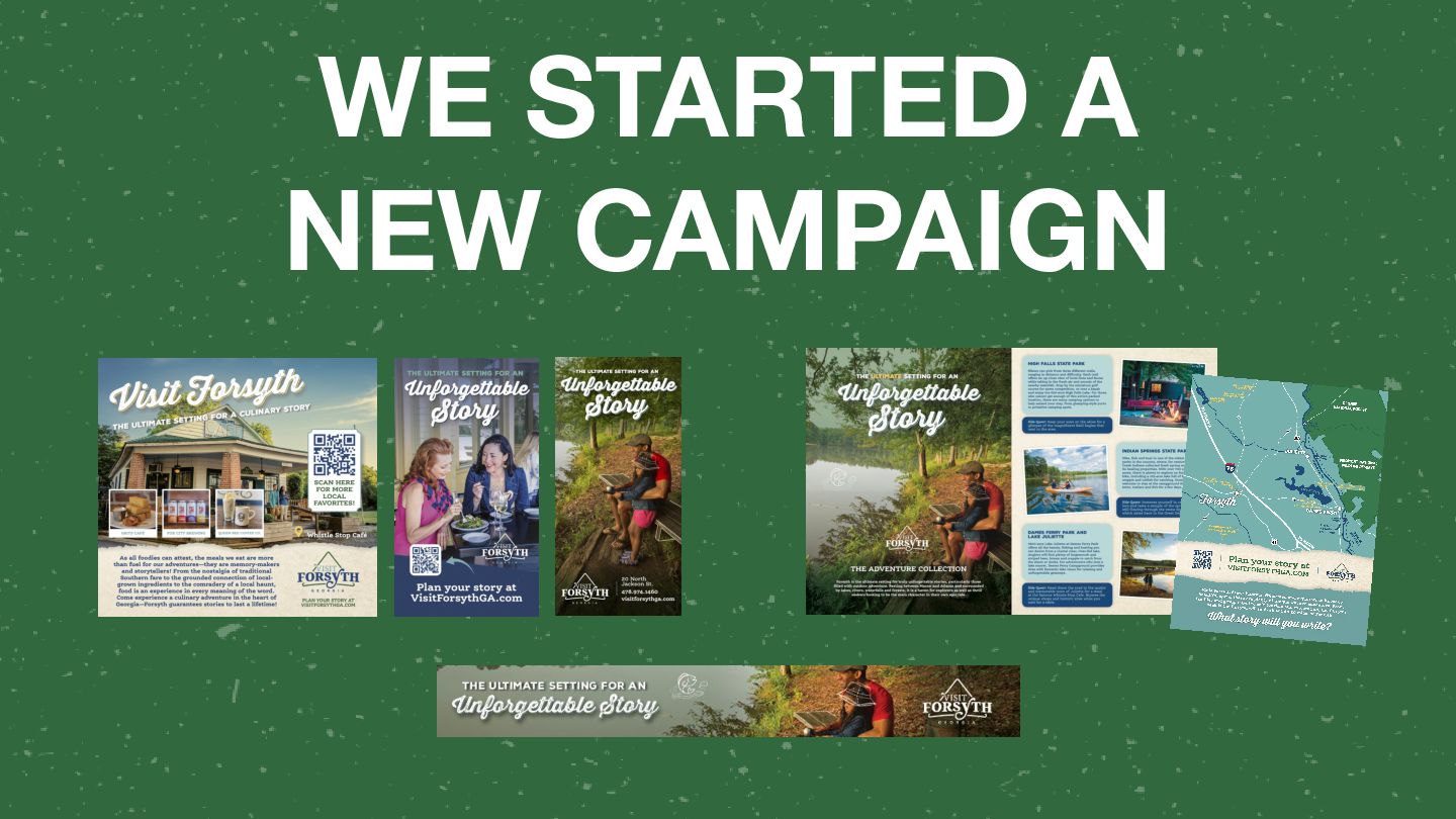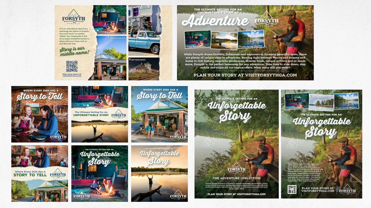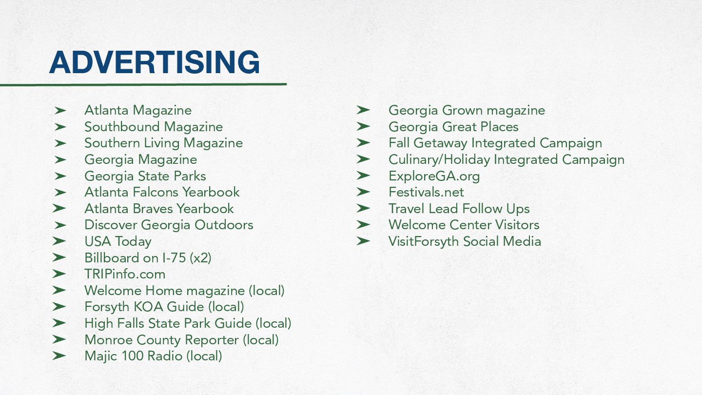 Magazine ➤ Georgia Magazine ➤ Georgia State Parks ➤ Atlanta Falcons Yearbook ➤ Atlanta Braves Yearbook ➤ Discover Georgia Outdoors ➤ USA Today ➤ Billboard on I-75 (x2) ➤ TRIPinfo.com ➤ Welcome Home magazine (local) ➤ Forsyth KOA Guide (local) ➤ High Falls State Park Guide (local) ➤ Monroe County Reporter (local) ➤ Majic 100 Radio (local) ➤ Georgia Grown magazine ➤ Georgia Great Places ➤ Fall Getaway Integrated Campaign ➤ Culinary/Holiday Integrated Campaign ➤ ExploreGA.org ➤ Festivals.net ➤ Travel Lead Follow Ups ➤ Welcome Center Visitors ➤ VisitForsyth Social Media