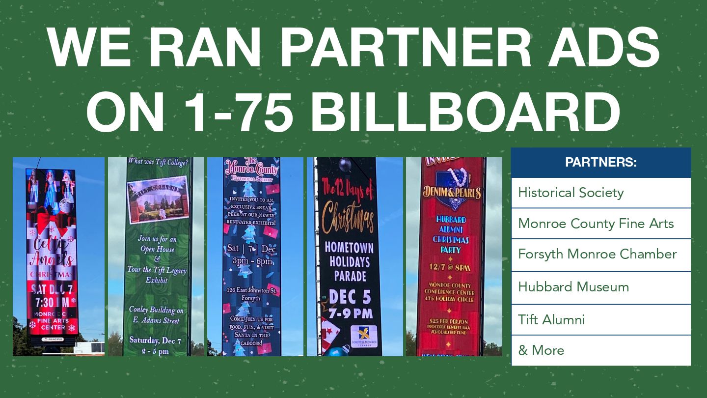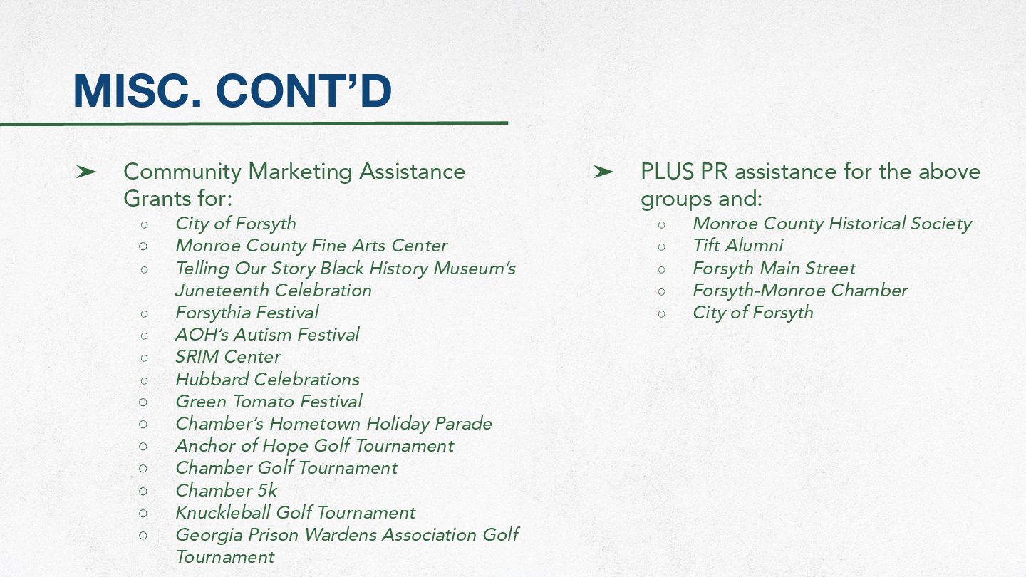 of Forsyth ◦ Monroe County Fine Arts Center ◦ Telling Our Story Black History Museum’s Juneteenth Celebration ◦ Forsythia Festival ◦ AOH’s Autism Festival ◦ SRIM Center ◦ Hubbard Celebrations ◦ Green Tomato Festival ◦ Chamber’s Hometown Holiday Parade ◦ Anchor of Hope Golf Tournament ◦ Chamber Golf Tournament ◦ Chamber 5k ◦ Knuckleball Golf Tournament ◦ Georgia Prison Wardens Association Golf Tournament ➤ PLUS PR assistance for the above groups and: ◦ Monroe County Historical Society ◦ Tift Alumni ◦ Forsyth Main Street ◦ Forsyth-Monroe Chamber ◦ City of Forsyth