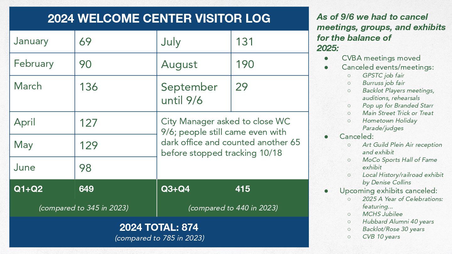 90 August 190 March 136 September until 9/6 29 April 127 City Manager asked to close WC 9/6; people still came even with dark office and counted another 65 before stopped tracking 10/18 May 129 June 98 Q1+Q2 649 Q3+Q4 415 (compared to 345 in 2023) (compared to 440 in 2023) 2024 TOTAL: 874 (compared to 785 in 2023) As of 9/6 we had to cancel meetings, groups, and exhibits for the balance of 2025: • CVBA meetings moved • Canceled events/meetings: ◦ GPSTC job fair ◦ Burruss job fair ◦ Backlot Players meetings, auditions, rehearsals ◦ Pop up for Branded Starr ◦ Main Street Trick or Treat ◦ Hometown Holiday Parade/judges • Canceled: ◦ Art Guild Plein Air reception and exhibit ◦ MoCo Sports Hall of Fame exhibit ◦ Local History/railroad exhibit by Denise Collins • Upcoming exhibits canceled: ◦ 2025 A Year of Celebrations: featuring... ◦ MCHS Jubilee ◦ Hubbard Alumni 40 years ◦ Backlot/Rose 30 years ◦ CVB 10 years
