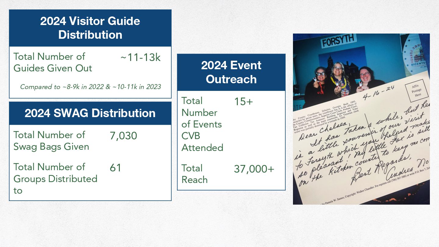 ~11-13k Compared to ~8-9k in 2022 & ~10-11k in 2023 2024 Event Outreach Total Number of Events CVB Attended 15+ Total Reach 37,000+ 2024 SWAG Distribution Total Number of Swag Bags Given 7,030 Total Number of Groups Distributed to 61