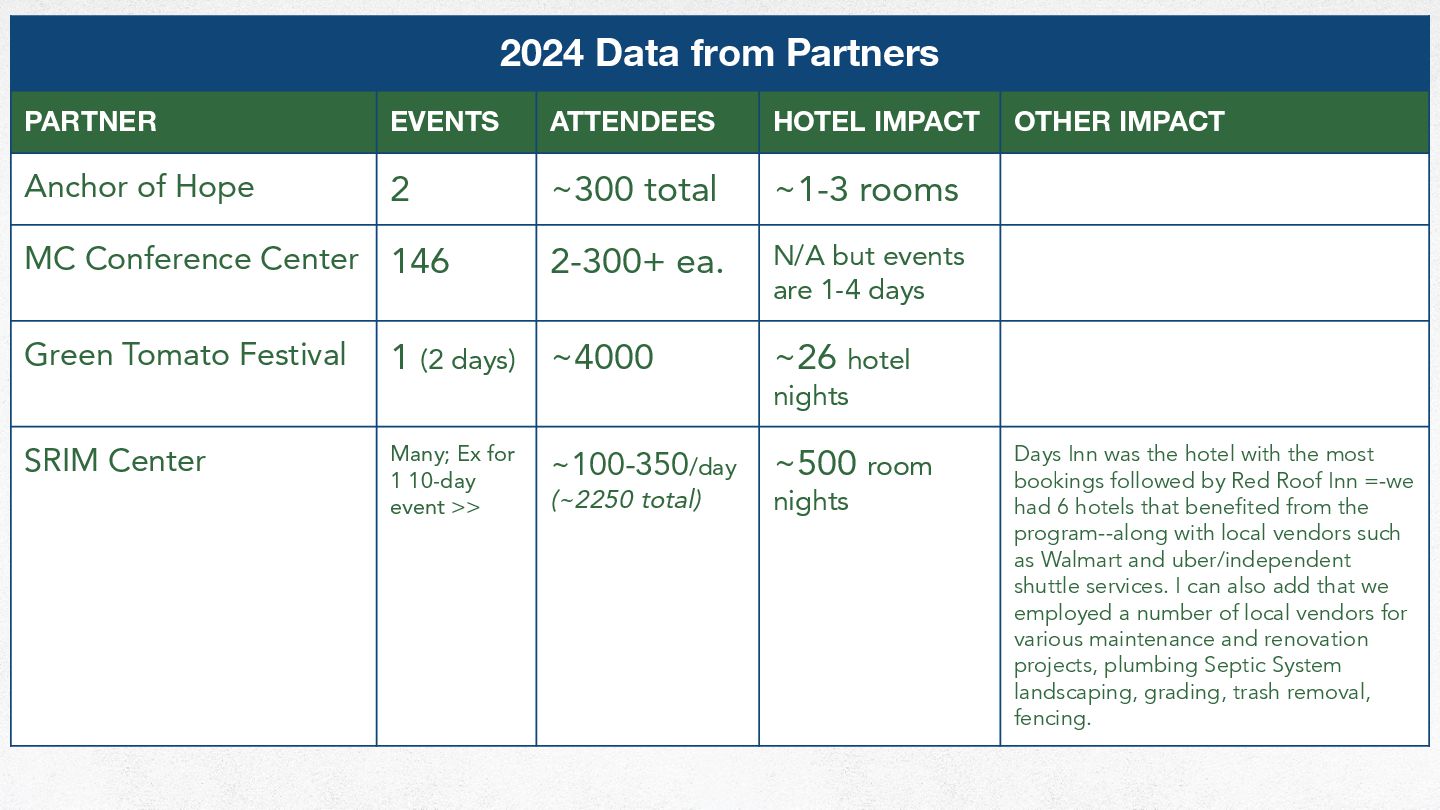 IMPACT Anchor of Hope 2 ~300 total ~1-3 rooms MC Conference Center 146 2-300+ ea. N/A but events are 1-4 days Green Tomato Festival 1 (2 days) ~4000 ~26 hotel nights SRIM Center Many; Ex for 1 10-day event >> ~100-350/day (~2250 total) ~500 room nights Days Inn was the hotel with the most bookings followed by Red Roof Inn =-we had 6 hotels that benefited from the program--along with local vendors such as Walmart and uber/independent shuttle services. I can also add that we employed a number of local vendors for various maintenance and renovation projects, plumbing Septic System landscaping, grading, trash removal, fencing.