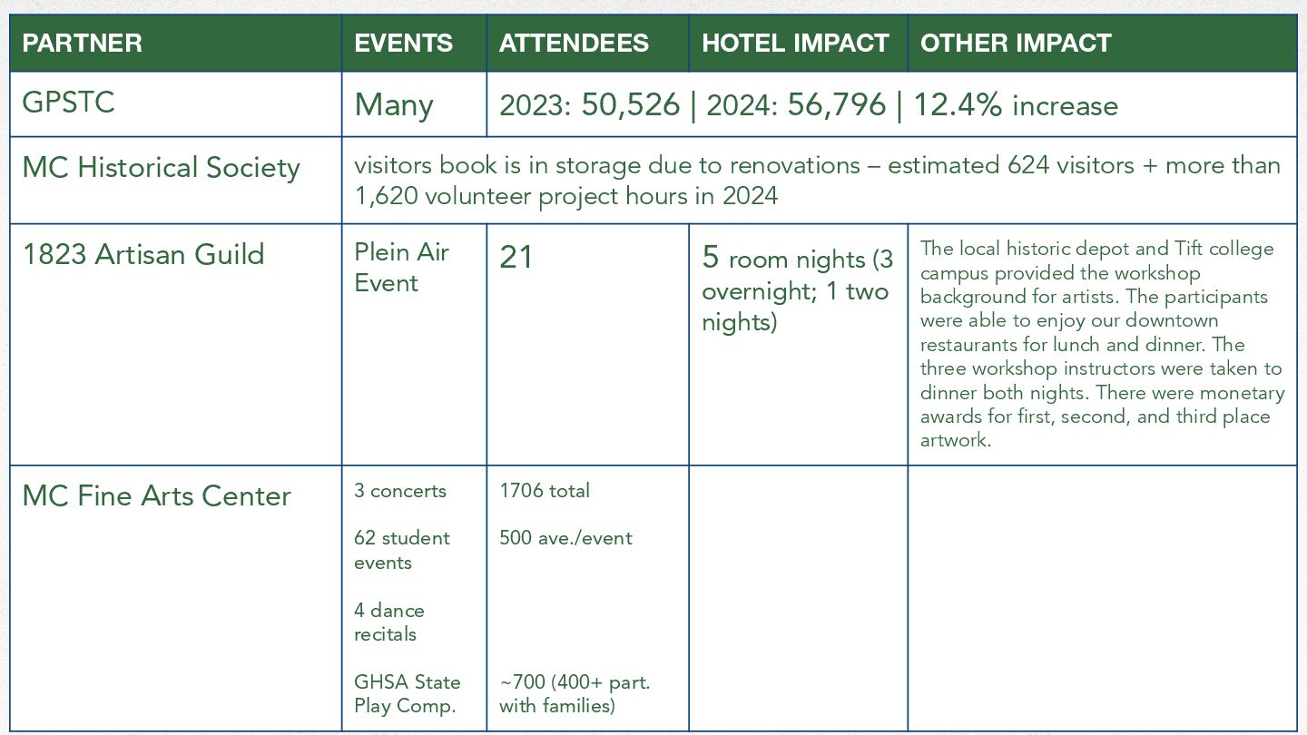 50,526 | 2024: 56,796 | 12.4% increase MC Historical Society visitors book is in storage due to renovations – estimated 624 visitors + more than 1,620 volunteer project hours in 2024 1823 Artisan Guild Plein Air Event 21 5 room nights (3 overnight; 1 two nights) The local historic depot and Tift college campus provided the workshop background for artists. The participants were able to enjoy our downtown restaurants for lunch and dinner. The three workshop instructors were taken to dinner both nights. There were monetary awards for first, second, and third place artwork. MC Fine Arts Center 3 concerts 62 student events 4 dance recitals GHSA State Play Comp. 1706 total 500 ave./event ~700 (400+ part. with families)