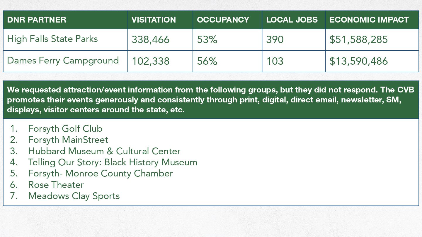 did not respond. The CVB promotes their events generously and consistently through print, digital, direct email, newsletter, SM, displays, visitor centers around the state, etc. 1. Forsyth Golf Club 2. Forsyth MainStreet 3. Hubbard Museum & Cultural Center 4. Telling Our Story: Black History Museum 5. Forsyth- Monroe County Chamber 6. Rose Theater 7. Meadows Clay Sports DNR PARTNER VISITATION OCCUPANCY LOCAL JOBS ECONOMIC IMPACT High Falls State Parks 338,466 53% 390 $51,588,285 Dames Ferry Campground 102,338 56% 103 $13,590,486