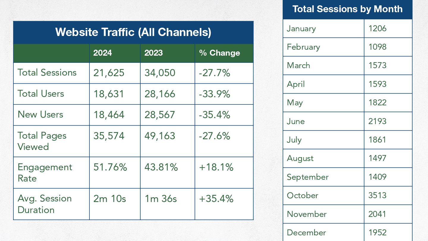 21,625 34,050 -27.7% Total Users 18,631 28,166 -33.9% New Users 18,464 28,567 -35.4% Total Pages Viewed 35,574 49,163 -27.6% Engagement Rate 51.76% 43.81% +18.1% Avg. Session Duration 2m 10s 1m 36s +35.4% Total Sessions by Month January 1206 February 1098 March 1573 April 1593 May 1822 June 2193 July 1861 August 1497 September 1409 October 3513 November 2041 December 1952