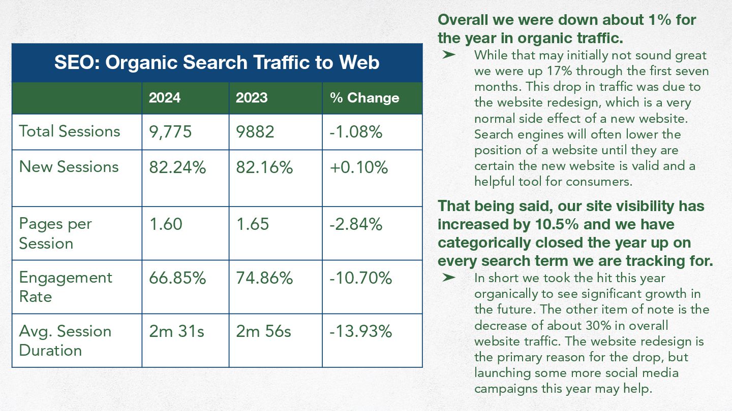 Total Sessions 9,775 9882 -1.08% New Sessions 82.24% 82.16% +0.10% Pages per Session 1.60 1.65 -2.84% Engagement Rate 66.85% 74.86% -10.70% Avg. Session Duration 2m 31s 2m 56s -13.93% Overall we were down about 1% for the year in organic traffic. ➤ While that may initially not sound great we were up 17% through the first seven months. This drop in traffic was due to the website redesign, which is a very normal side effect of a new website. Search engines will often lower the position of a website until they are certain the new website is valid and a helpful tool for consumers. That being said, our site visibility has increased by 10.5% and we have categorically closed the year up on every search term we are tracking for. ➤ In short we took the hit this year organically to see significant growth in the future. The other item of note is the decrease of about 30% in overall website traffic. The website redesign is the primary reason for the drop, but launching some more social media campaigns this year may help.
