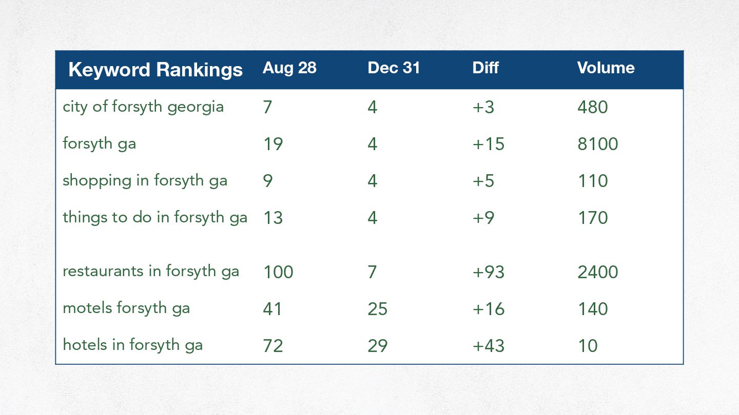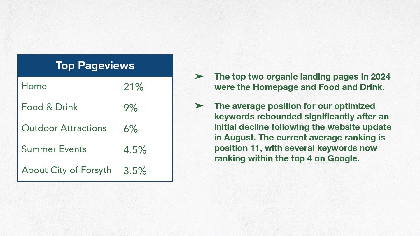 the Homepage and Food and Drink. ➤ The average position for our optimized keywords rebounded significantly after an initial decline following the website update in August. The current average ranking is position 11, with several keywords now ranking within the top 4 on Google. Top Pageviews Home 21% Food & Drink 9% Outdoor Attractions 6% Summer Events 4.5% About City of Forsyth 3.5%