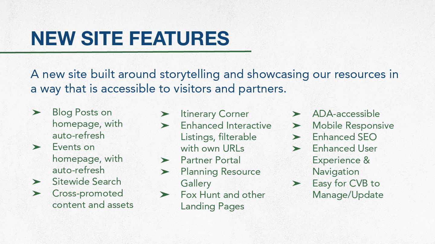 showcasing our resources in a way that is accessible to visitors and partners. ➤ Blog Posts on homepage, with auto-refresh ➤ Events on homepage, with auto-refresh ➤ Sitewide Search ➤ Cross-promoted content and assets ➤ Itinerary Corner ➤ Enhanced Interactive Listings, filterable with own URLs ➤ Partner Portal ➤ Planning Resource Gallery ➤ Fox Hunt and other Landing Pages ➤ ADA-accessible ➤ Mobile Responsive ➤ Enhanced SEO ➤ Enhanced User Experience & Navigation ➤ Easy for CVB to Manage/Update