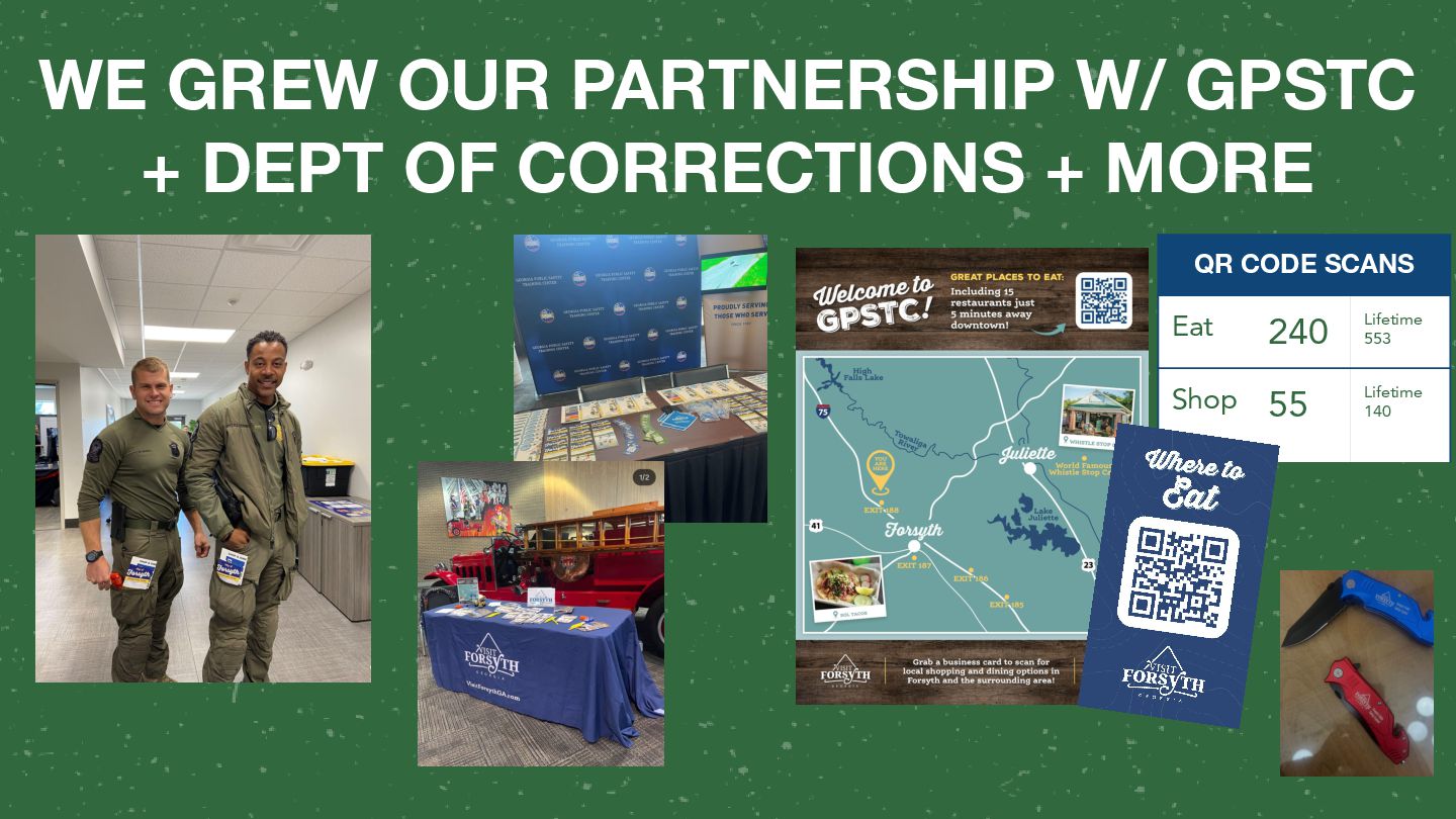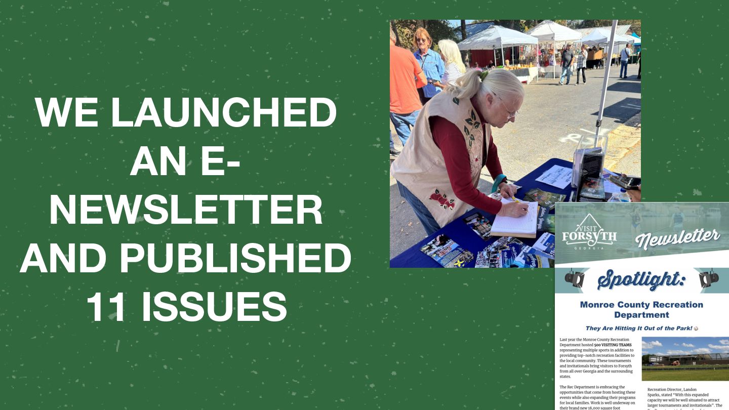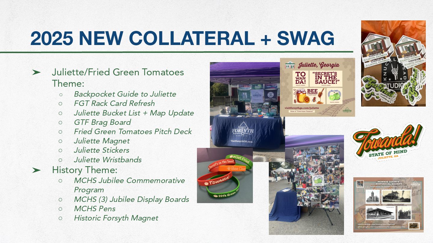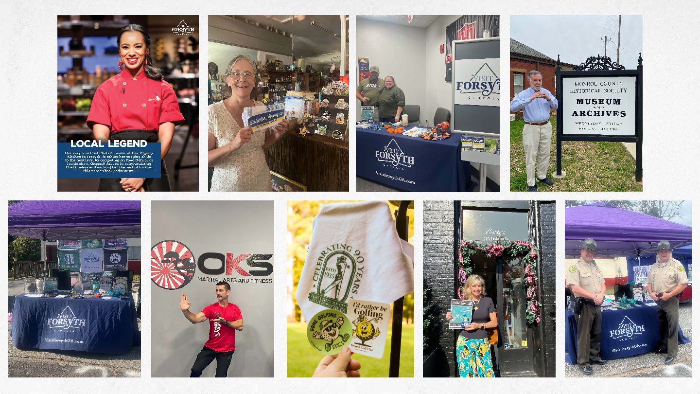other materials promoting Forsyth and its tourism partners in the following places: ➤ Forsyth Welcome Center ➤ 1823 Artisan Guild & Gallery ➤ GPSTC (mult. locations) ➤ Forsyth City Hall ➤ Monroe County Annex lobby ➤ 12 hotel & KOA lobbies ➤ State Regional VICs ◦ Augusta ◦ Columbus ◦ Lavonia ◦ Port Wentworth ◦ Ringgold ◦ St. Mary’s ◦ Tallapoosa ◦ Valdosta ◦ West Point ➤ SWAG bags for groups/events ➤ Chamber office ➤ Industrial Development Authority Office ➤ Whistle Stop Cafe in Juliette ➤ Honeycomb and shops in Juliette ➤ Hello Neighbor packets for newcomers