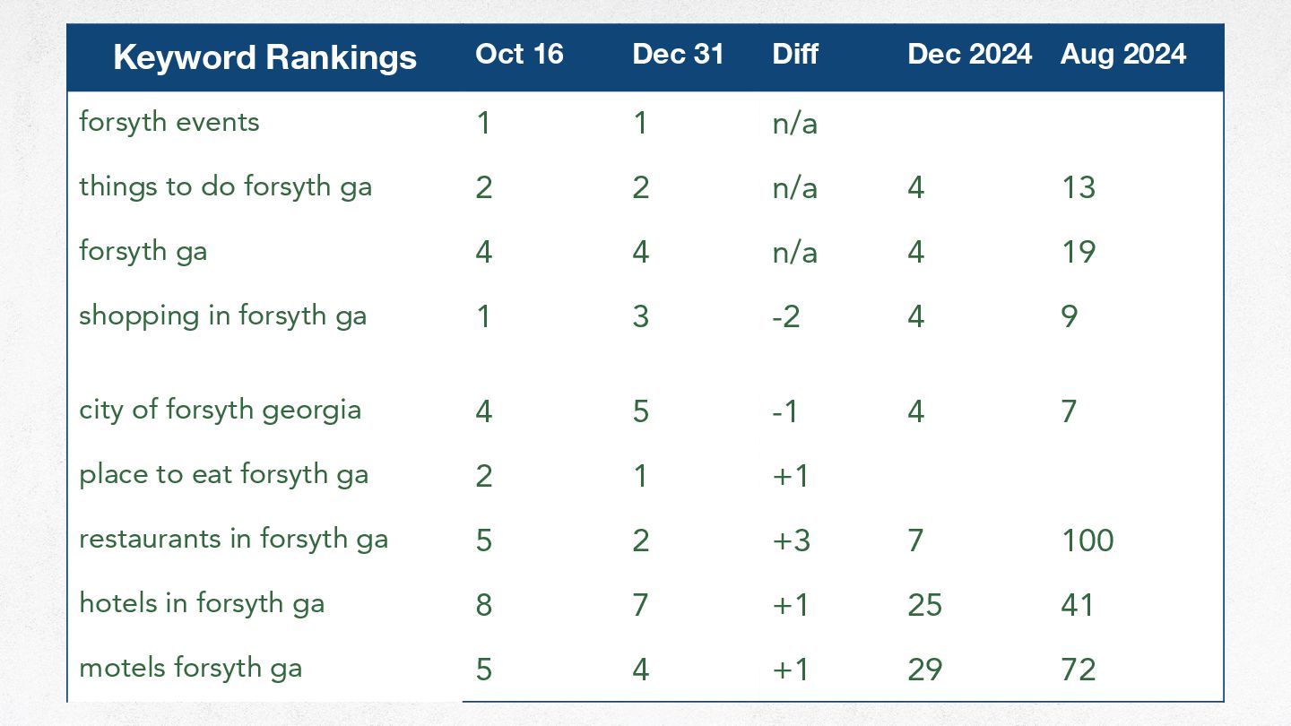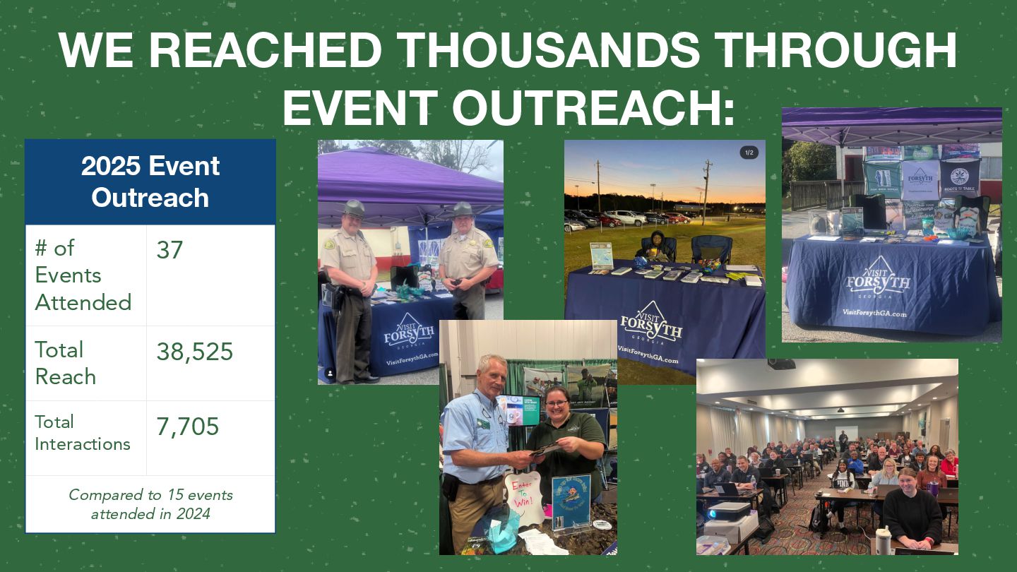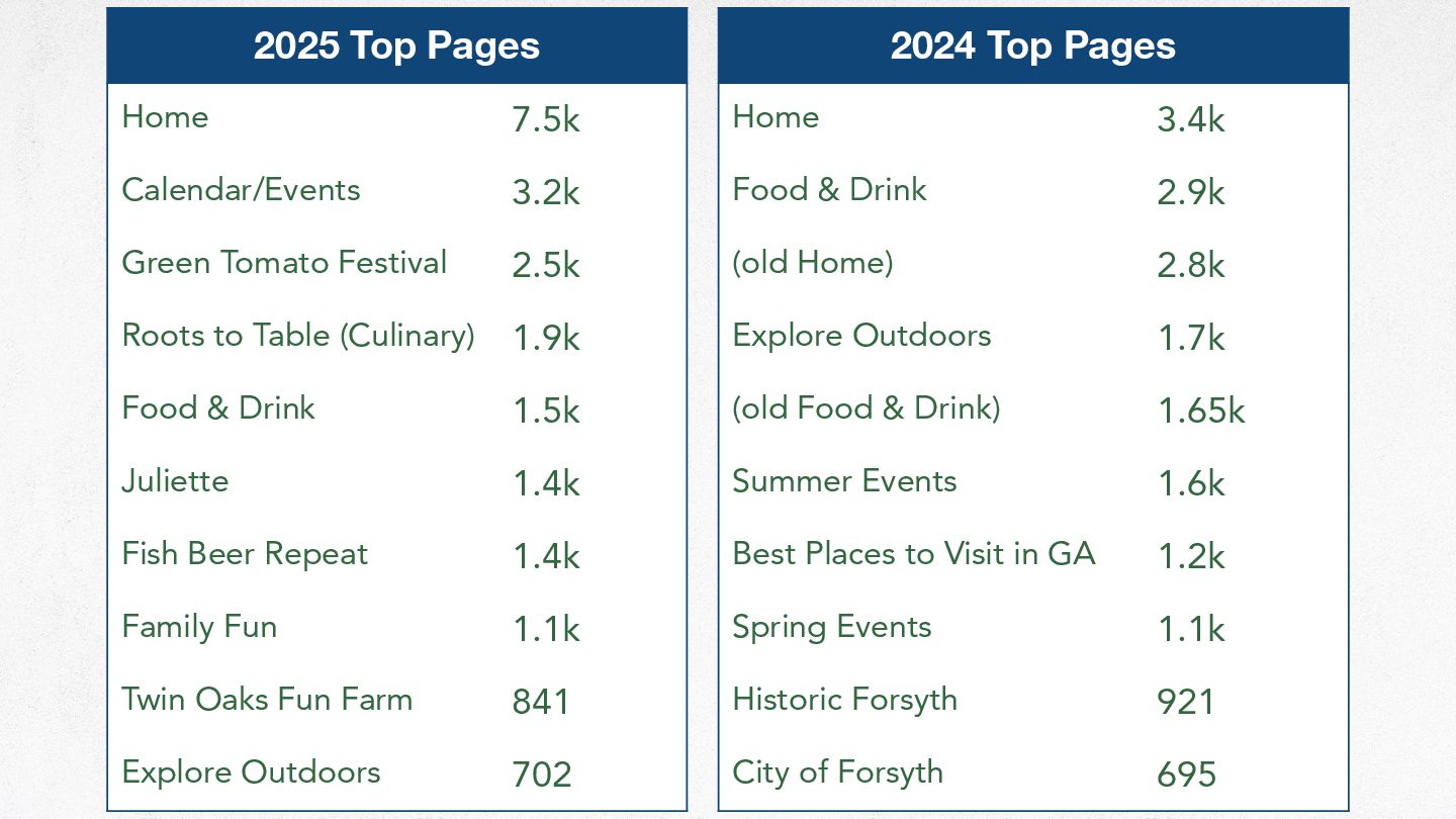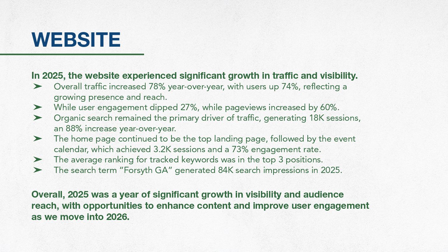 visibility. ➤ Overall traffic increased 78% year-over-year, with users up 74%, reflecting a growing presence and reach. ➤ While user engagement dipped 27%, while pageviews increased by 60%. ➤ Organic search remained the primary driver of traffic, generating 18K sessions, an 88% increase year-over-year. ➤ The home page continued to be the top landing page, followed by the event calendar, which achieved 3.2K sessions and a 73% engagement rate. ➤ The average ranking for tracked keywords was in the top 3 positions. ➤ The search term “Forsyth GA” generated 84K search impressions in 2025. Overall, 2025 was a year of significant growth in visibility and audience reach, with opportunities to enhance content and improve user engagement as we move into 2026. WEBSITE