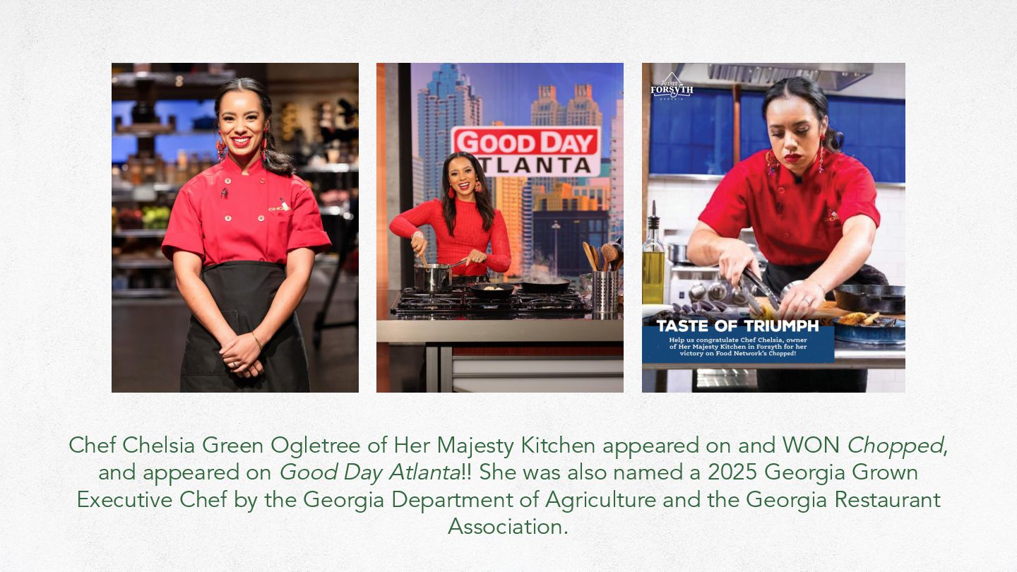 and WON Chopped, and appeared on Good Day Atlanta!! She was also named a 2025 Georgia Grown Executive Chef by the Georgia Department of Agriculture and the Georgia Restaurant Association.