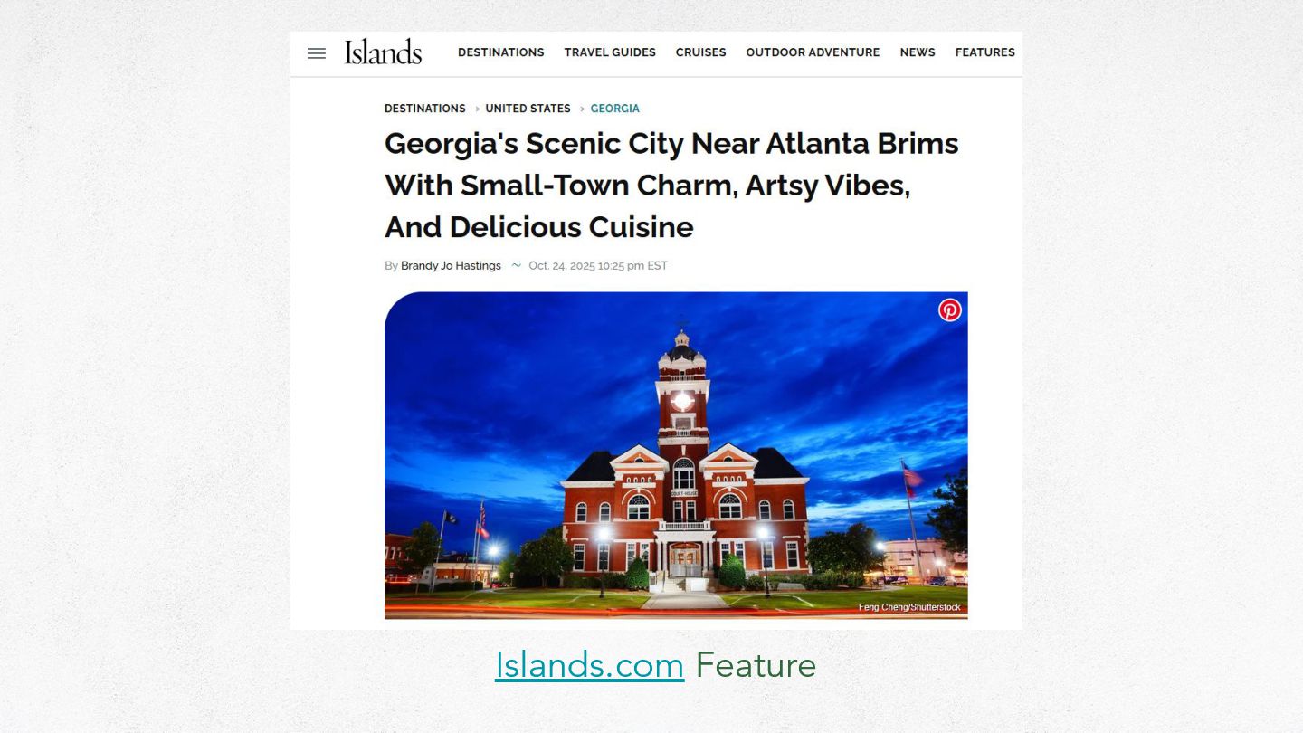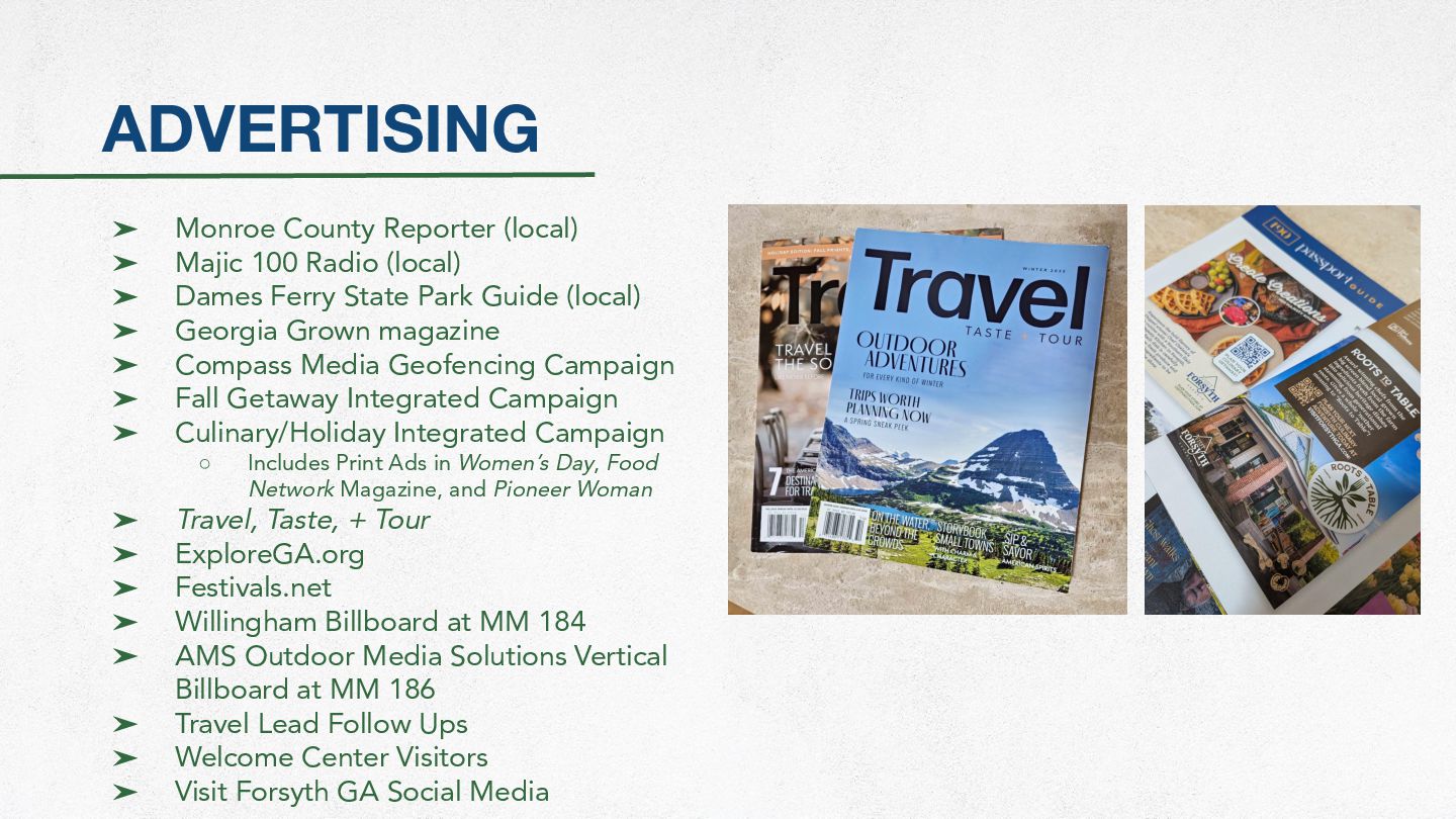 (local) ➤ Dames Ferry State Park Guide (local) ➤ Georgia Grown magazine ➤ Compass Media Geofencing Campaign ➤ Fall Getaway Integrated Campaign ➤ Culinary/Holiday Integrated Campaign ◦ Includes Print Ads in Women’s Day, Food Network Magazine, and Pioneer Woman ➤ Travel, Taste, + Tour ➤ ExploreGA.org ➤ Festivals.net ➤ Willingham Billboard at MM 184 ➤ AMS Outdoor Media Solutions Vertical Billboard at MM 186 ➤ Travel Lead Follow Ups ➤ Welcome Center Visitors ➤ Visit Forsyth GA Social Media