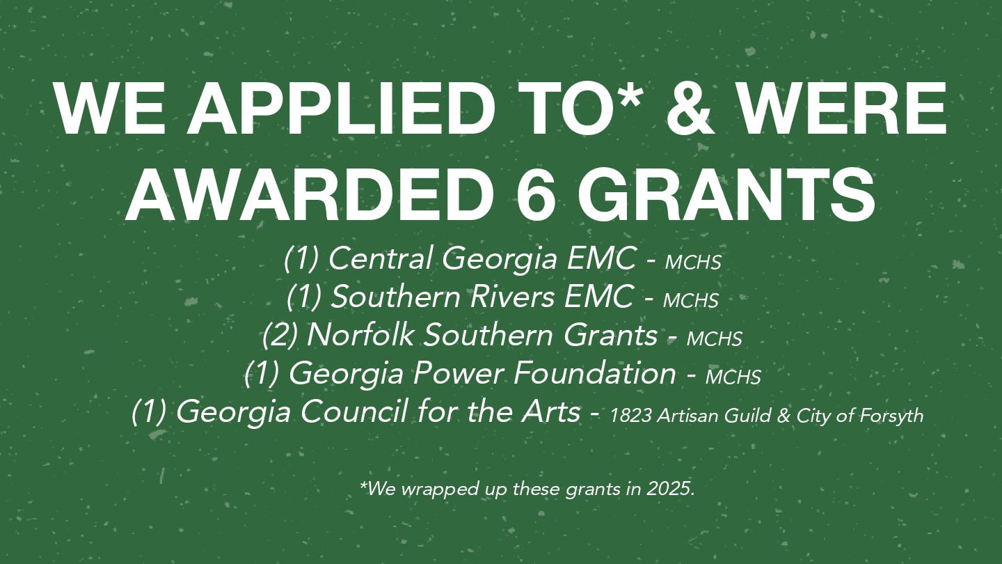 Georgia EMC - MCHS (1) Southern Rivers EMC - MCHS (2) Norfolk Southern Grants - MCHS (1) Georgia Power Foundation - MCHS (1) Georgia Council for the Arts - 1823 Artisan Guild & City of Forsyth *We wrapped up these grants in 2025.