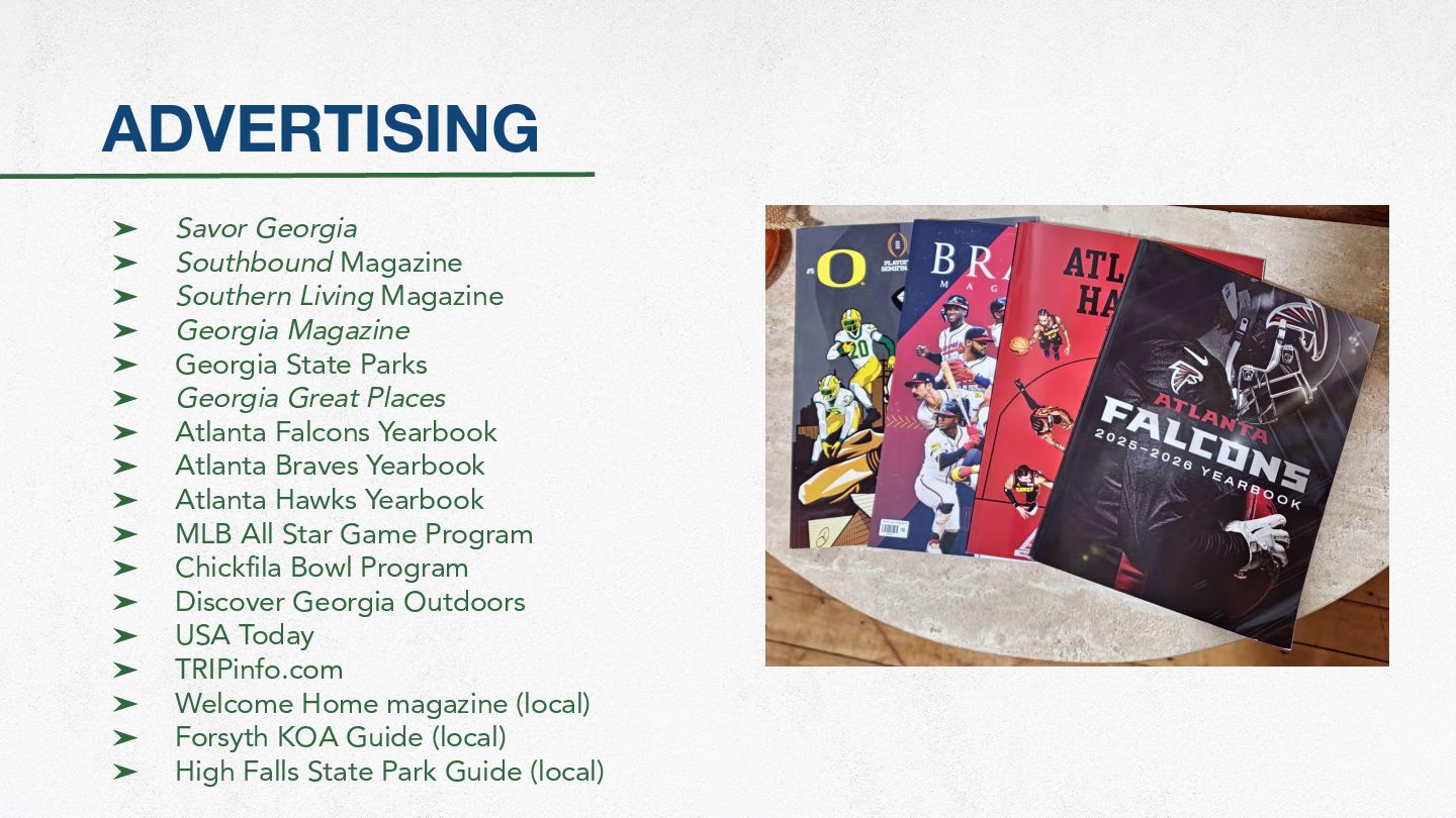 Magazine ➤ Georgia Magazine ➤ Georgia State Parks ➤ Georgia Great Places ➤ Atlanta Falcons Yearbook ➤ Atlanta Braves Yearbook ➤ Atlanta Hawks Yearbook ➤ MLB All Star Game Program ➤ Chickfila Bowl Program ➤ Discover Georgia Outdoors ➤ USA Today ➤ TRIPinfo.com ➤ Welcome Home magazine (local) ➤ Forsyth KOA Guide (local) ➤ High Falls State Park Guide (local)