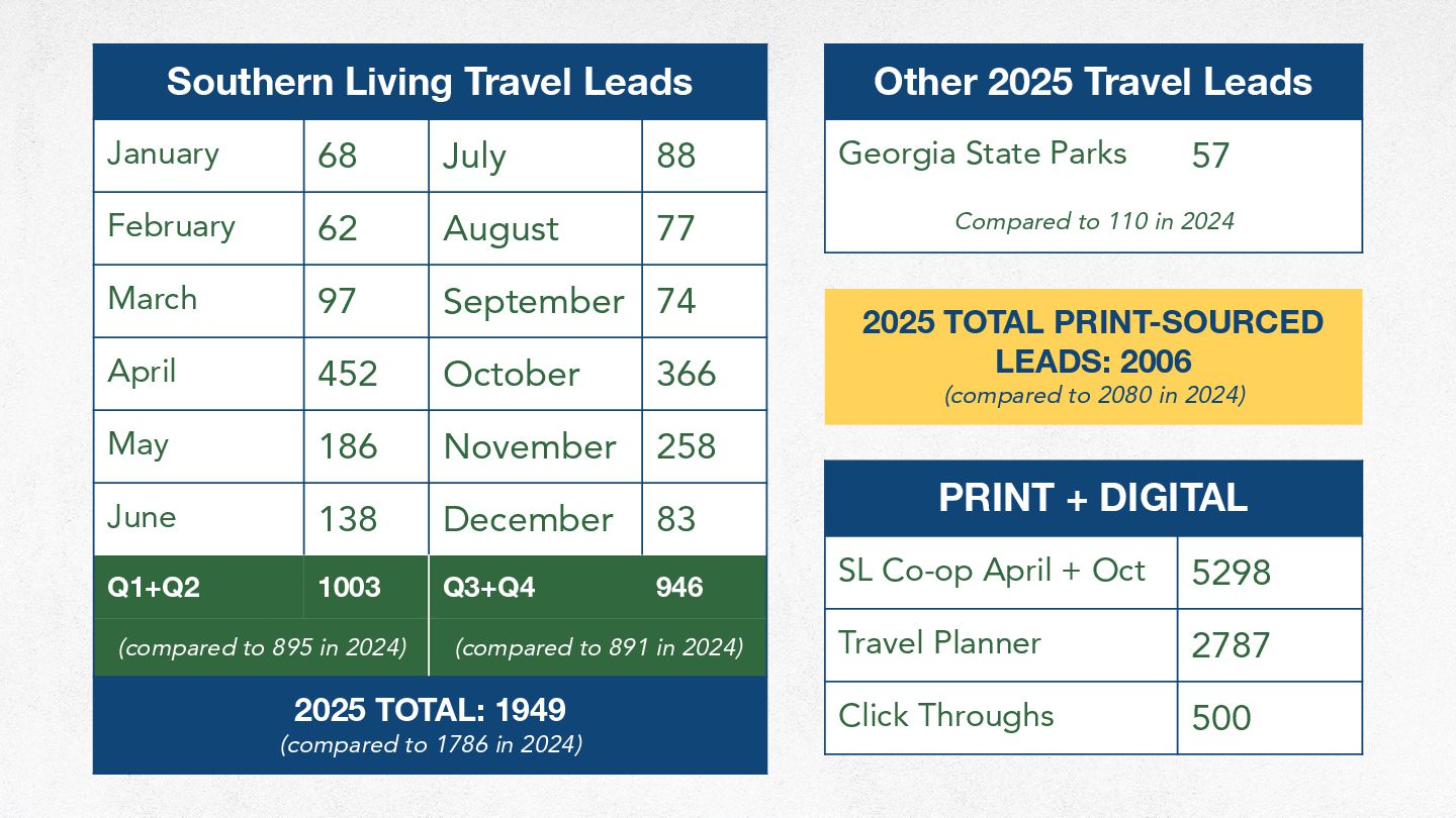 August 77 March 97 September 74 April 452 October 366 May 186 November 258 June 138 December 83 Q1+Q2 1003 Q3+Q4 946 (compared to 895 in 2024) (compared to 891 in 2024) 2025 TOTAL: 1949 (compared to 1786 in 2024) Other 2025 Travel Leads Georgia State Parks 57 Compared to 110 in 2024 2025 TOTAL PRINT-SOURCED LEADS: 2006 (compared to 2080 in 2024) PRINT + DIGITAL SL Co-op April + Oct 5298 Travel Planner 2787 Click Throughs 500