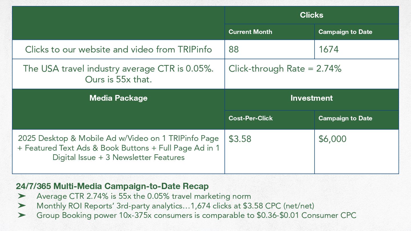 the 0.05% travel marketing norm ➤ Monthly ROI Reports’ 3rd-party analytics…1,674 clicks at $3.58 CPC (net/net) ➤ Group Booking power 10x-375x consumers is comparable to $0.36-$0.01 Consumer CPC Clicks Current Month Campaign to Date Clicks to our website and video from TRIPinfo 88 1674 The USA travel industry average CTR is 0.05%. Ours is 55x that. Click-through Rate = 2.74% Media Package Investment Cost-Per-Click Campaign to Date 2025 Desktop & Mobile Ad w/Video on 1 TRIPinfo Page + Featured Text Ads & Book Buttons + Full Page Ad in 1 Digital Issue + 3 Newsletter Features $3.58 $6,000