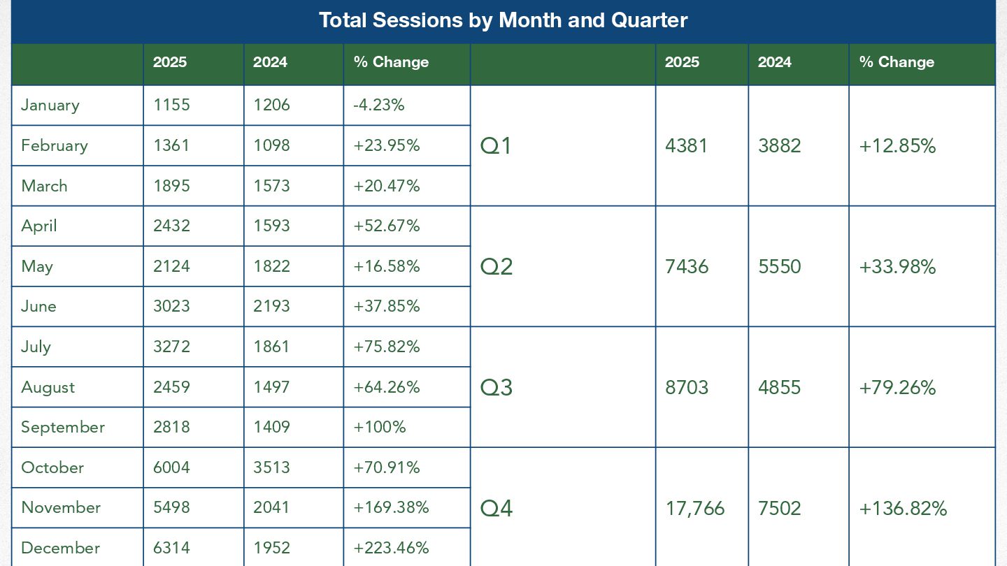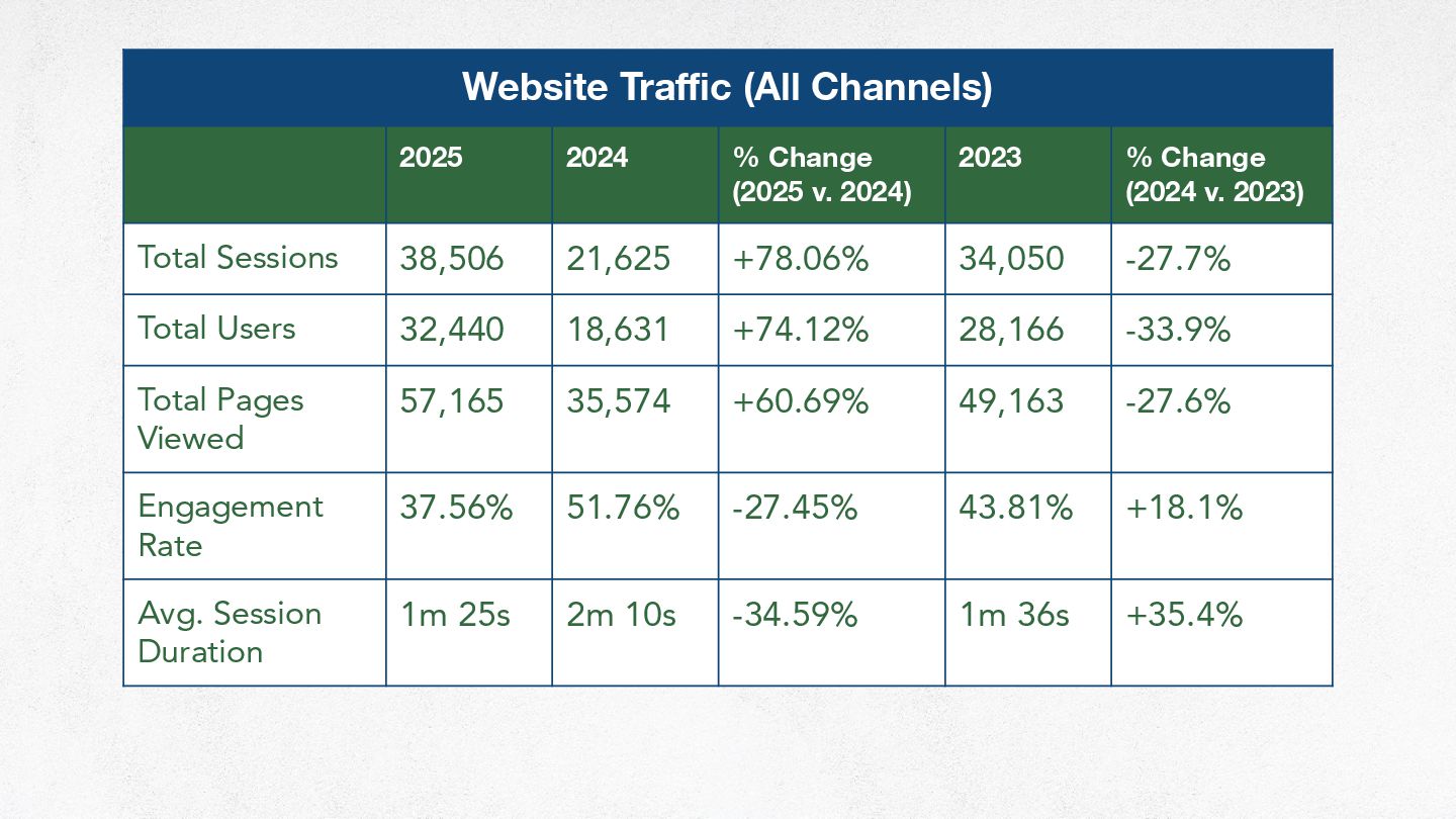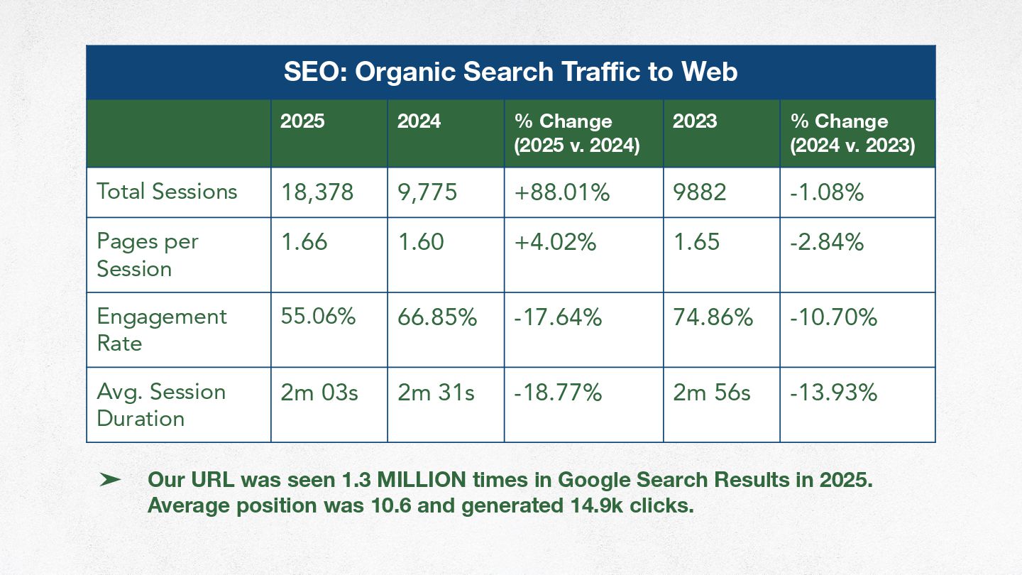 (2025 v. 2024) 2023 % Change (2024 v. 2023) Total Sessions 18,378 9,775 +88.01% 9882 -1.08% Pages per Session 1.66 1.60 +4.02% 1.65 -2.84% Engagement Rate 55.06% 66.85% -17.64% 74.86% -10.70% Avg. Session Duration 2m 03s 2m 31s -18.77% 2m 56s -13.93% ➤ Our URL was seen 1.3 MILLION times in Google Search Results in 2025. Average position was 10.6 and generated 14.9k clicks.
