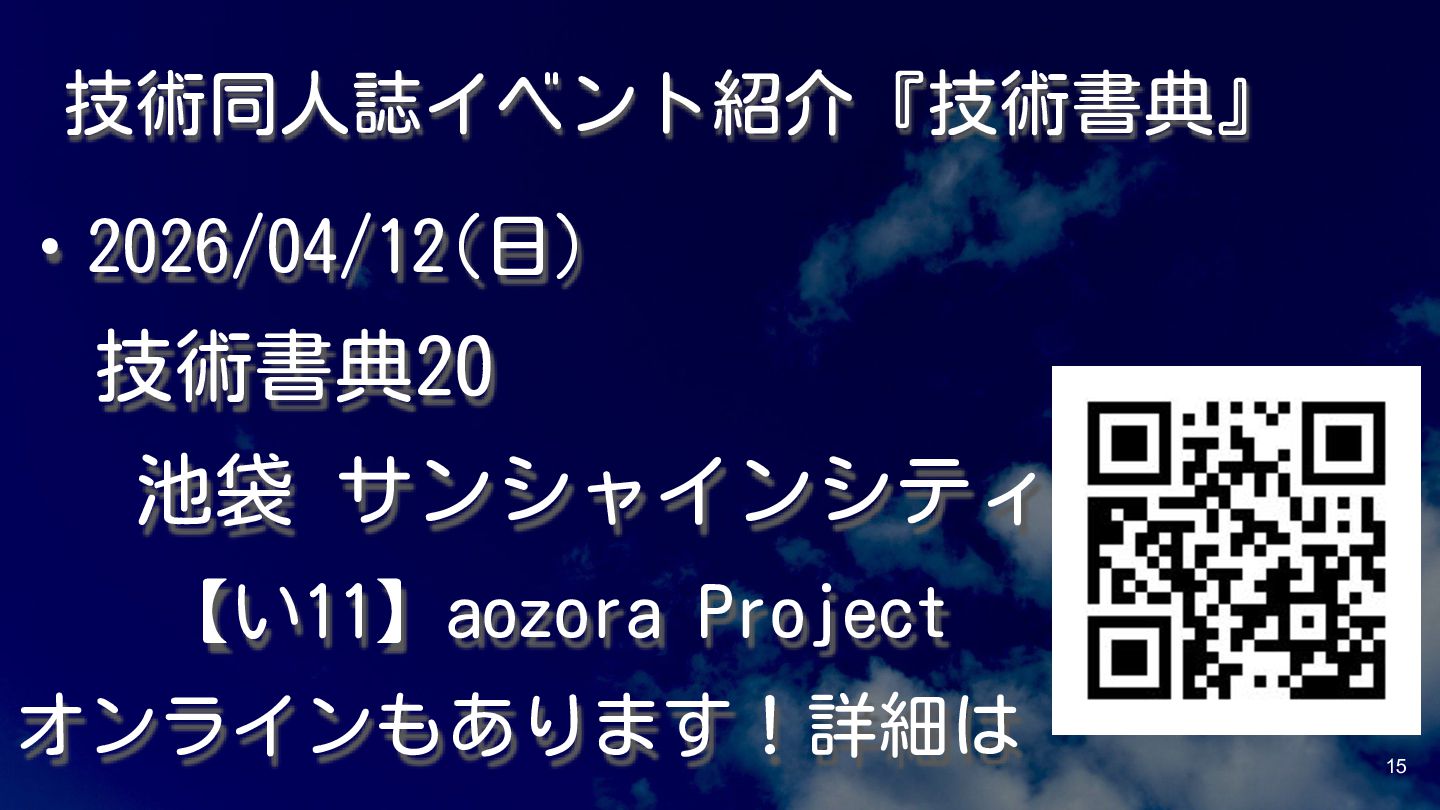 技術同人誌イベント紹介『技術書典』 15 ・2026/04/12(日) 技術書典20 池袋 サンシャインシティ 【い11】aozora Project オンラインもあります!詳細は