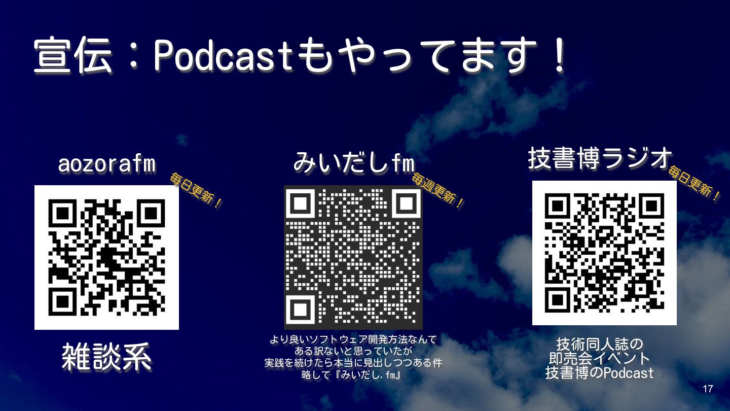 宣伝:Podcastもやってます! 17 技書博ラジオ みいだしfm より良いソフトウェア開発方法なんて ある訳ないと思っていたが 実践を続けたら本当に見出しつつある件 略して『みいだし.fm』 技術同人誌の 即売会イベント
