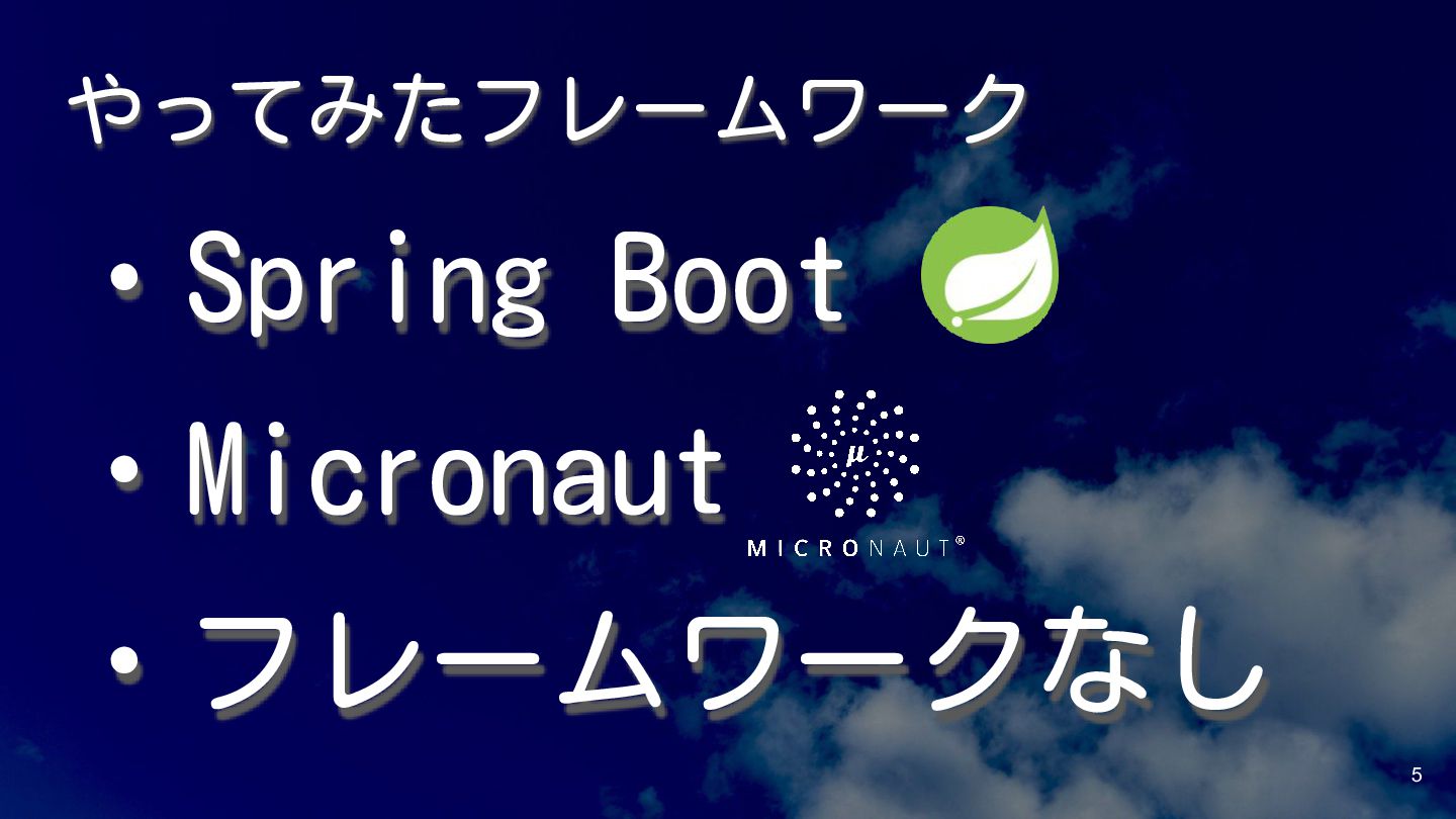 やってみたフレームワーク 5 ・Spring Boot ・Micronaut ・フレームワークなし