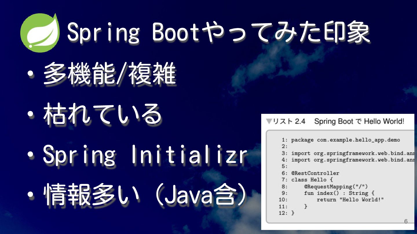 Spring Bootやってみた印象 6 ・多機能/複雑 ・枯れている ・Spring Initializr ・情報多い(Java含)