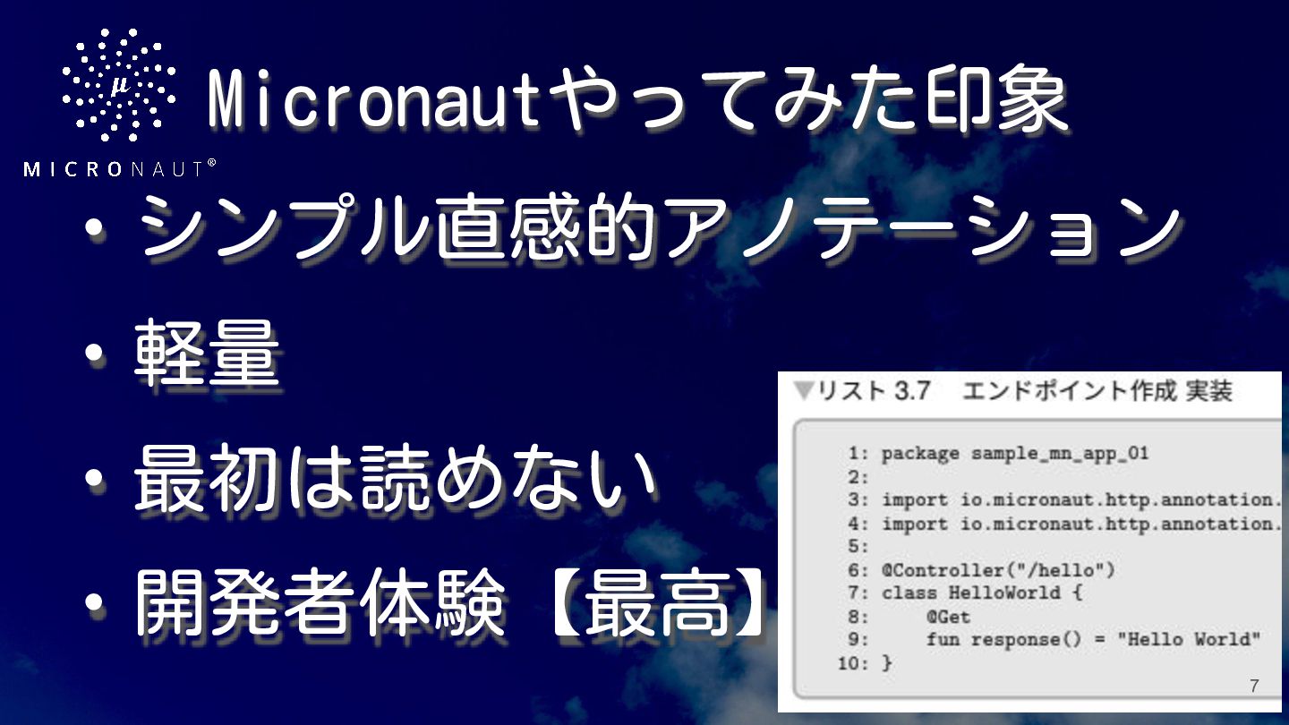 Micronautやってみた印象 7 ・シンプル直感的アノテーション ・軽量 ・最初は読めない ・開発者体験【最高】