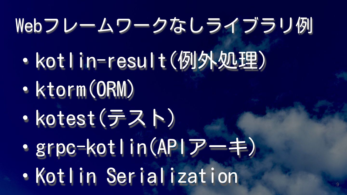Webフレームワークなしライブラリ例 9 ・kotlin-result(例外処理) ・ktorm(ORM) ・kotest(テスト) ・grpc-kotlin(APIアーキ) ・Kotlin Serialization