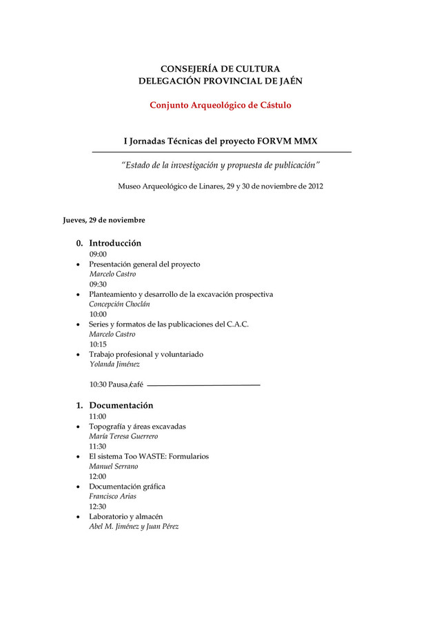 Cástulo I Jornadas Técnicas del proyecto FORVM MMX “Estado de la investigación y propuesta de publicación” Museo Arqueológico de Linares, 29 y 30 de noviembre de 2012 Jueves, 29 de noviembre 0. Introducción 09:00 Presentación general del proyecto Marcelo Castro 09:30 Planteamiento y desarrollo de la excavación prospectiva Concepción Choclán 10:00 Series y formatos de las publicaciones del C.A.C. Marcelo Castro 10:15 Trabajo profesional y voluntariado Yolanda Jiménez 10:30 Pausa/café 1. Documentación 11:00 Topografía y áreas excavadas María Teresa Guerrero 11:30 El sistema Too WASTE: Formularios Manuel Serrano 12:00 Documentación gráfica Francisco Arias 12:30 Laboratorio y almacén Abel M. Jiménez y Juan Pérez