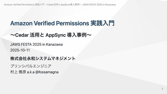 2025 in Kanazawa 2025-10-11 株式会社永和システムマネジメント プリンシパルエンジニア 村上 雅彦 a.k.a @fossamagna Amazon Verified Permissions 実践入門 〜Cedar活用とAppSync導入事例〜 JAWS FESTA 2025 in Kanazawa 1