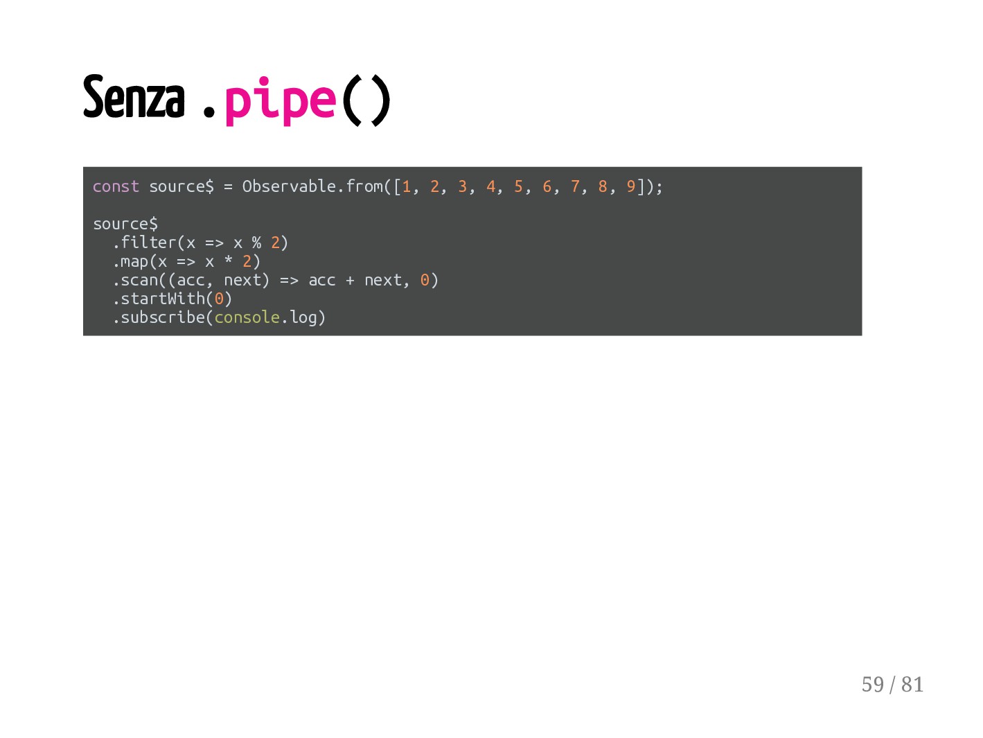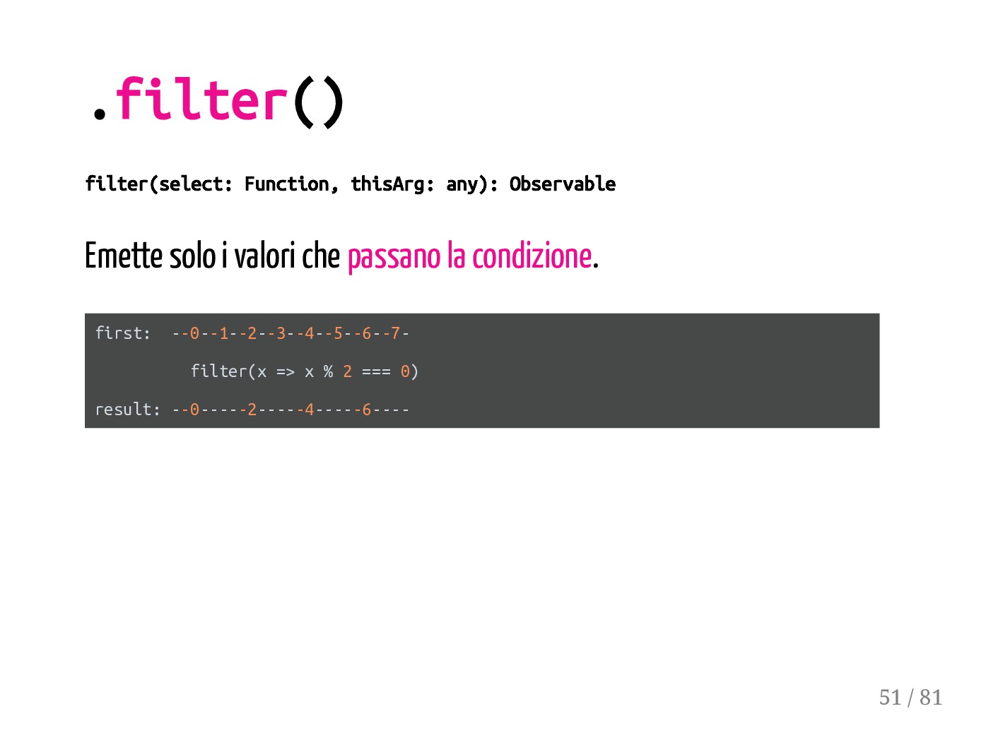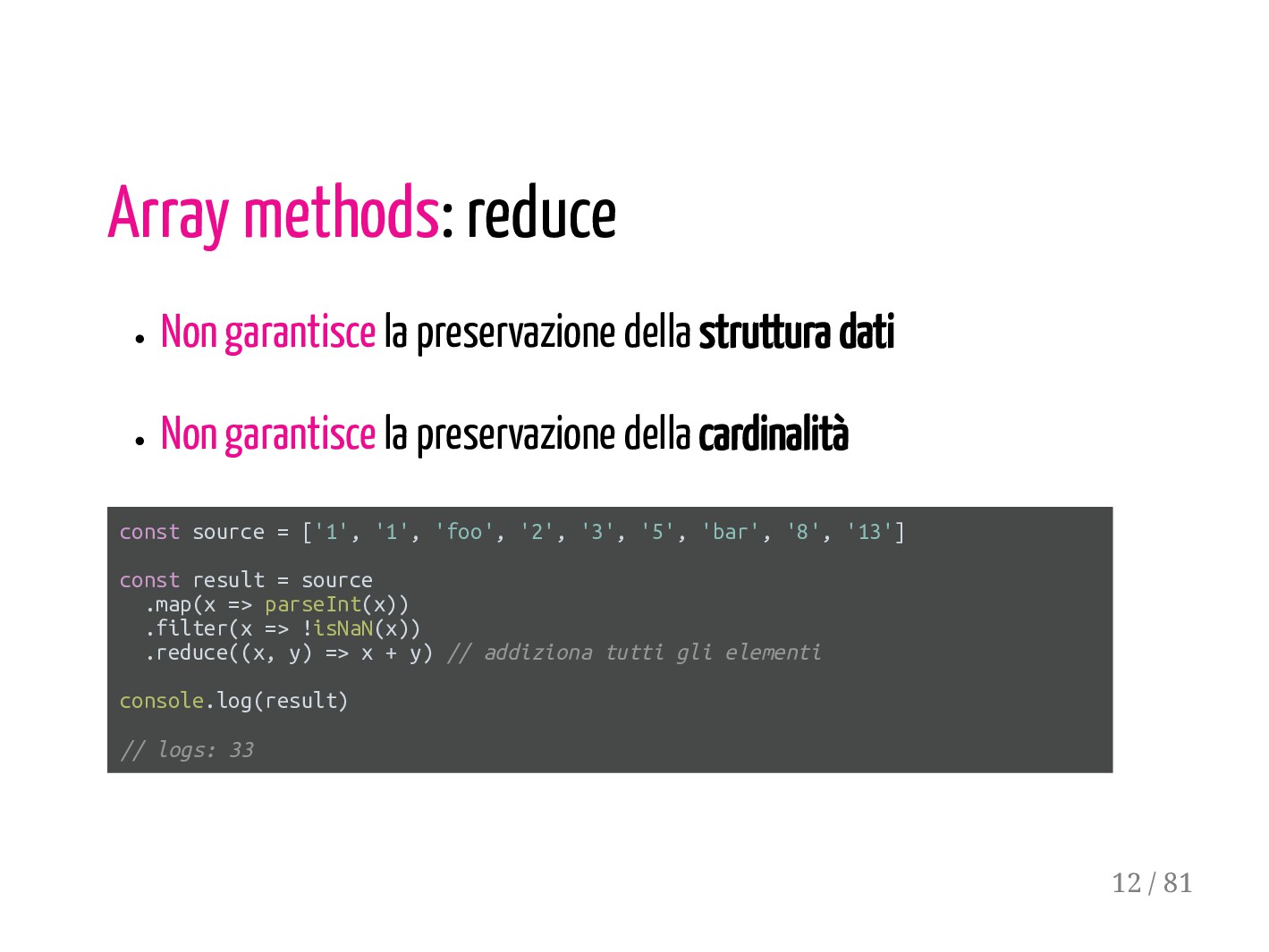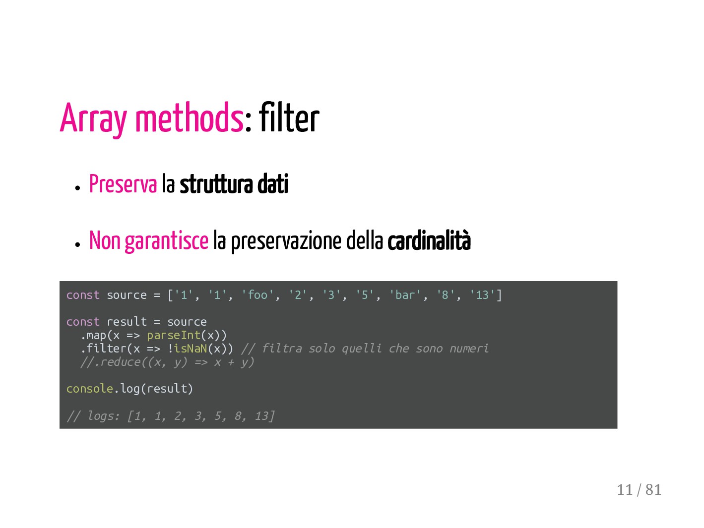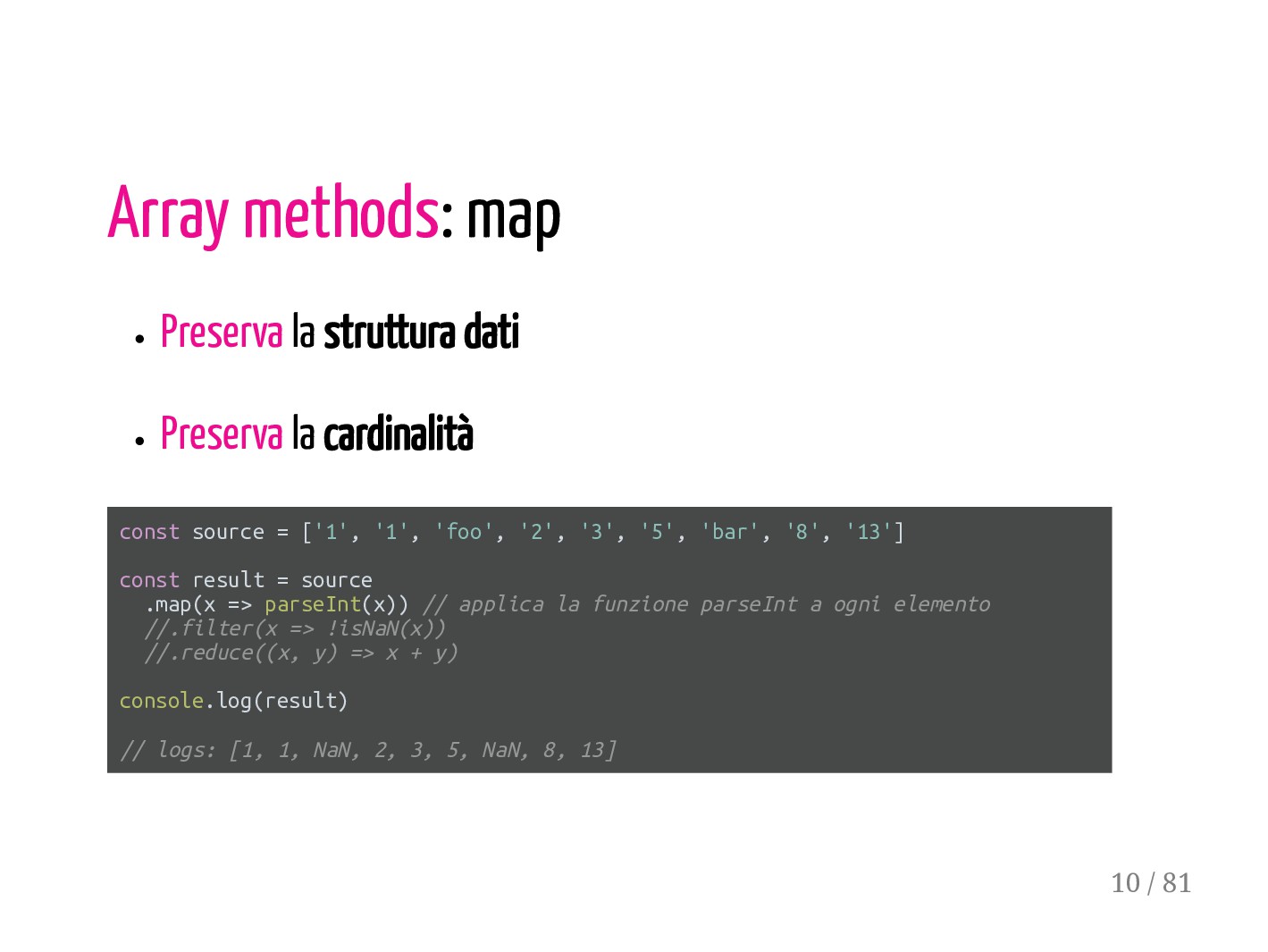 const source = ['1', '1', 'foo', '2', '3', '5', 'bar', '8', '13'] const result = source .map(x => parseInt(x)) // applica la funzione parseInt a ogni elemento //.filter(x => !isNaN(x)) //.reduce((x, y) => x + y) console.log(result) // logs: [1, 1, NaN, 2, 3, 5, NaN, 8, 13] 10 / 81